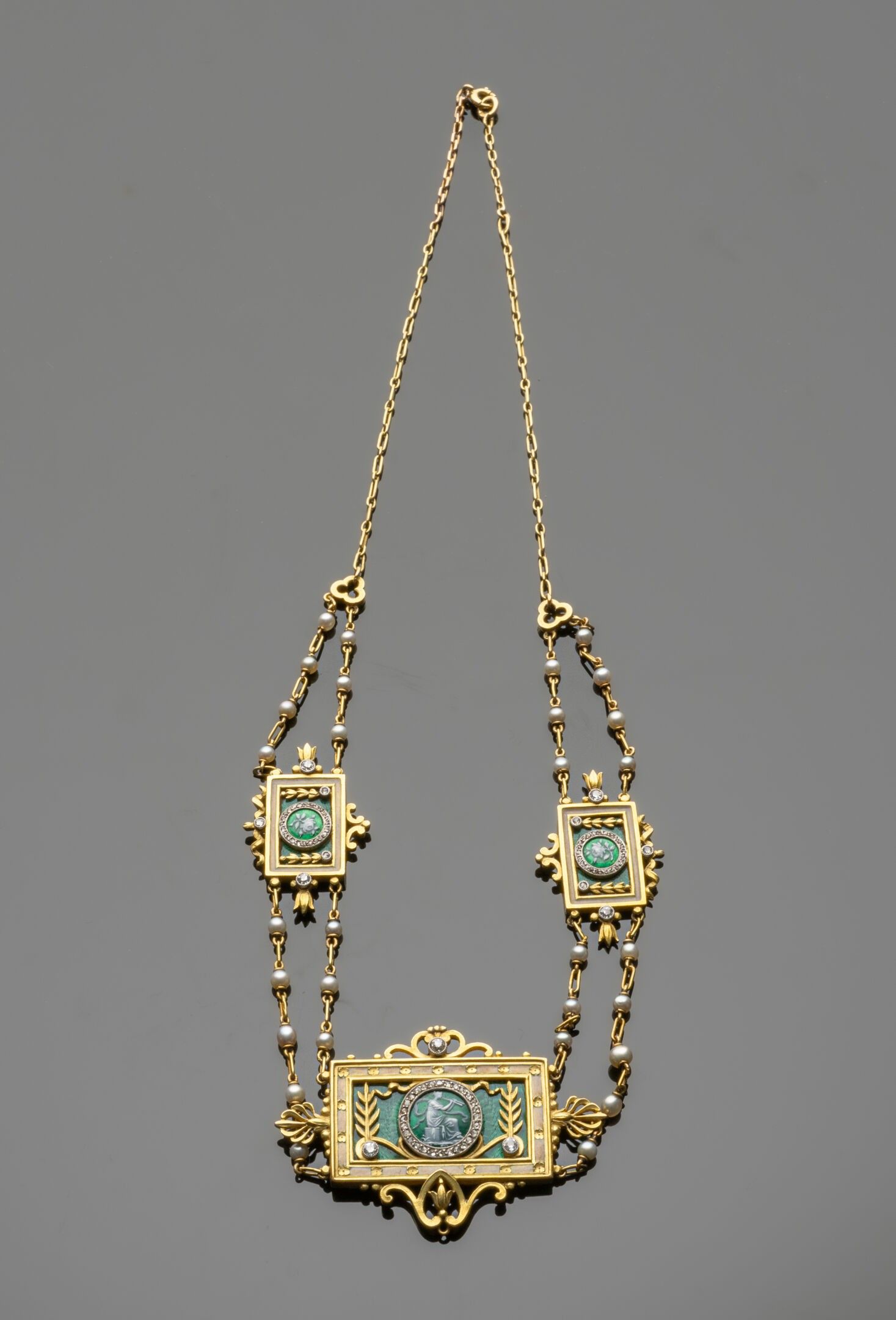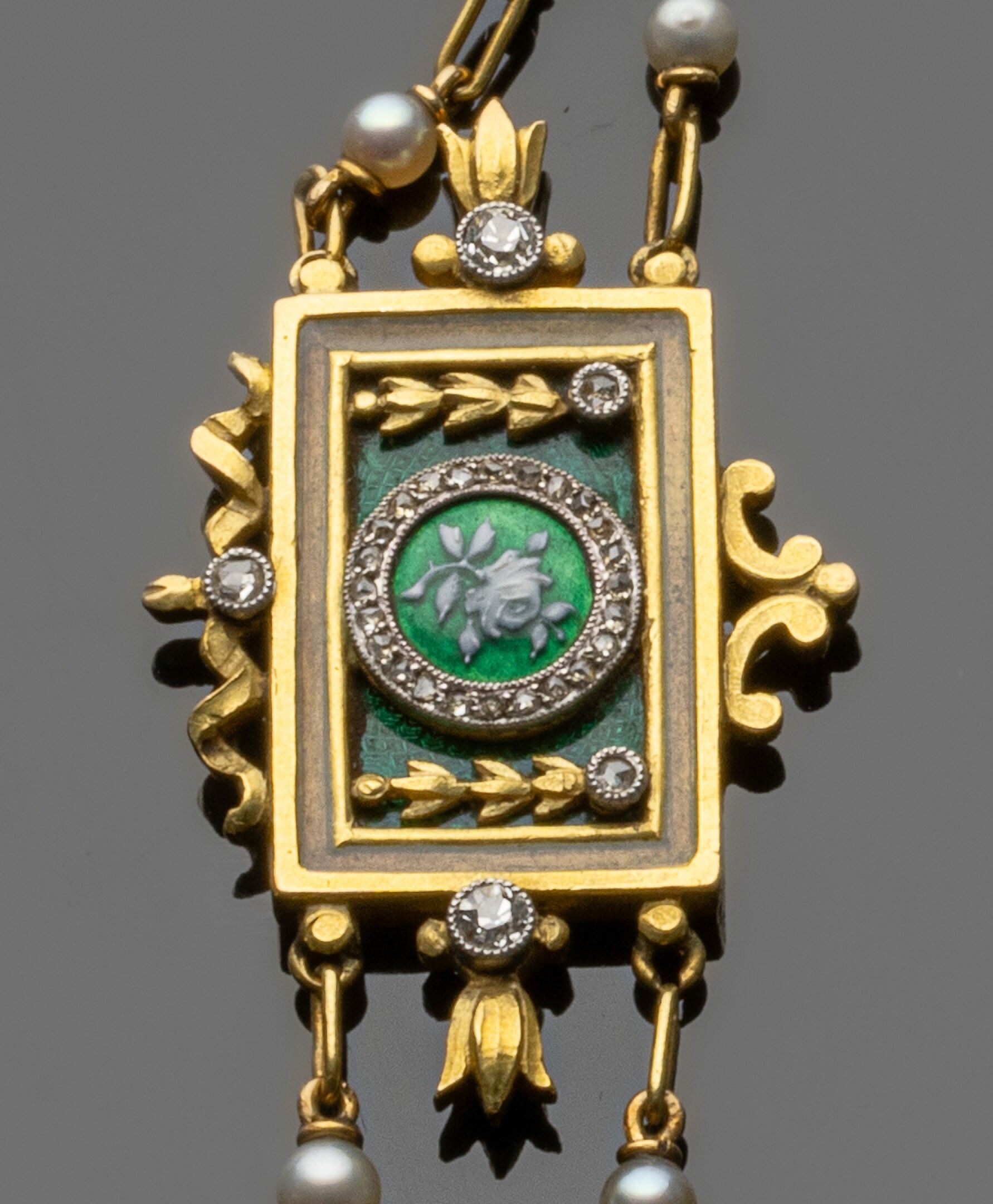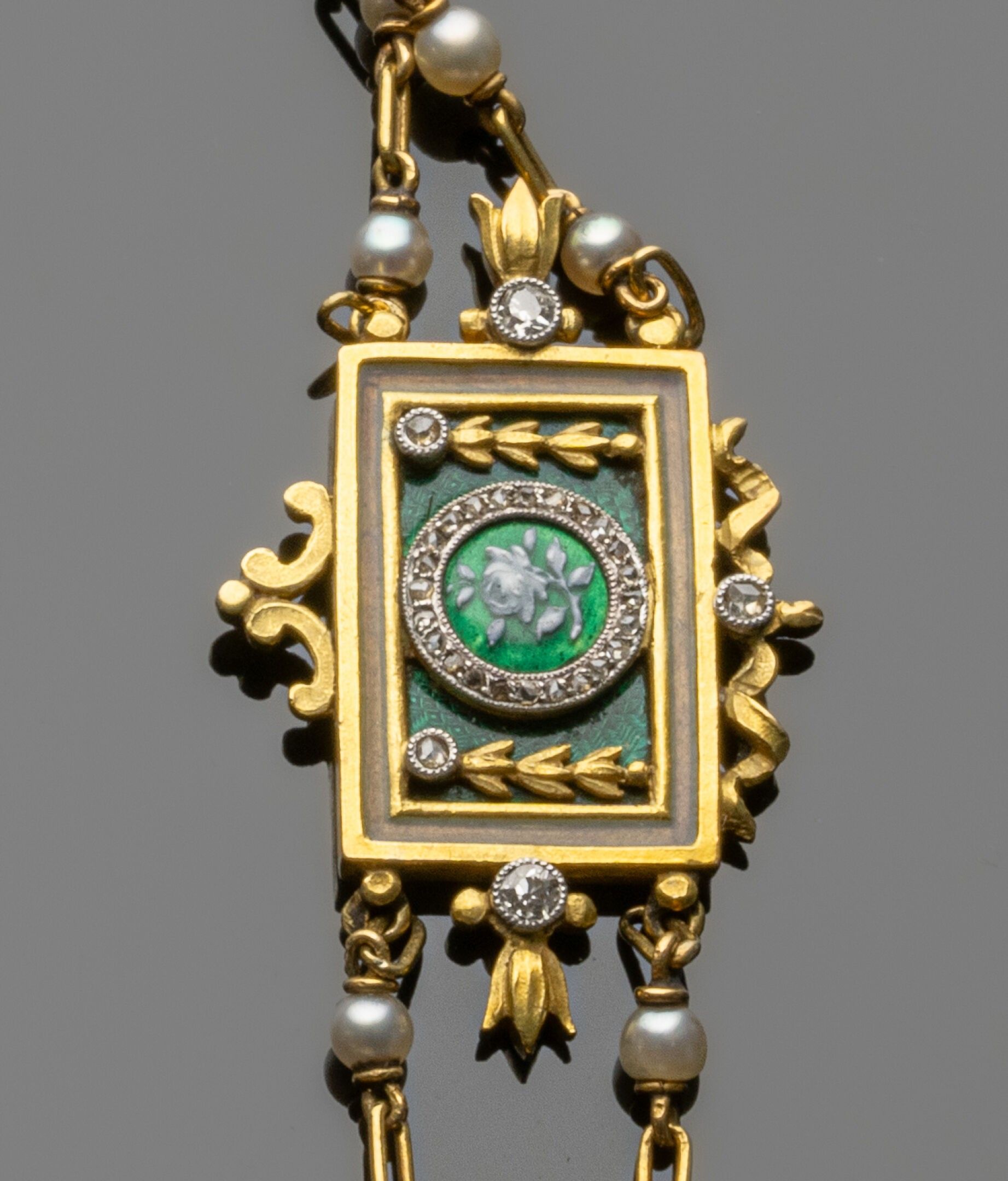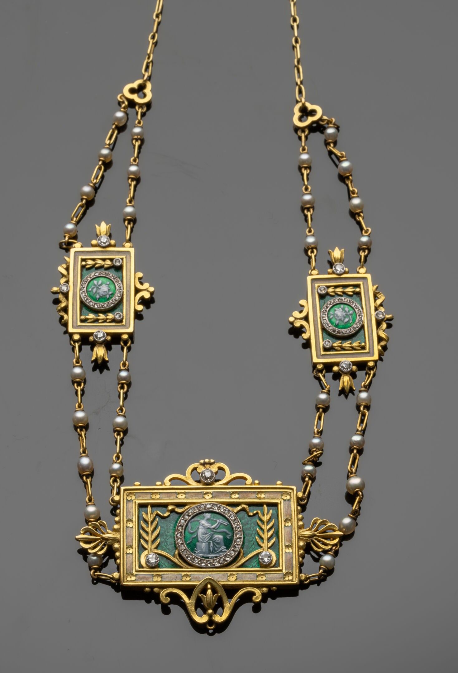 Necklace in 18K (750°/°°) yellow gold with oval mesh and cartouche, the central part with double rows, alternating with probably fine pearls; is embellished with three rectangular motifs (the larger central one removable by screw system), decorated with scrolls, palms and florets, set with rose-cut and old-cut diamonds as well as roses on stems and an antique-style aulos player enamelled green and white on a green enamel background over guilloché.