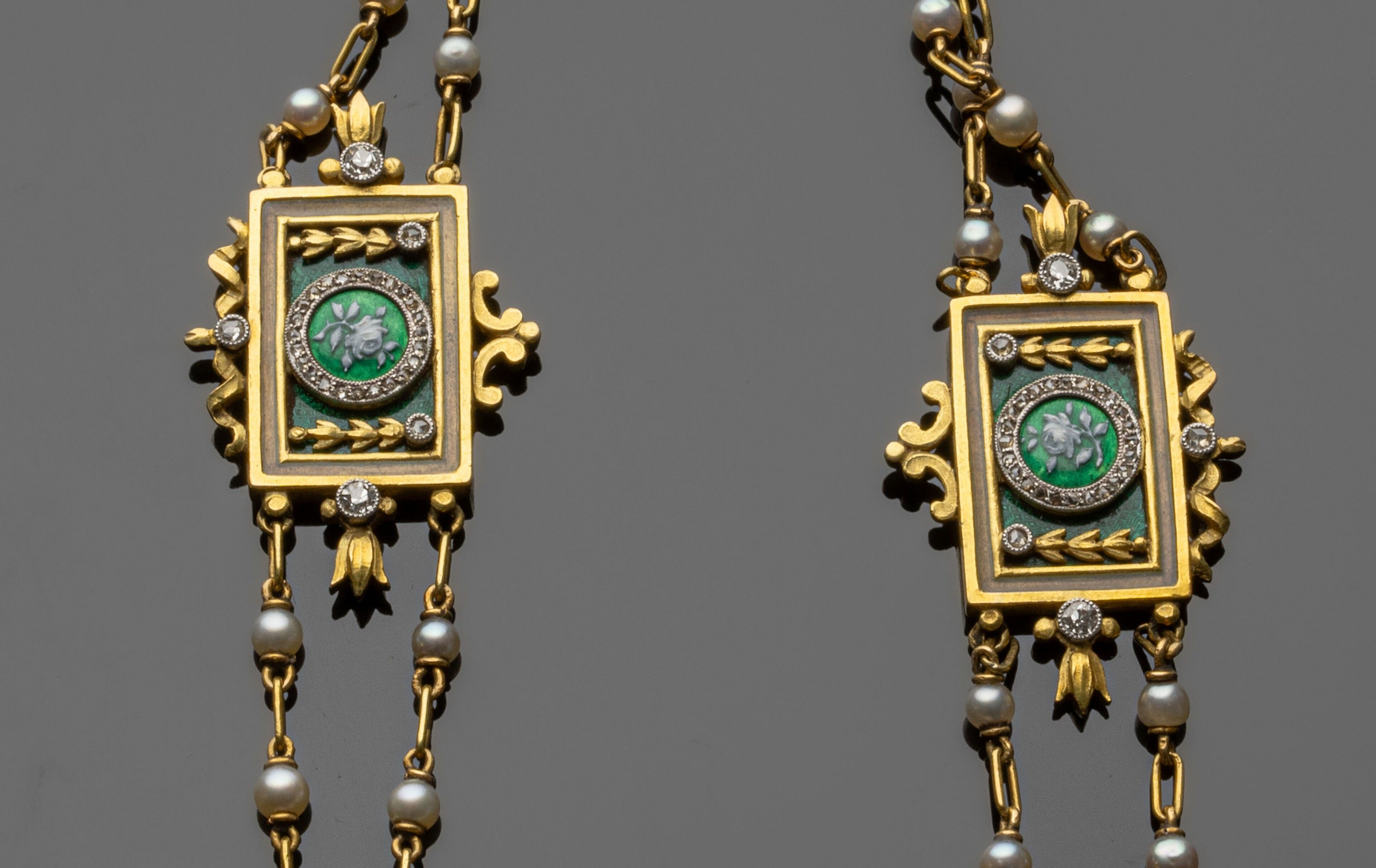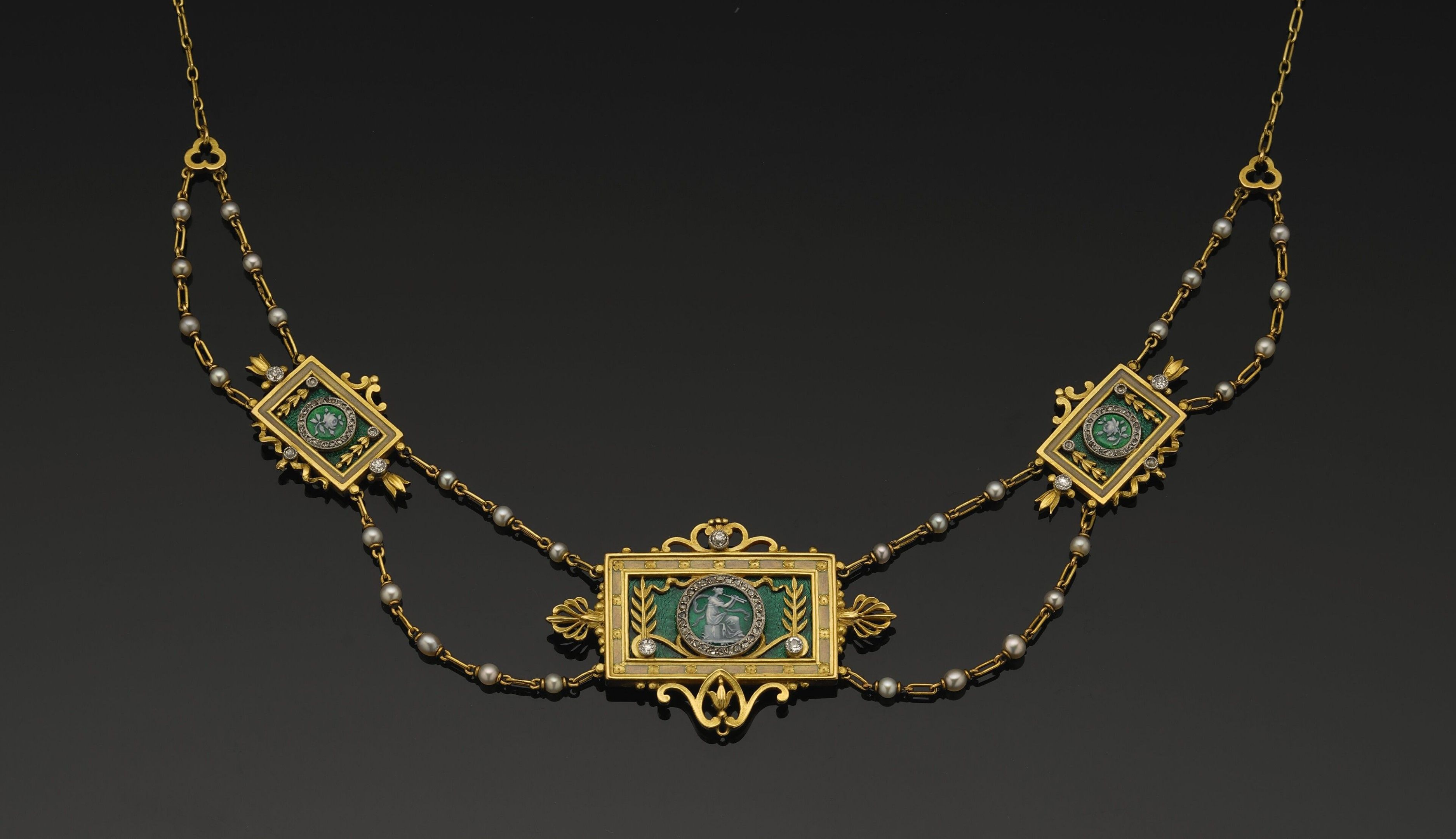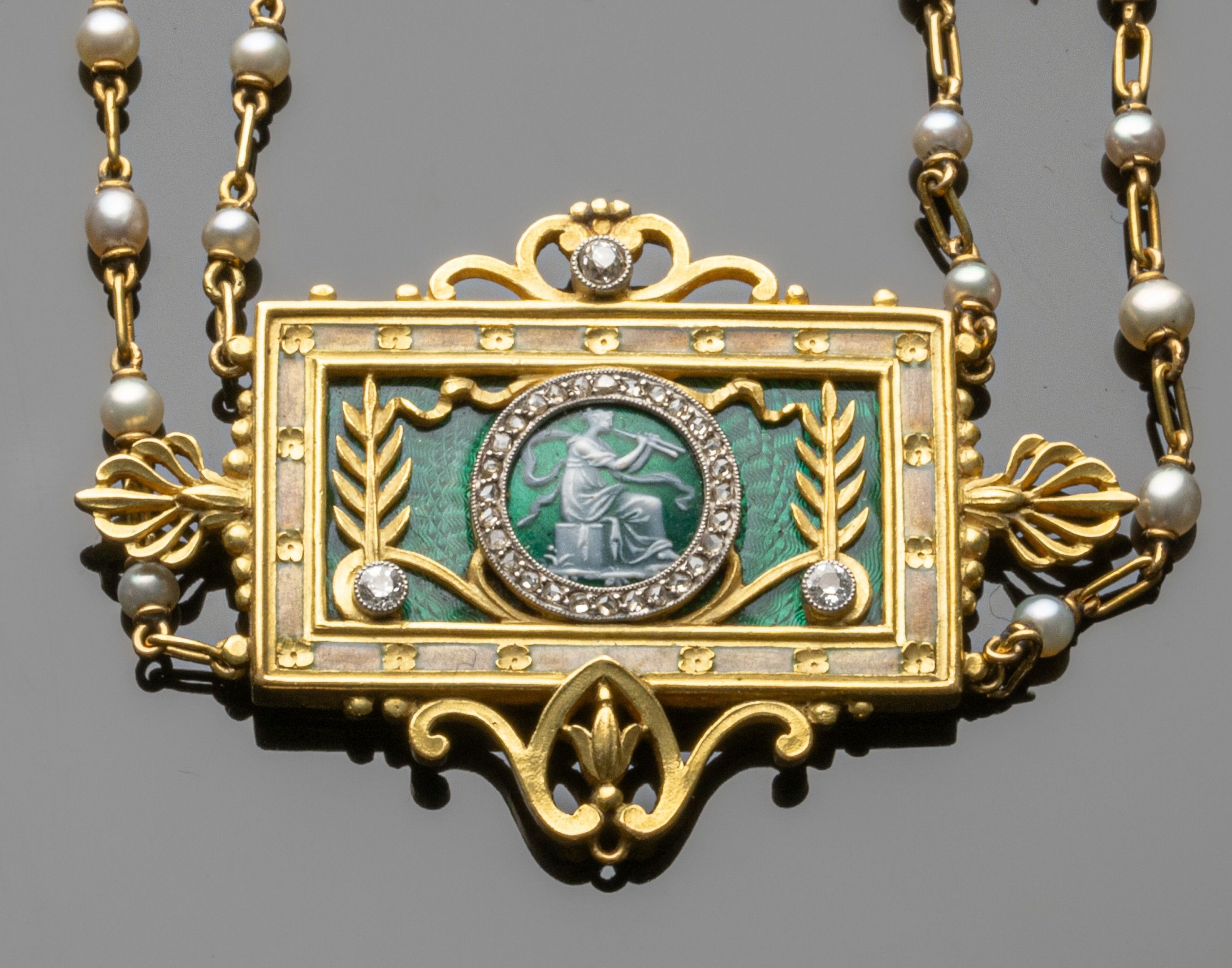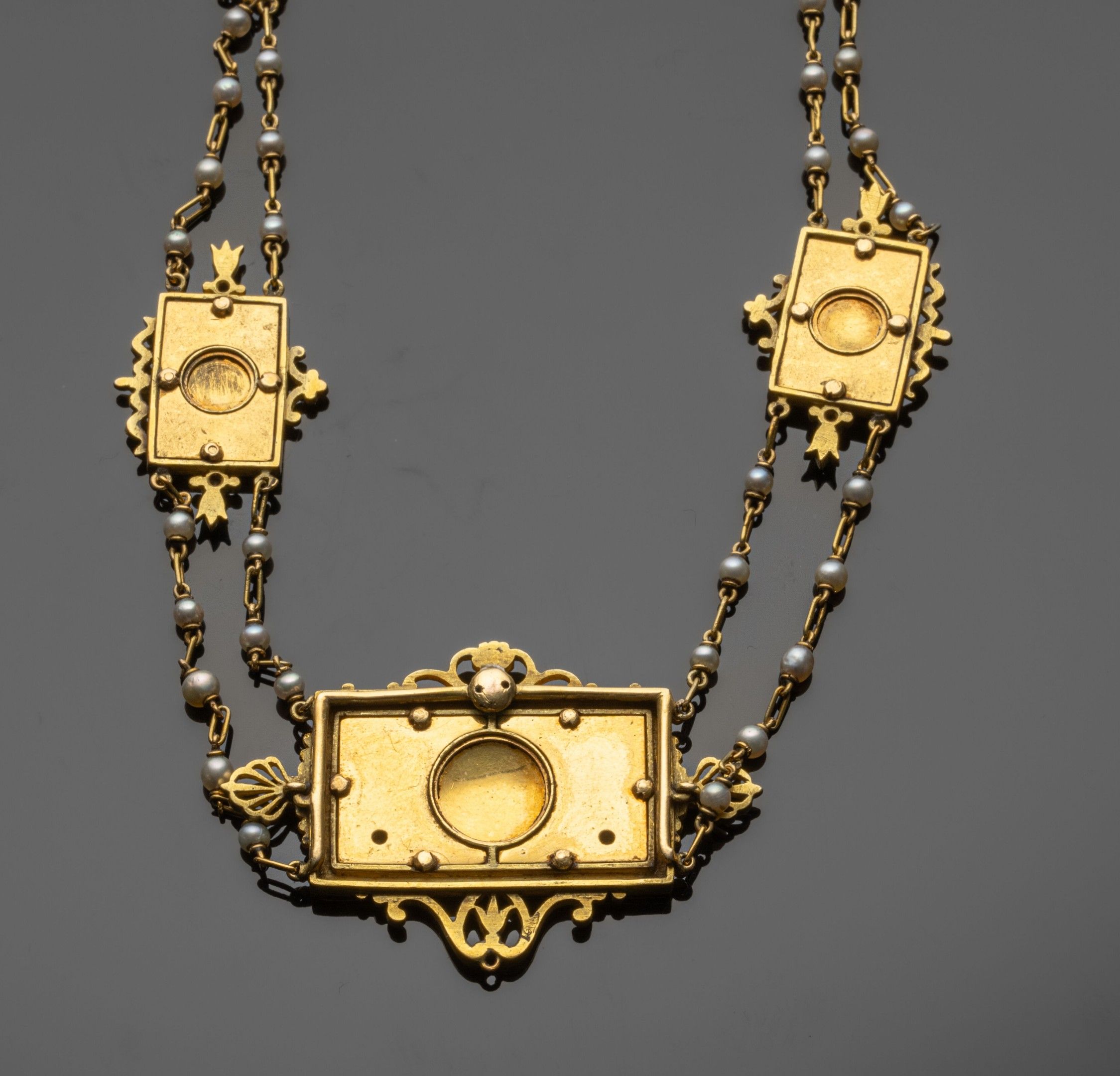 Necklace in 18K (750°/°°) yellow gold with oval mesh and cartouche, the central part with double rows, alternating with probably fine pearls; is embellished with three rectangular motifs (the larger central one removable by screw system), decorated with scrolls, palms and florets, set with rose-cut and old-cut diamonds as well as roses on stems and an antique-style aulos player enamelled green and white on a green enamel background over guilloché.