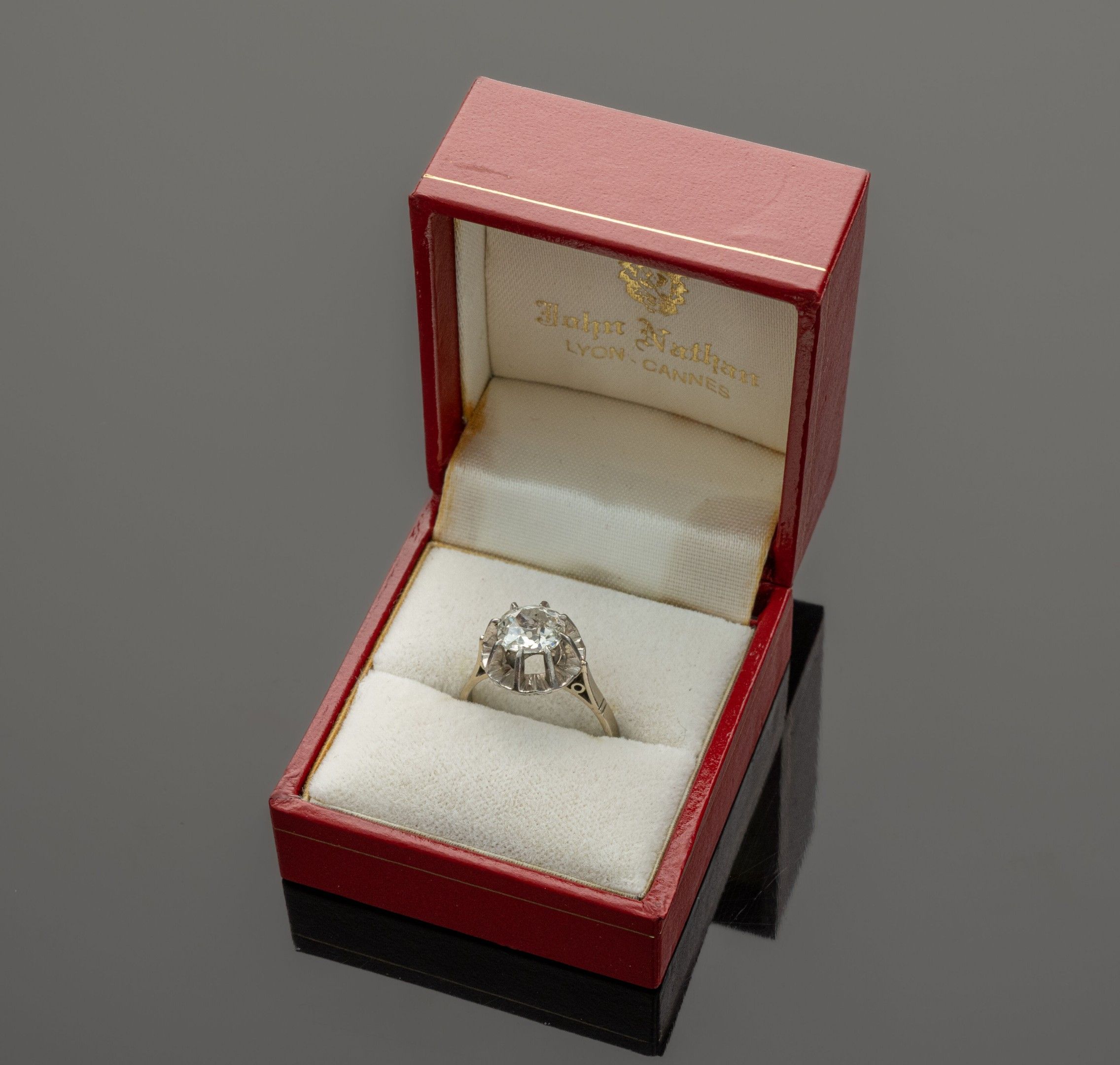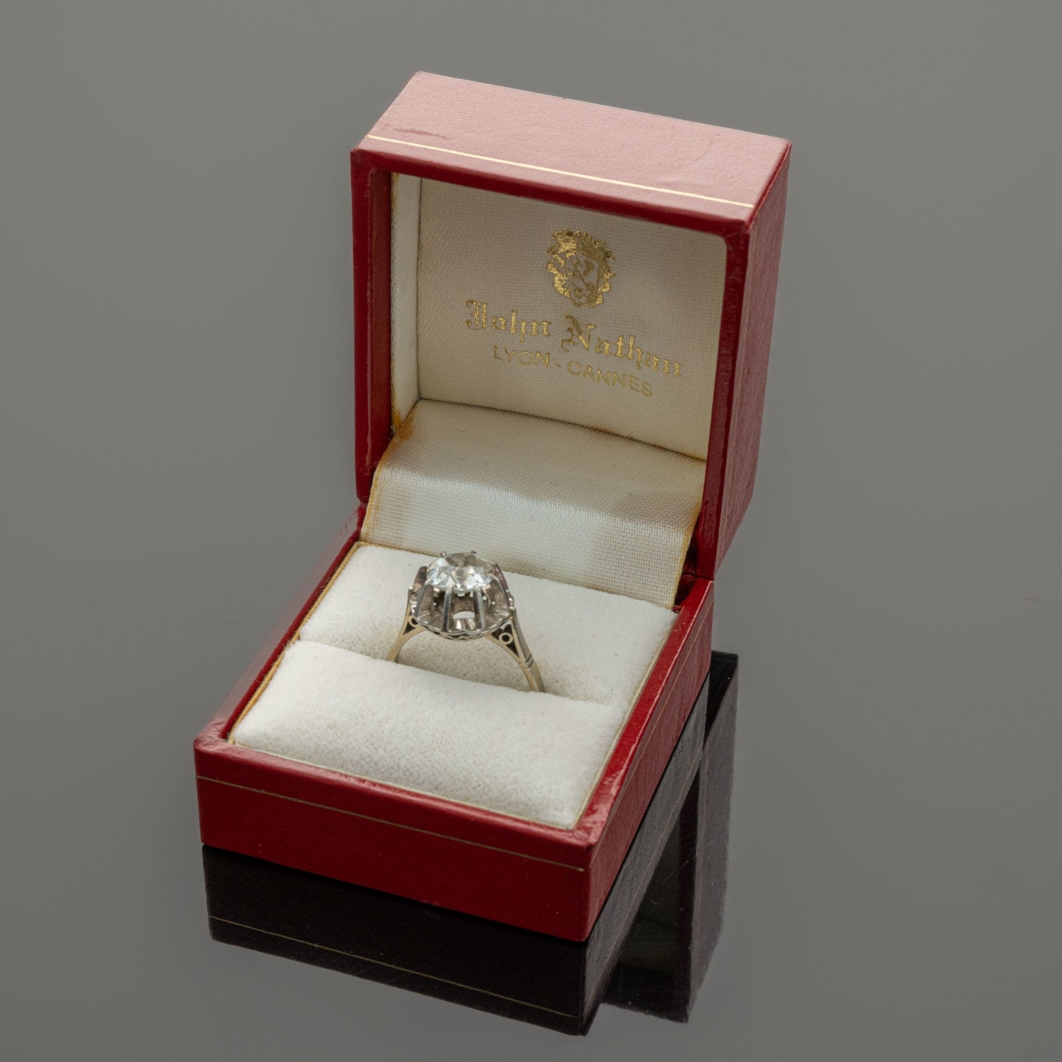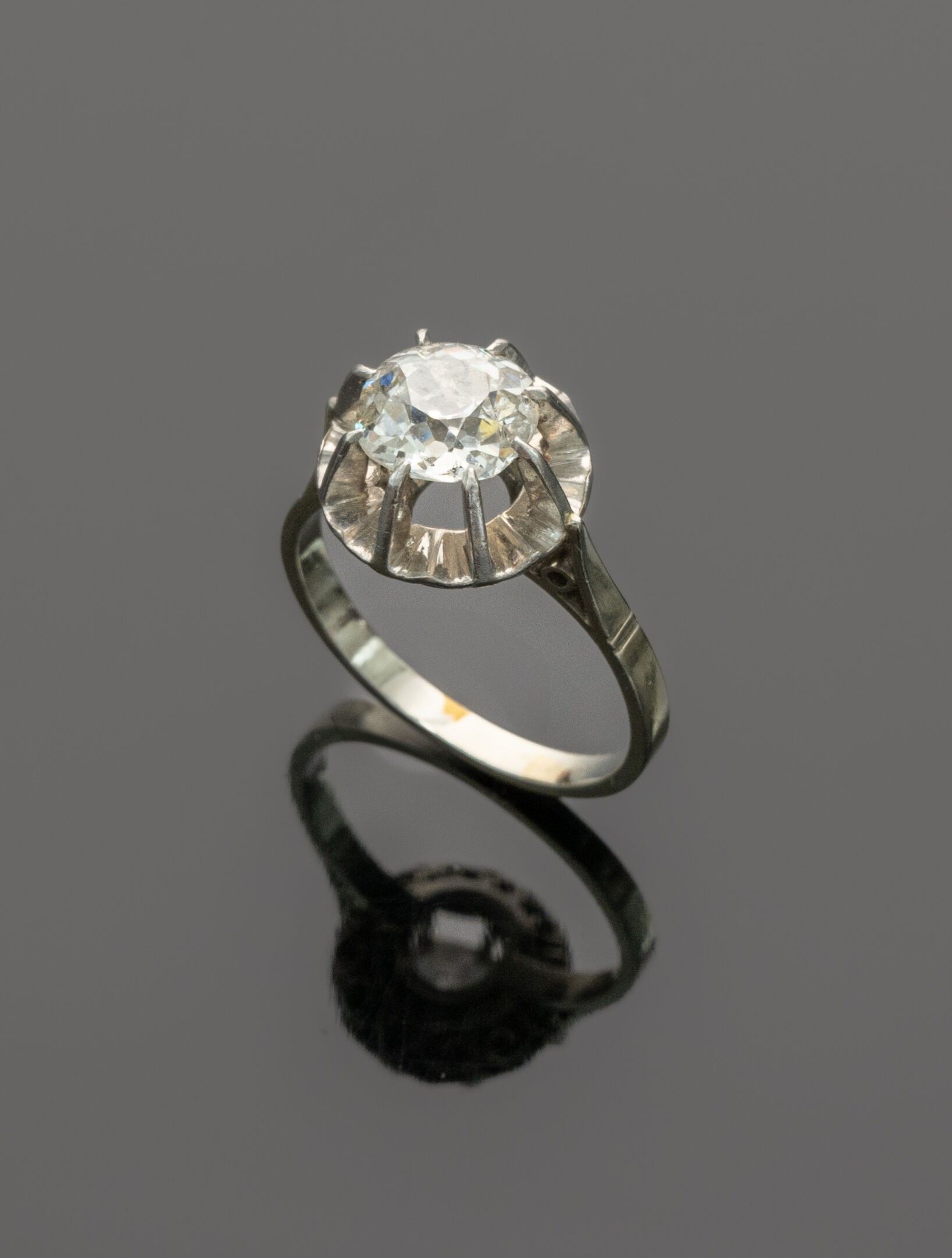 Solitaire ring in 18K (750°/°°) white gold and platinum (850°/°°), centred on an old-cut diamond measuring approximately 1.50 ct, pitted stone, colour presumed H/I (chips, additional facets and rough shape indicators) in an 8 claw setting.