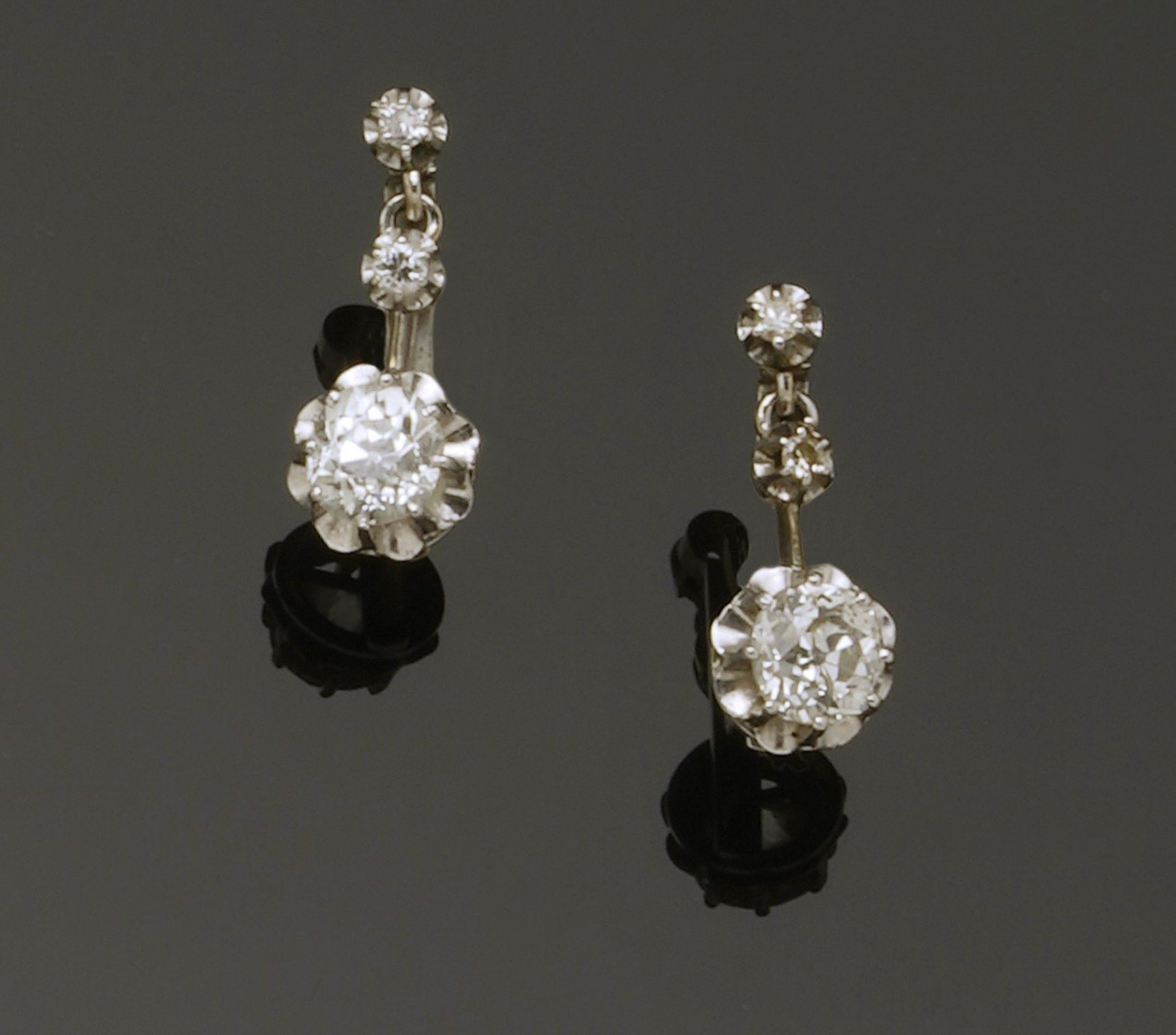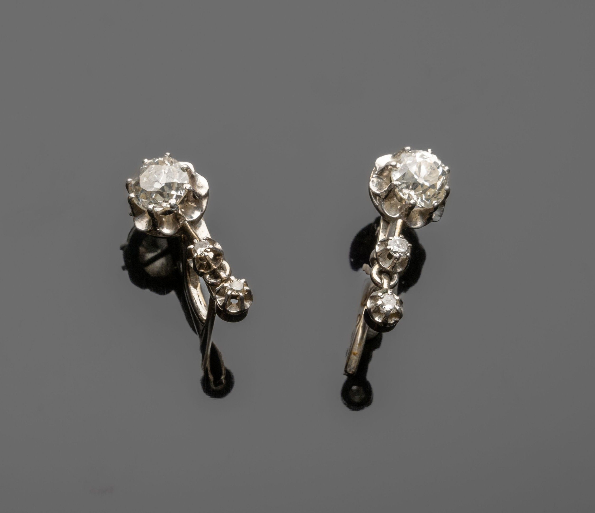 Pair of articulated dormeuses in 18K (750°/°°) white gold each set with two round diamonds surmounting an old-cut cushion diamond weighing approximately 0.75 ct
