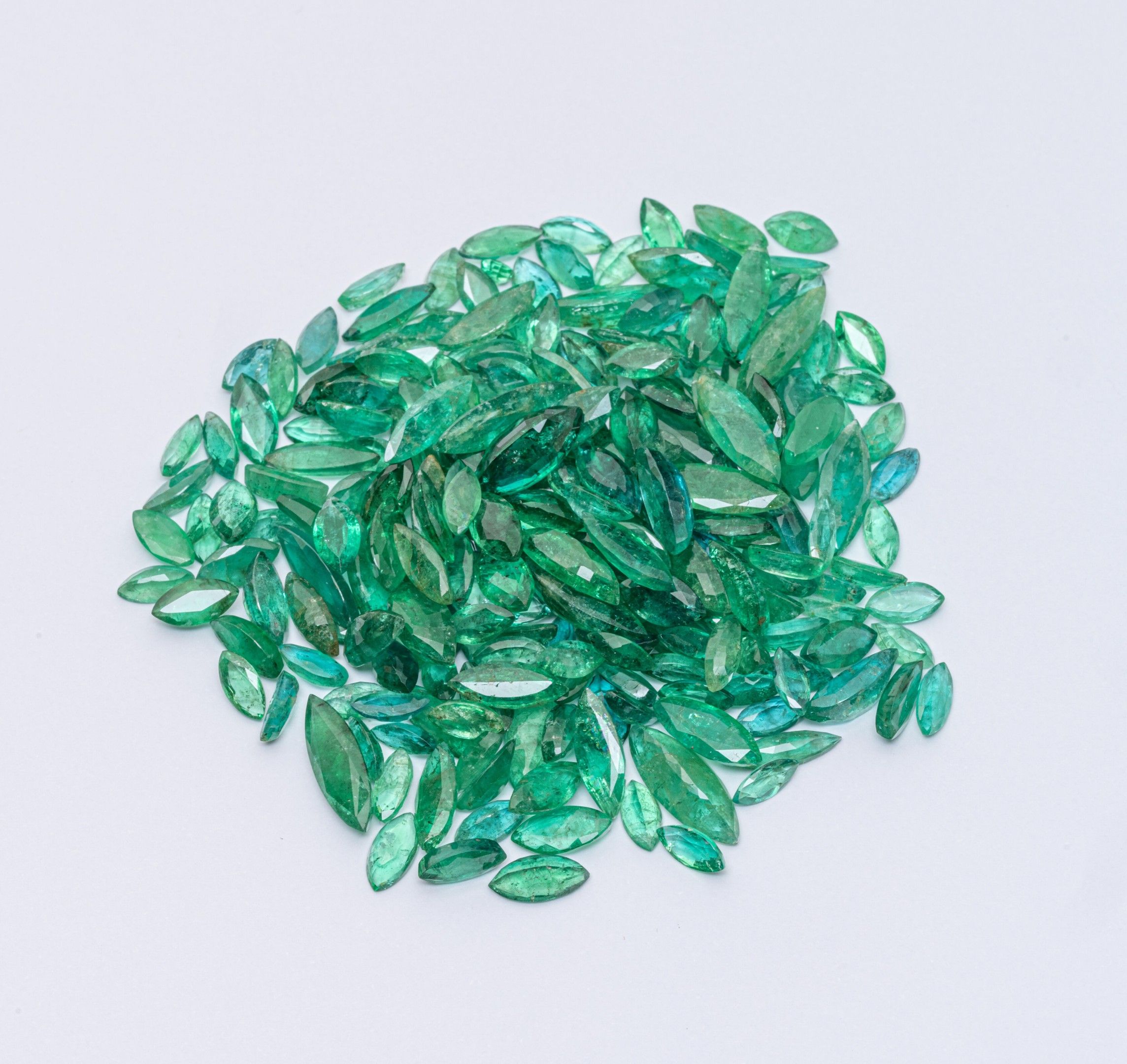 Lot of unmounted marquise-cut emeralds on paper, together weighing more than 120 carats.