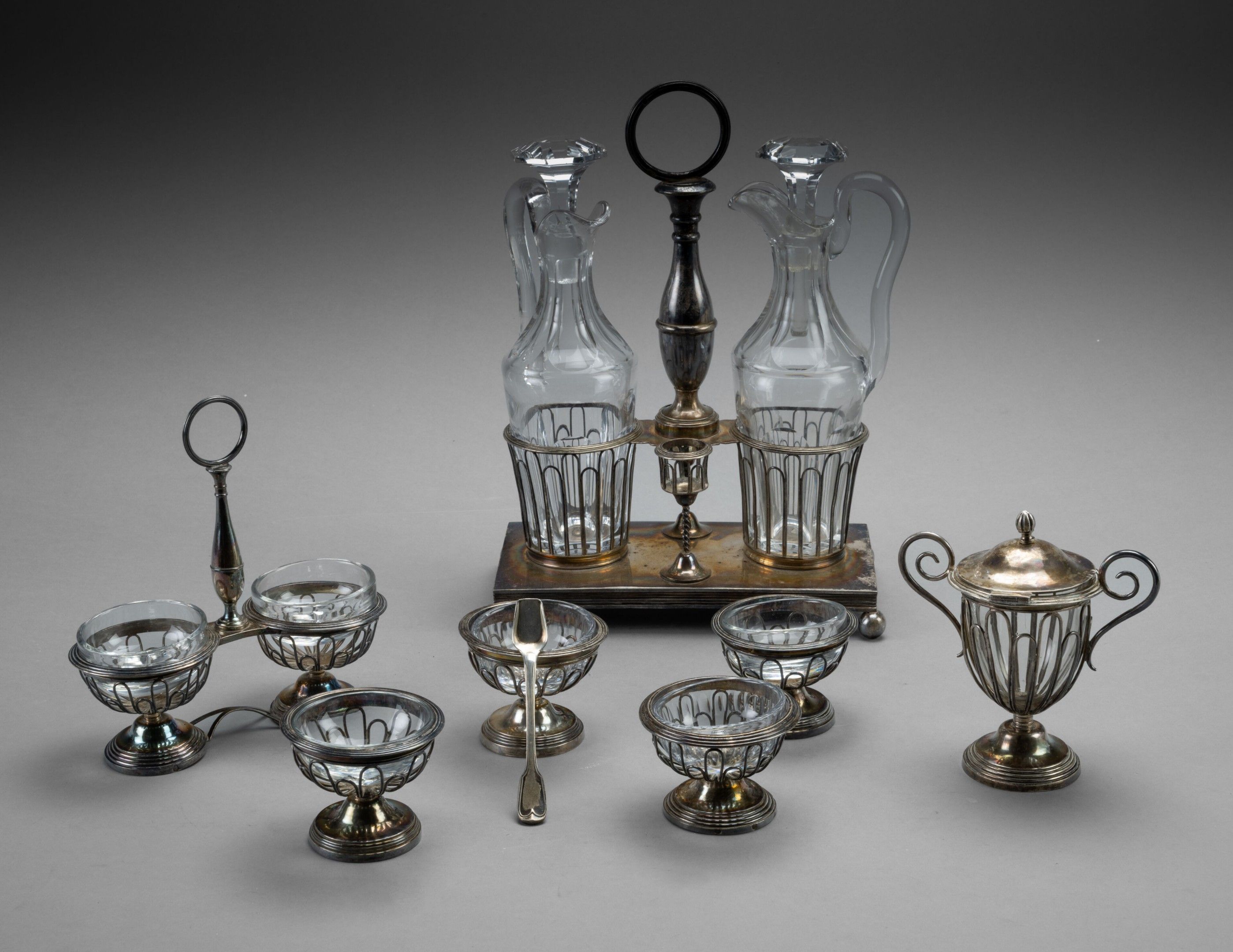 Silver tableware with arches, consisting of an oil and vinegar cruet and two cut crystal bottles, a double salt cellar, two pairs of individual salt cellars and a mustard pot.