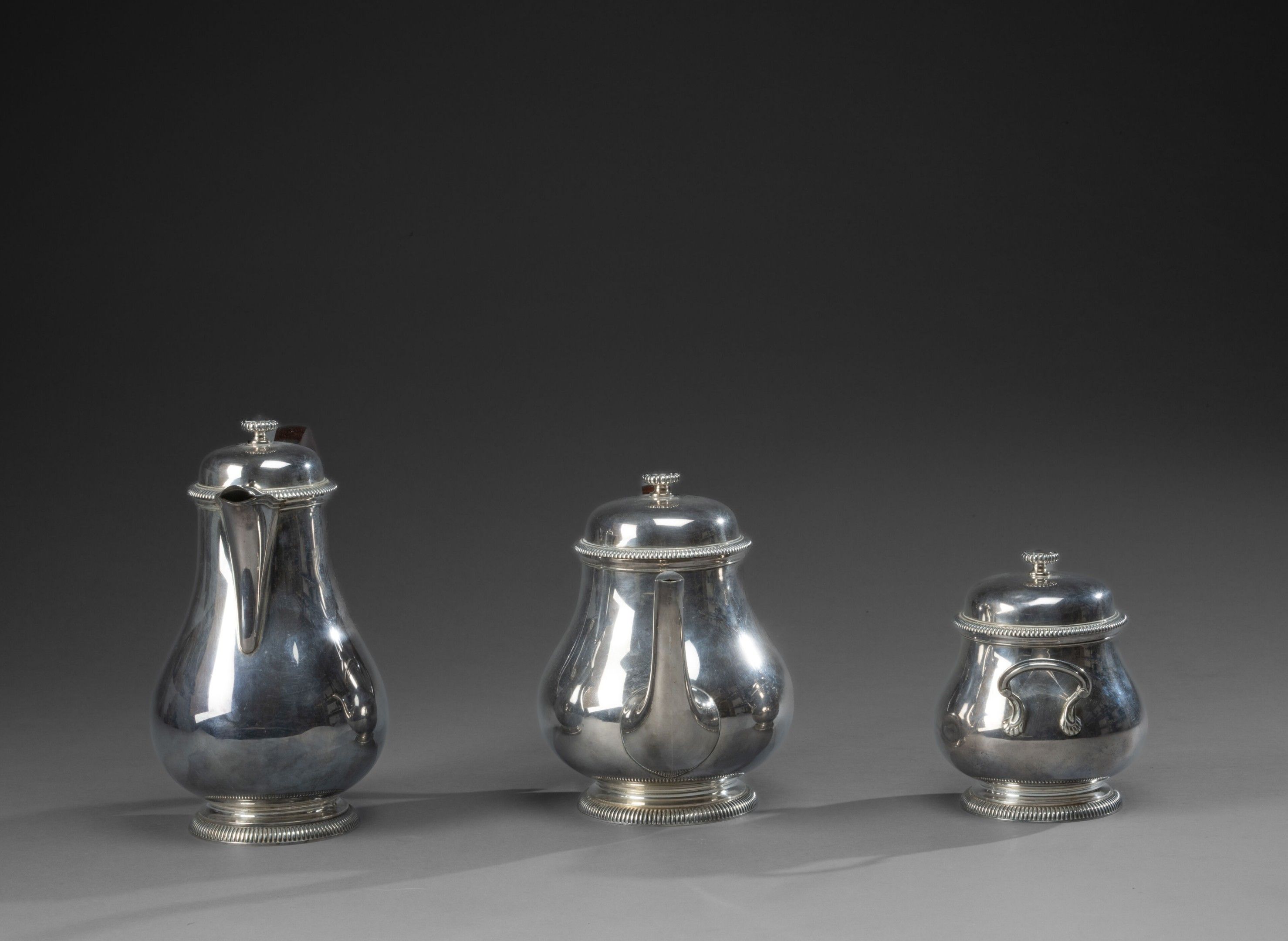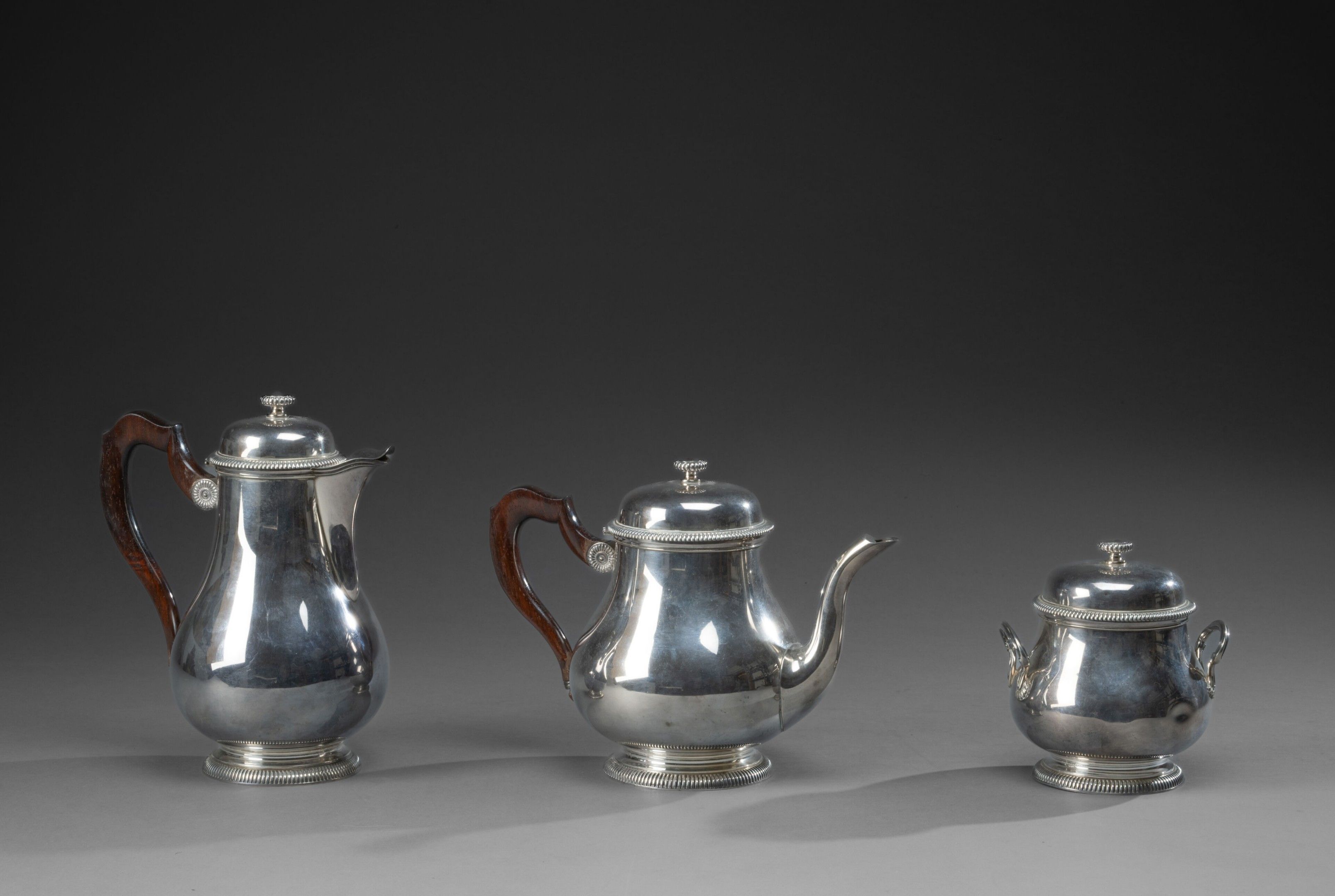 A plain silver baluster-shaped tea and coffee service with fluted and moulded rim, domed hinged lid decorated with a frieze of gadroons on the foot, removable for the sugar bowl, gadrooned knob-shaped grip, exotic wood varnished shoulder handle, comprising: a teapot, a coffee pot, a sugar bowl with vermeiled interior.