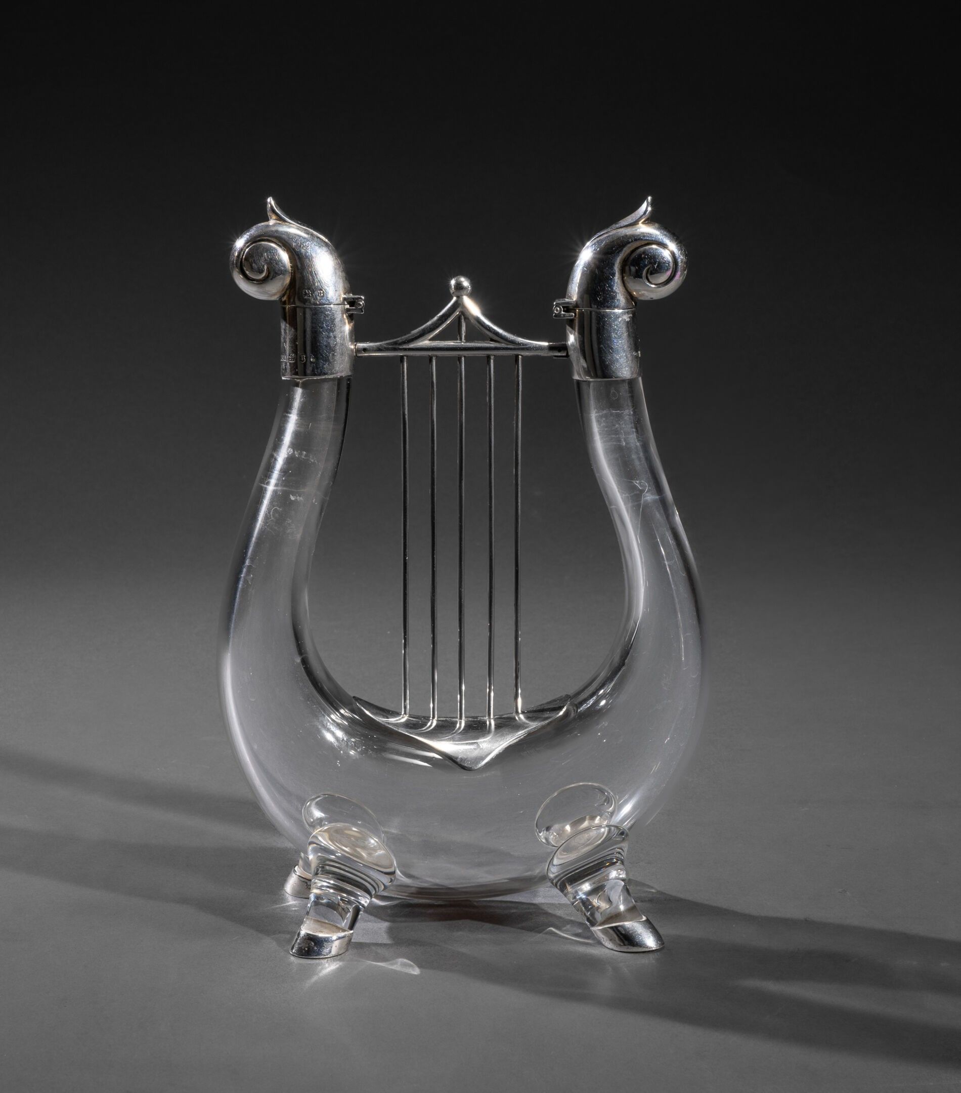 Silver and glass decanter in the form of a lyre with two openings, scrolled hinged lids, standing on four silver ringed feet.