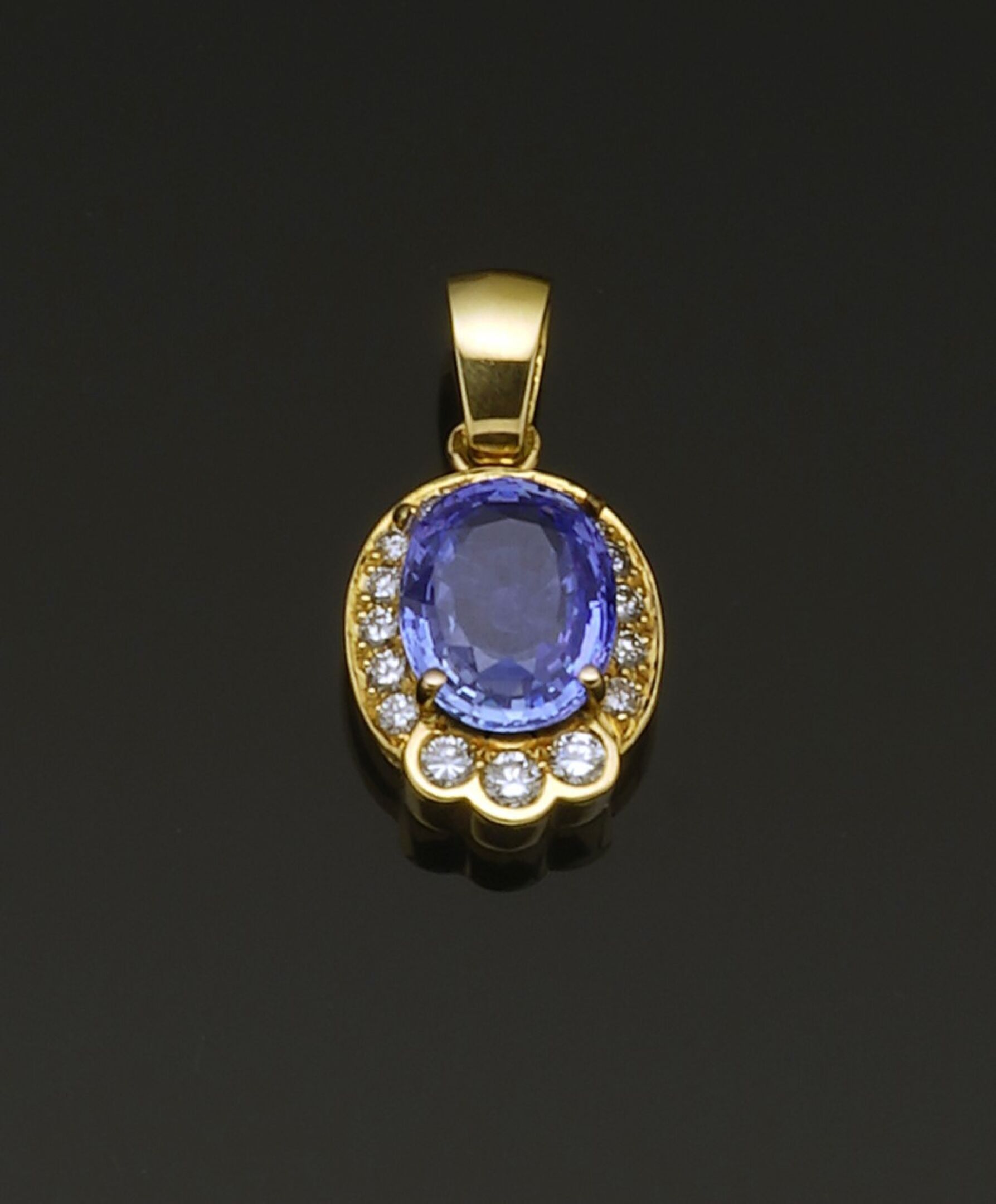 Pendant in 18K (750°/°°) yellow gold, centred on an oval sapphire weighing 6.01 carats, without thermal modification, in a setting of brilliant-cut diamonds, the lower three being larger