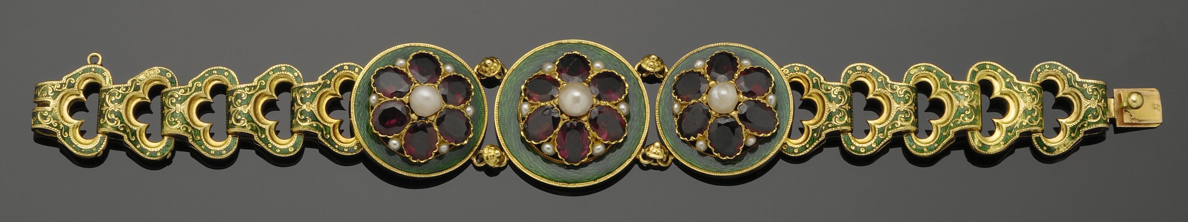 Bracelet in 18K (750°/°°) yellow gold with green enamelled articulated links (slightly missing), the central links set with oval garnets (one chip) and embellished with small pearls, the central links with buttons, with its safety chain. Slight dents on the back. Hallmark of the Master Goldsmith: Pierre-Auguste MOIREAU, Paris circa 1850