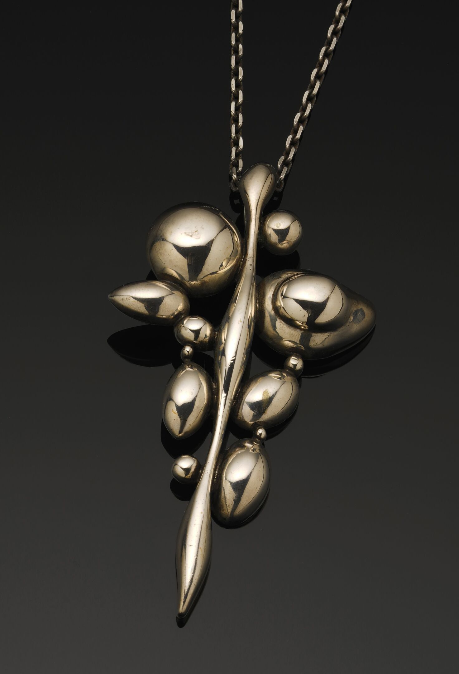 Silver (800°/°°) pendant forming a cluster of smooth cabochons; bears the hallmark of the master goldsmith (semi legible). It is held by a silver (800°/°°) forçat chain.