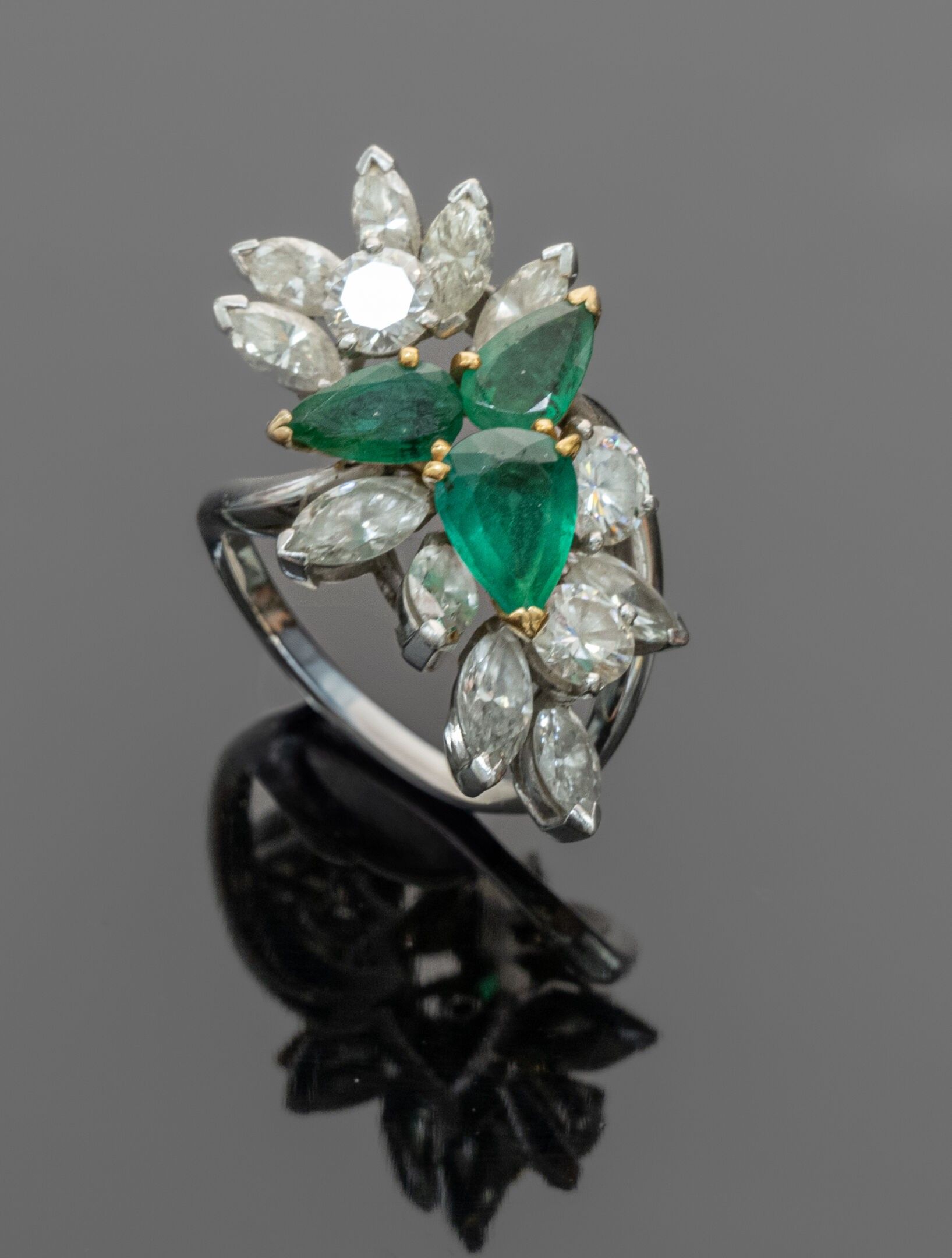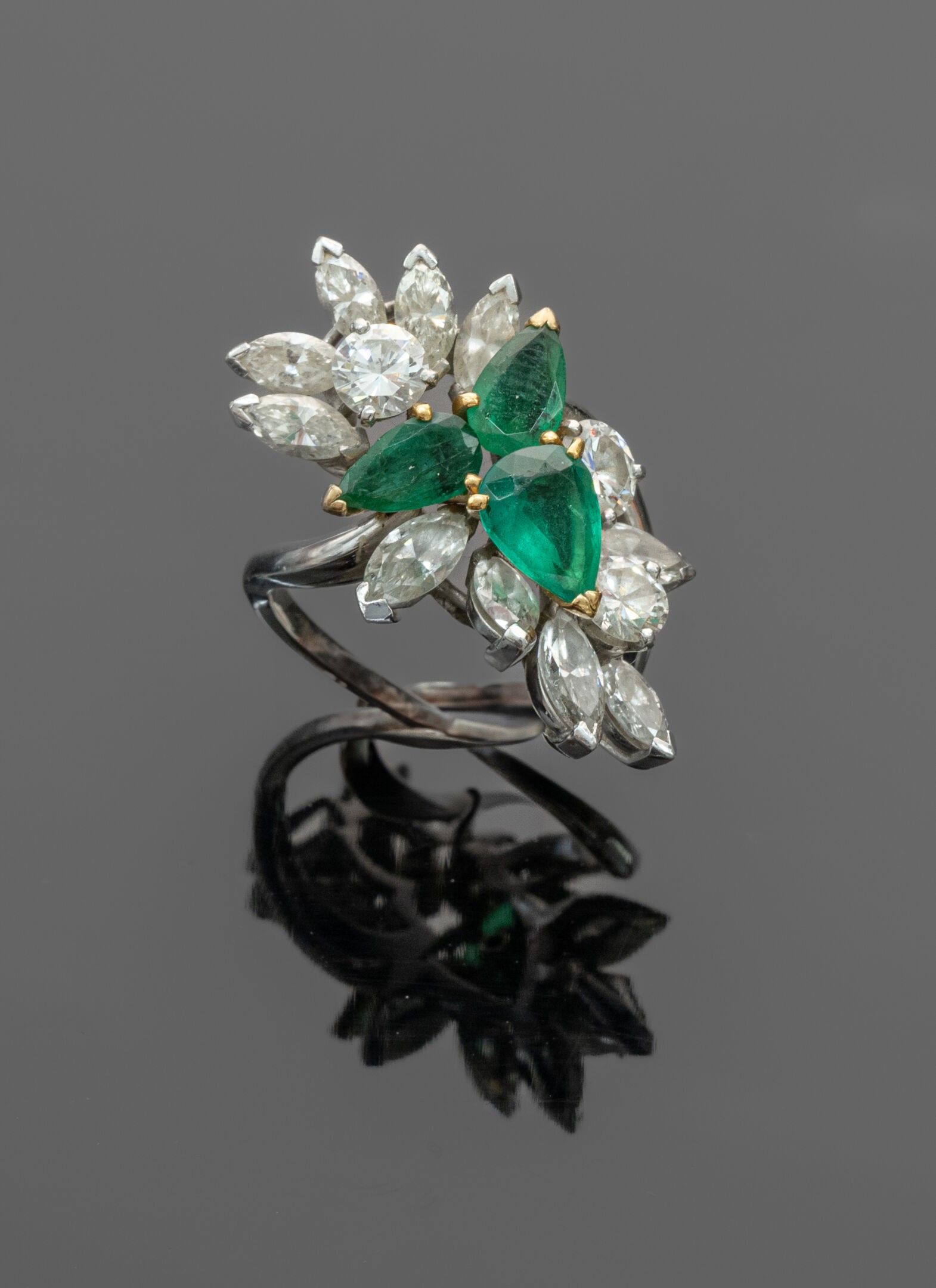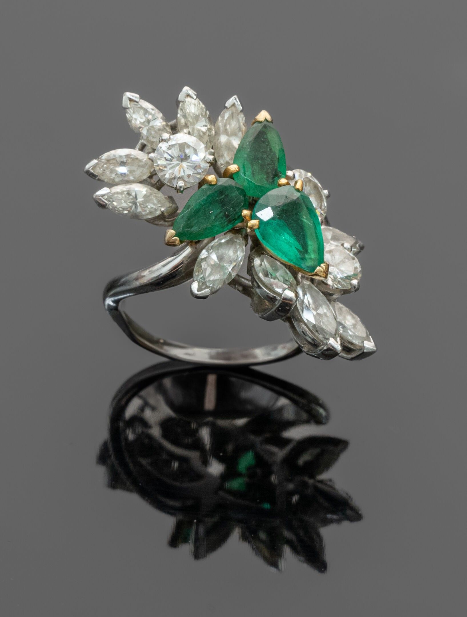 Platinum (850°/°°) "Cocktail" ring centred on three pear-cut emeralds weighing approximately 3.50 carats (slight wear, one with cracks and chips) set in 18K (750°/°°) yellow gold in a setting of marquise-cut and brilliant-cut diamonds weighing approximately 4.30 carats. Signed and numbered