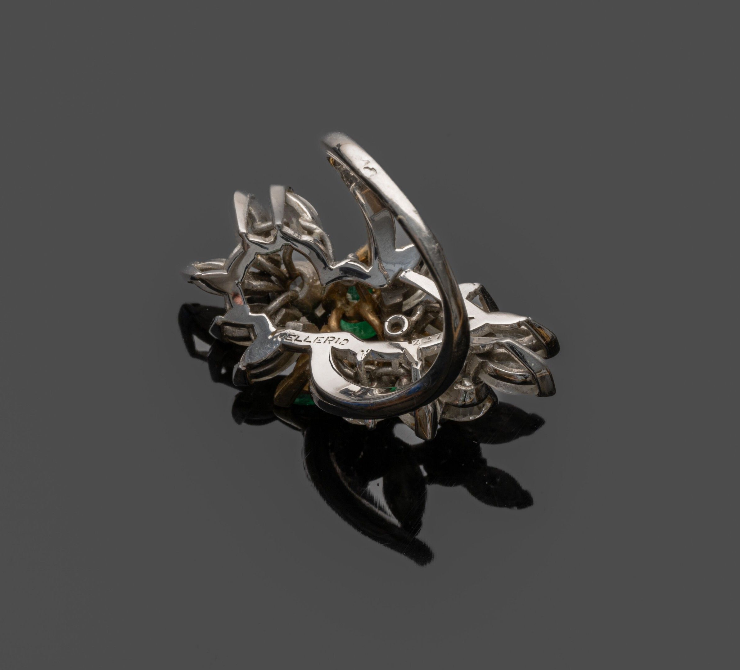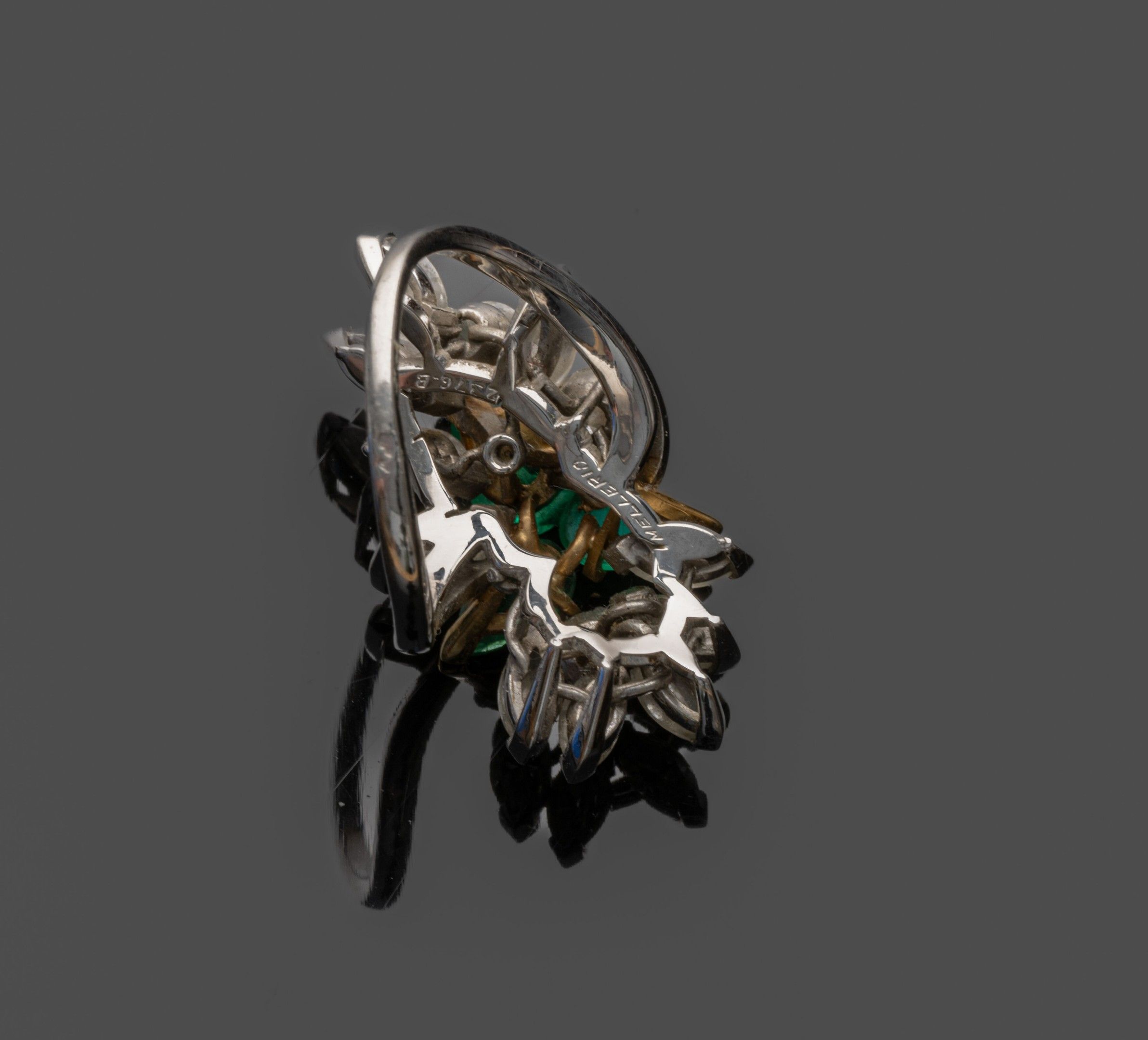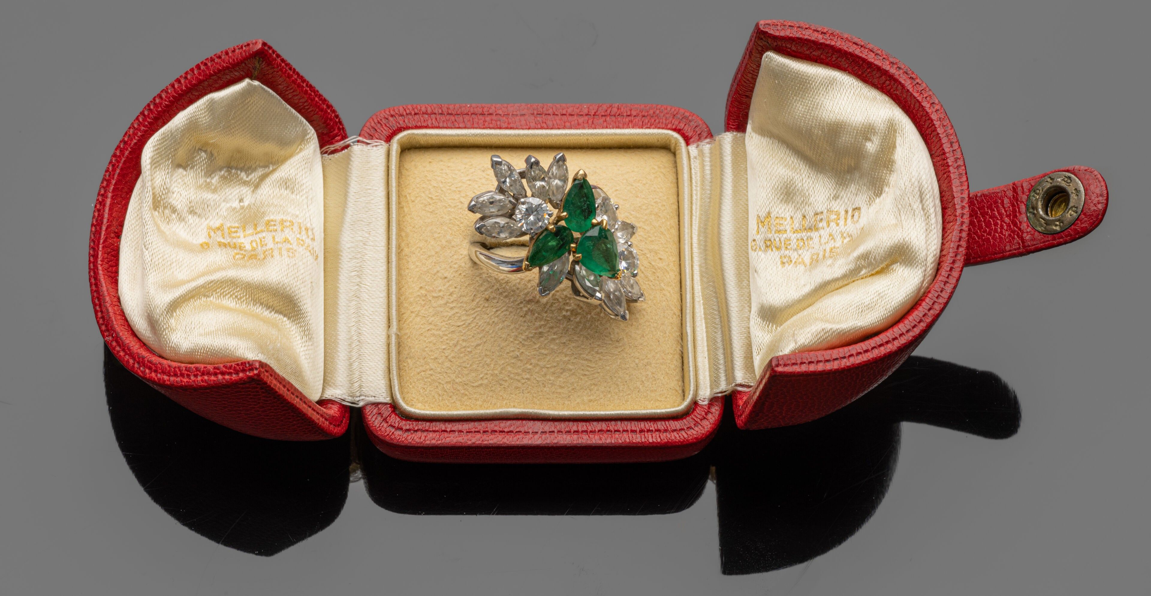 Platinum (850°/°°) "Cocktail" ring centred on three pear-cut emeralds weighing approximately 3.50 carats (slight wear, one with cracks and chips) set in 18K (750°/°°) yellow gold in a setting of marquise-cut and brilliant-cut diamonds weighing approximately 4.30 carats. Signed and numbered