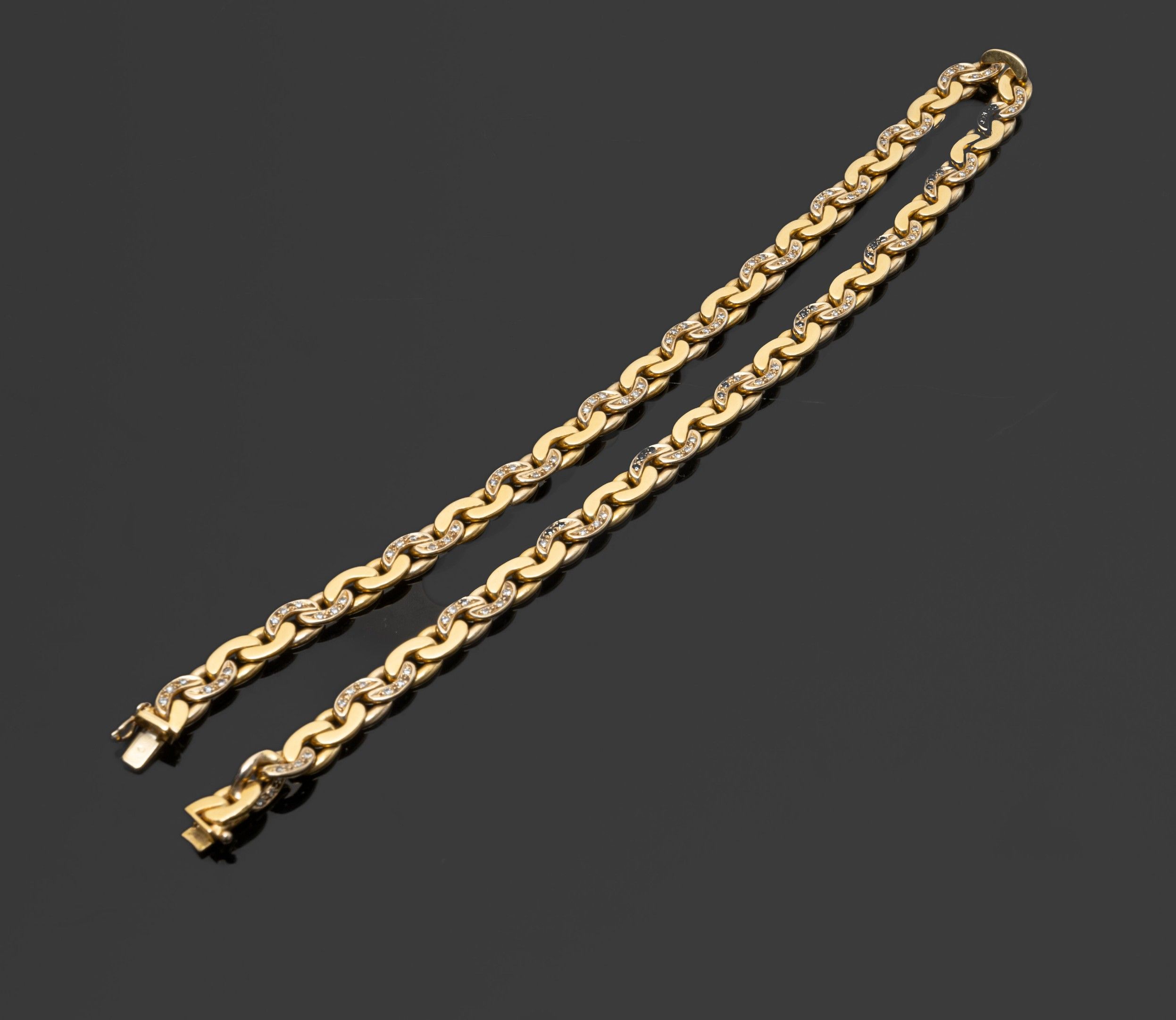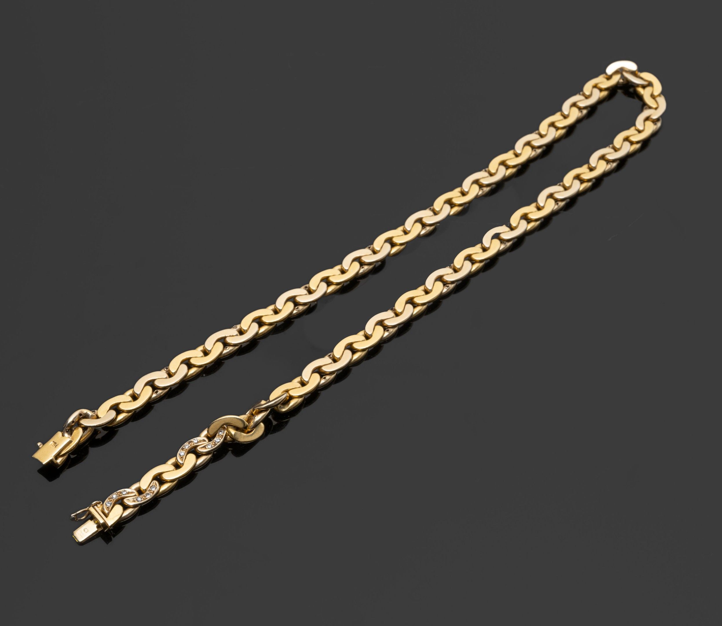 Two-tone 18K (750°/°°) gold chain, full link, flattened oval, half the links each set with three brilliant-cut diamonds
