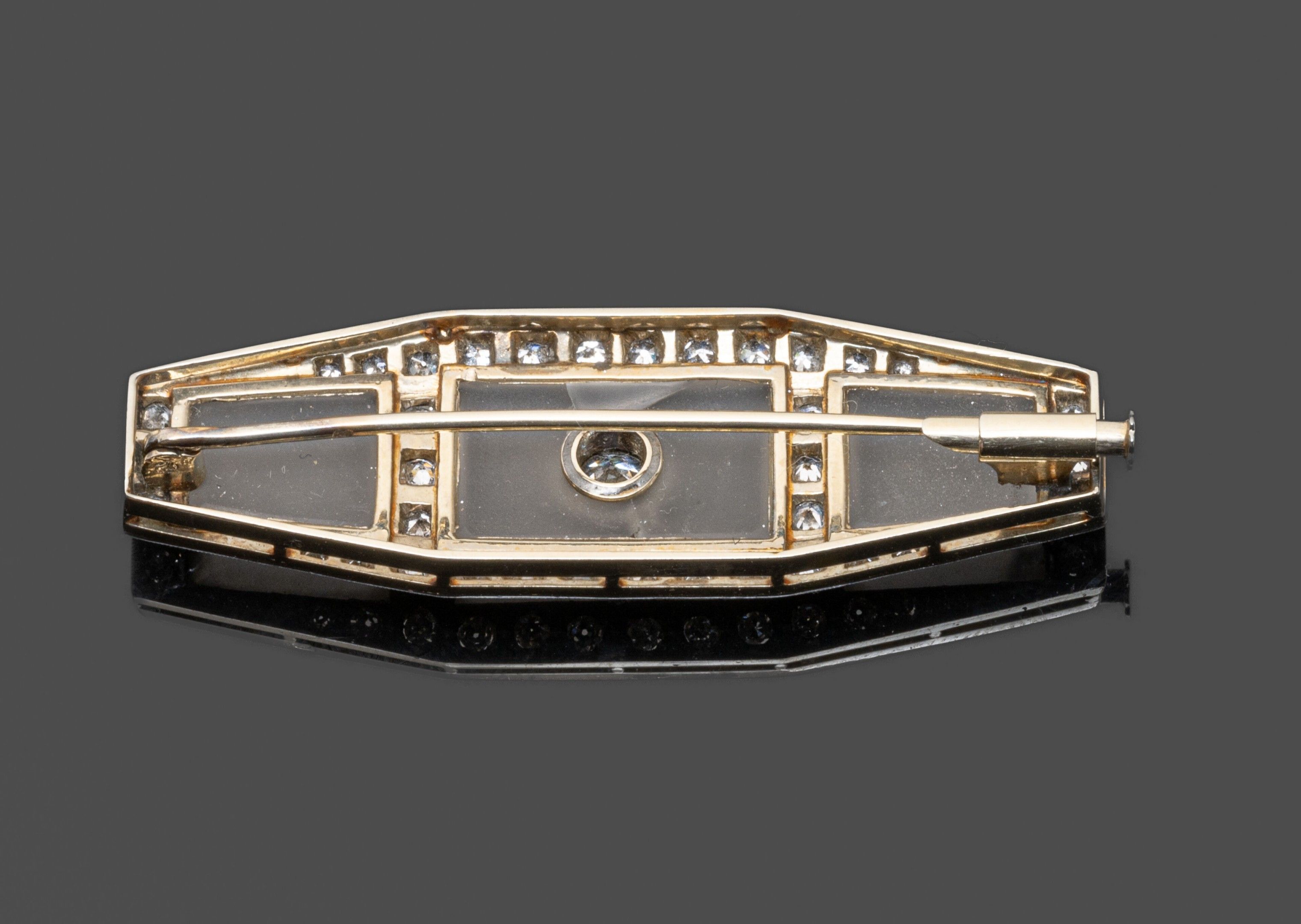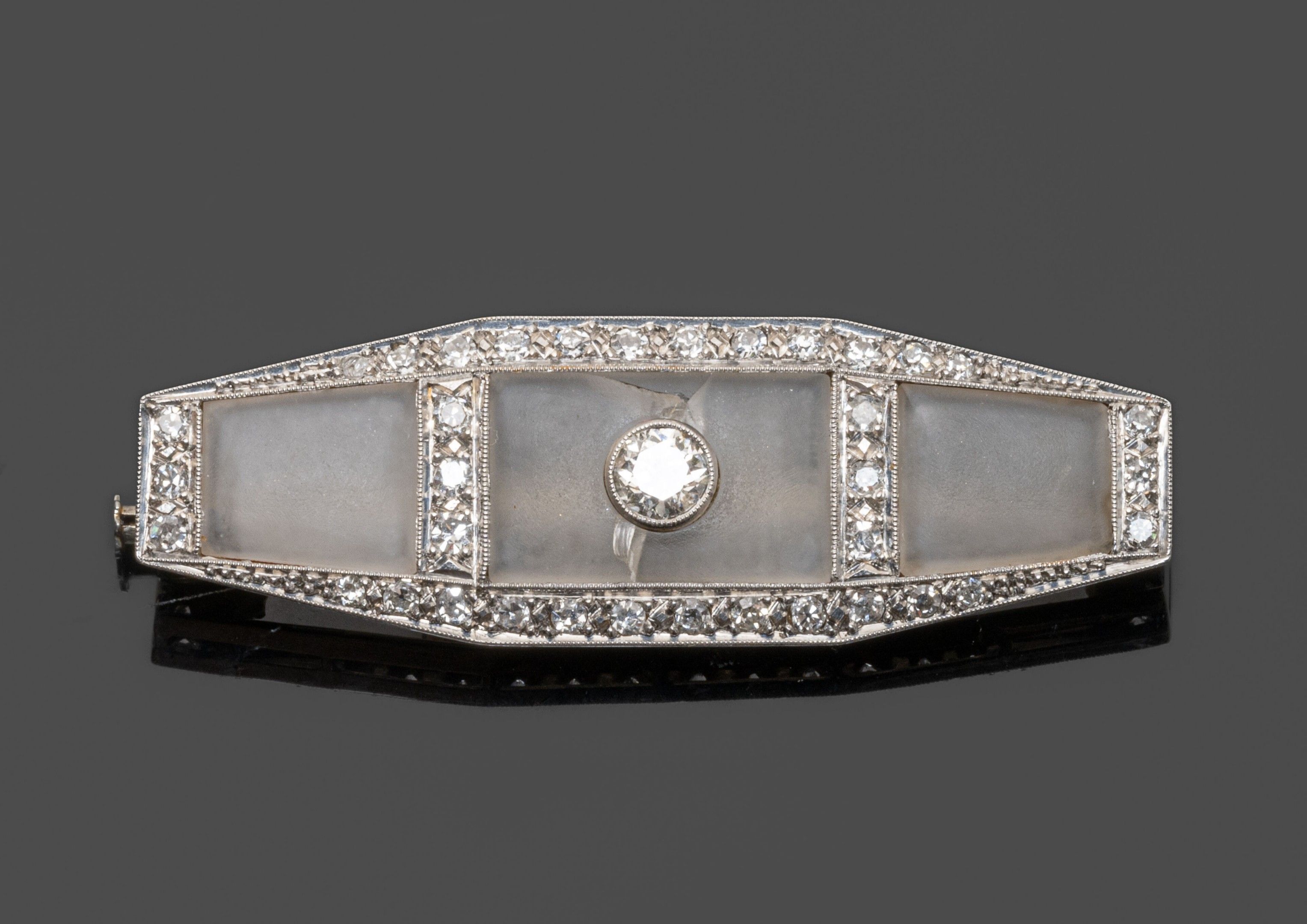 Rhodium-plated 18K (750°/°°) white gold brooch, geometric shape set with lines of 8x8 diamonds (one rose) holding three plates of frosted rock crystal, the central one (broken, accidents) pierced with a half-cut diamond of approx. 0.30 ct in closed setting. The settings are in platinum (850°/°°), the pin in 18K (750°/°°) white gold with traces of reworking: yellow gold soldering. Dimensions: approx. 45 x 15 mm - Gross weight: 7.3 g
