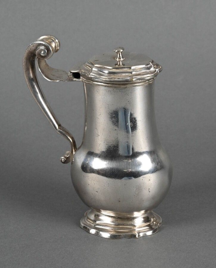 Beautiful small silver-plated baluster ewer with flat body, on stepped base and lid, high scrolled handle