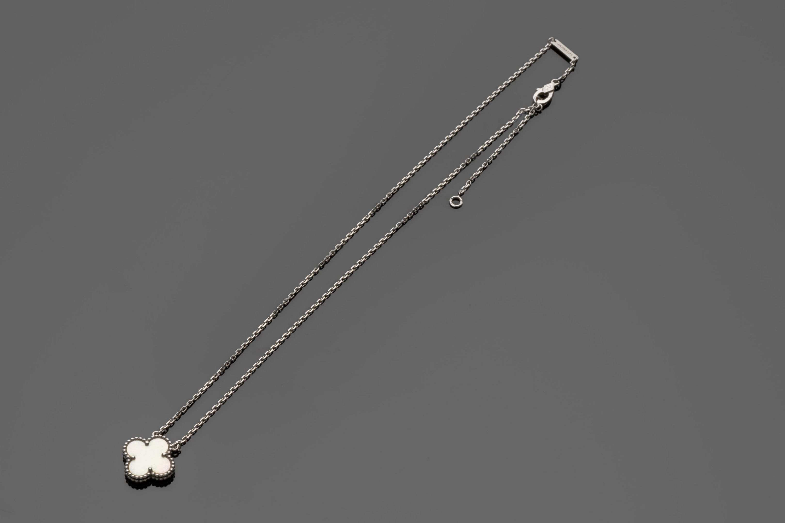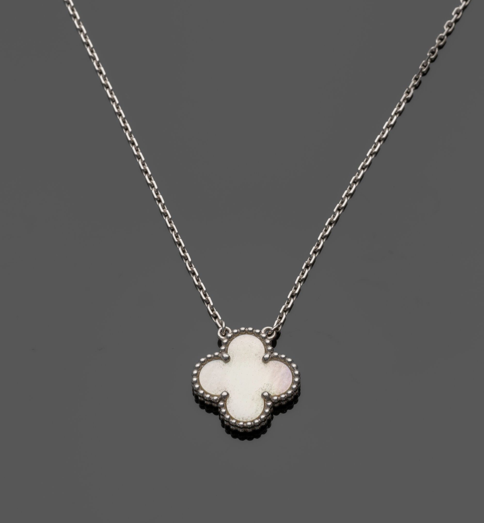 Necklace in 18K (750°/°°) white gold, "Vintage Alhambra" collection, with forçat link, the central four-lobed motif set with a mother-of-pearl plate. Signed and numbered
