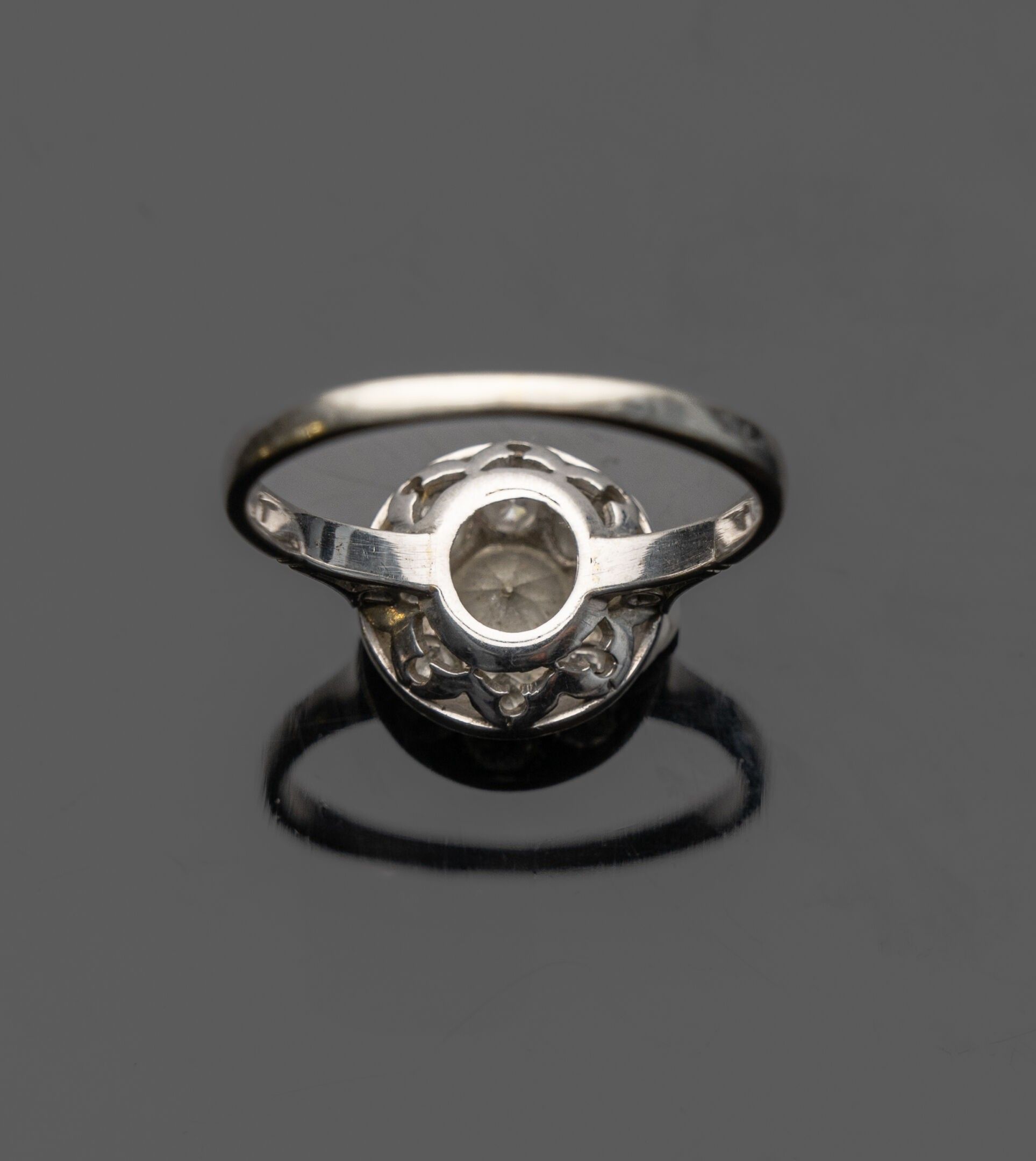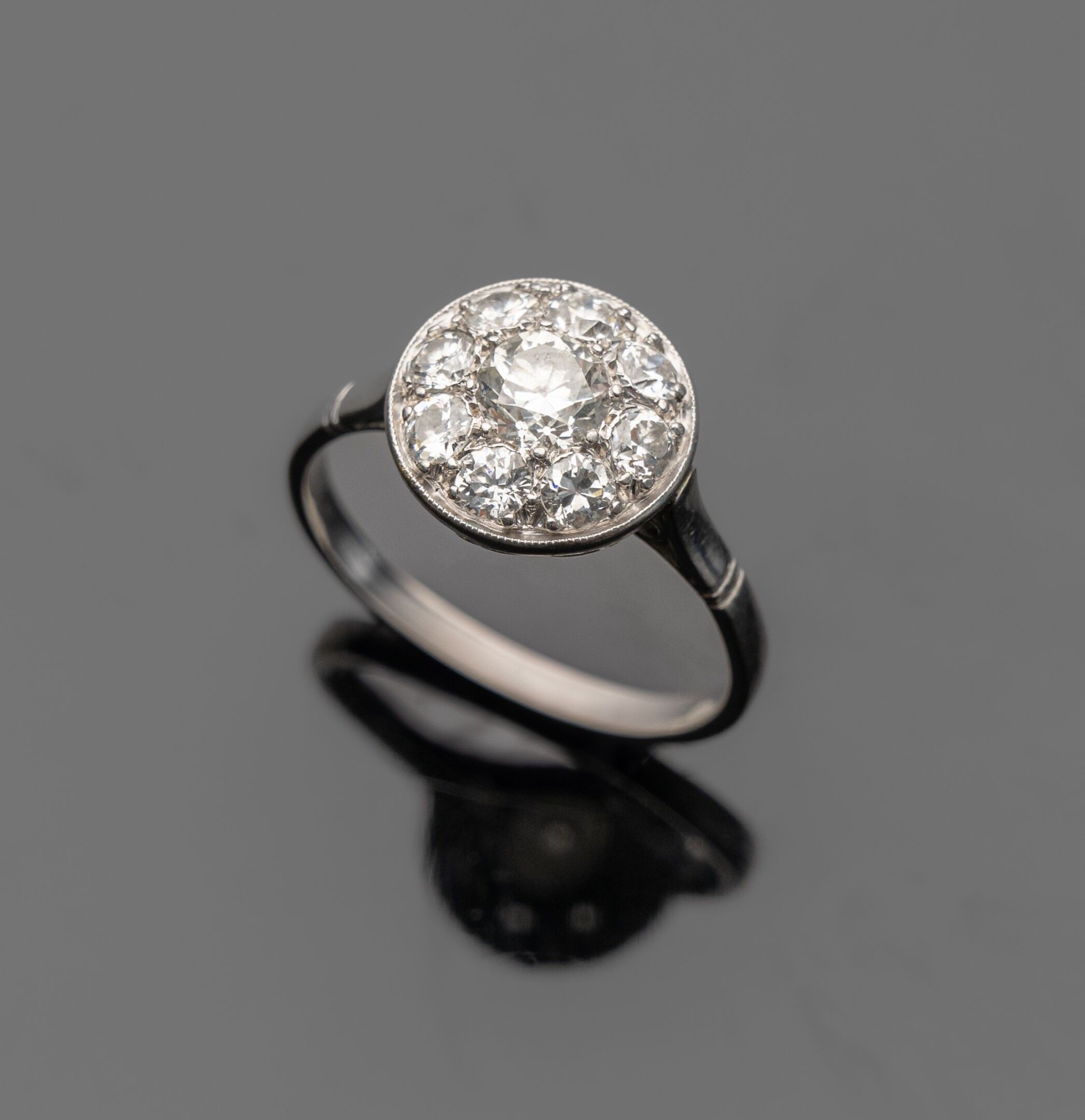 Ring in 18K (750°/°°) white gold and platinum (850°/°°), the slightly domed round top centred on a half-cut diamond weighing approximately 0.35 ct in a surround of smaller brilliant-cut diamonds