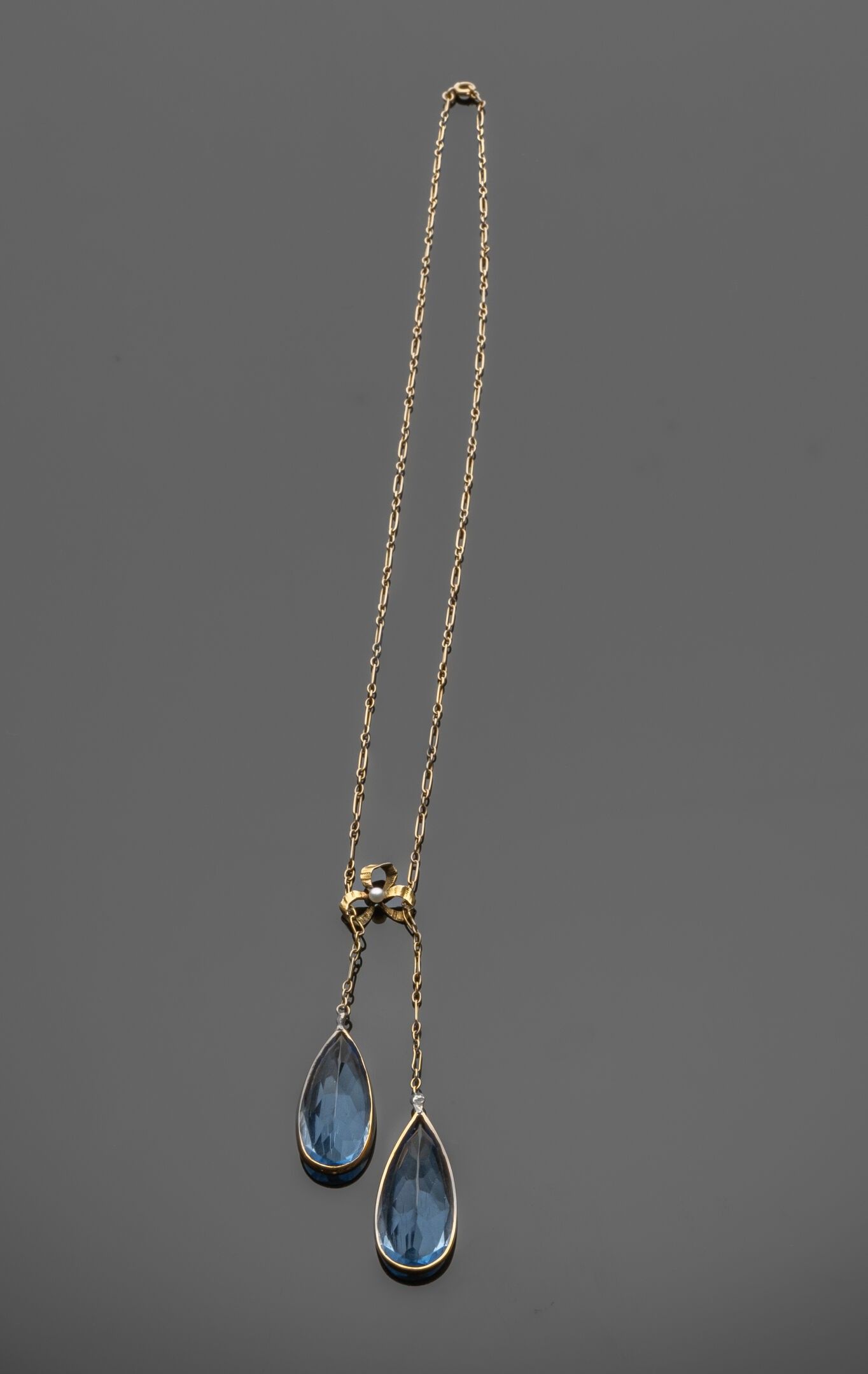 Négligé" necklace in 18K (750°/°°) yellow gold with oval links and alternating cartouches, centred on a three-lobed ribbon knot, adorned with a small button cultured pearl, holding two drop-cut synthetic blue stones (probably coloured glass imitating aquamarine). Traces of tin soldering on the stone attachments.