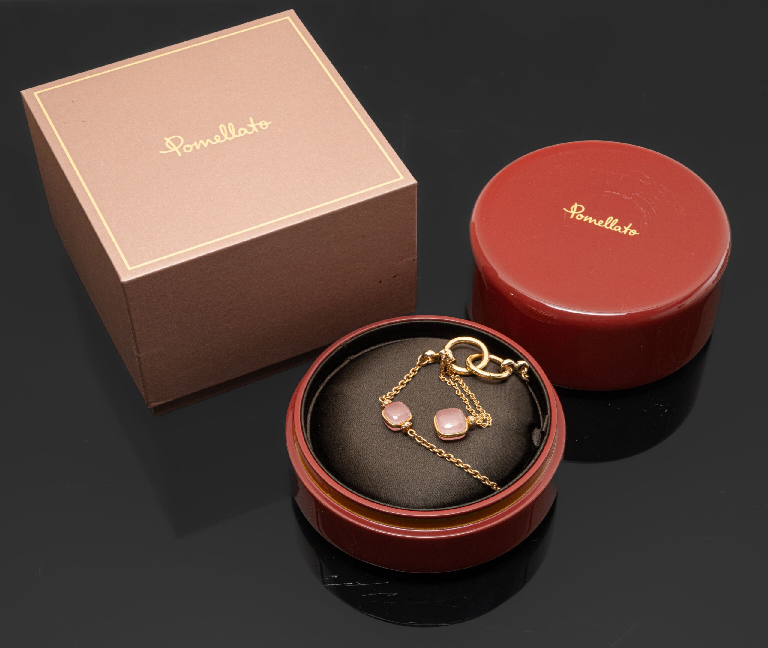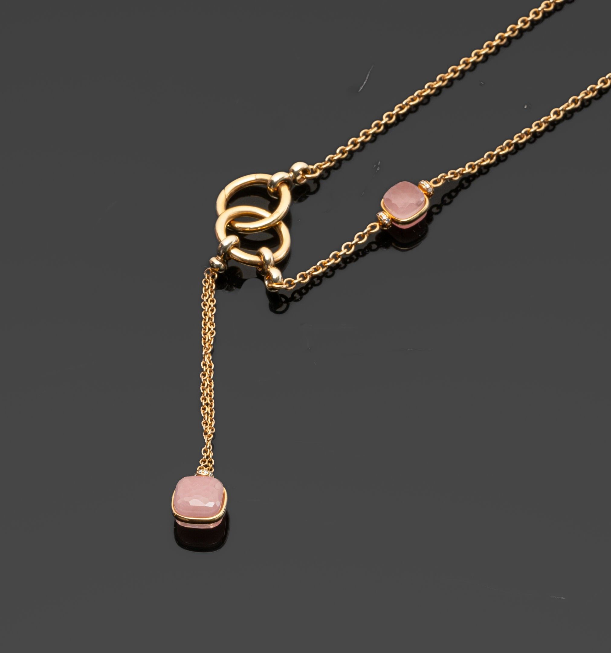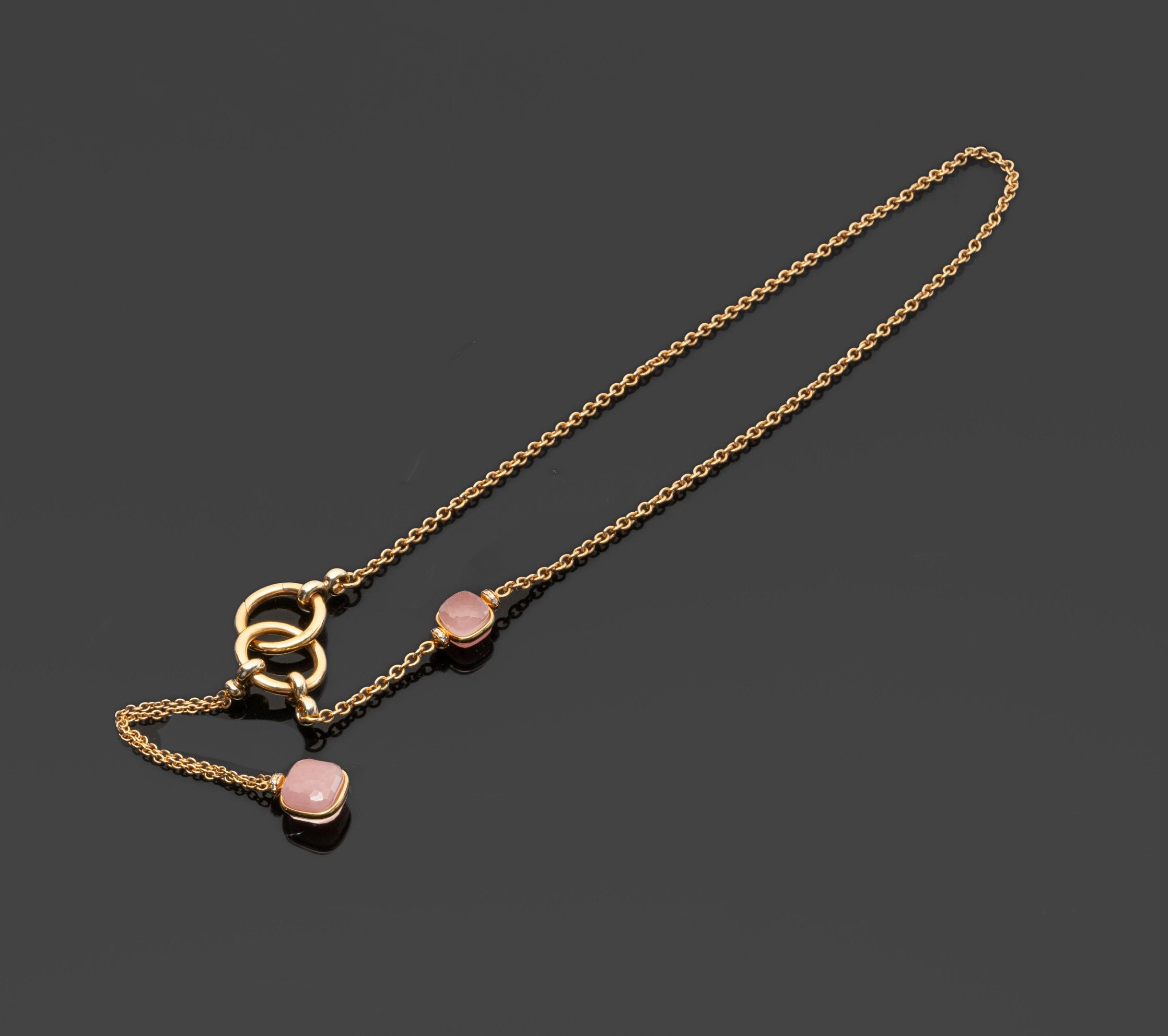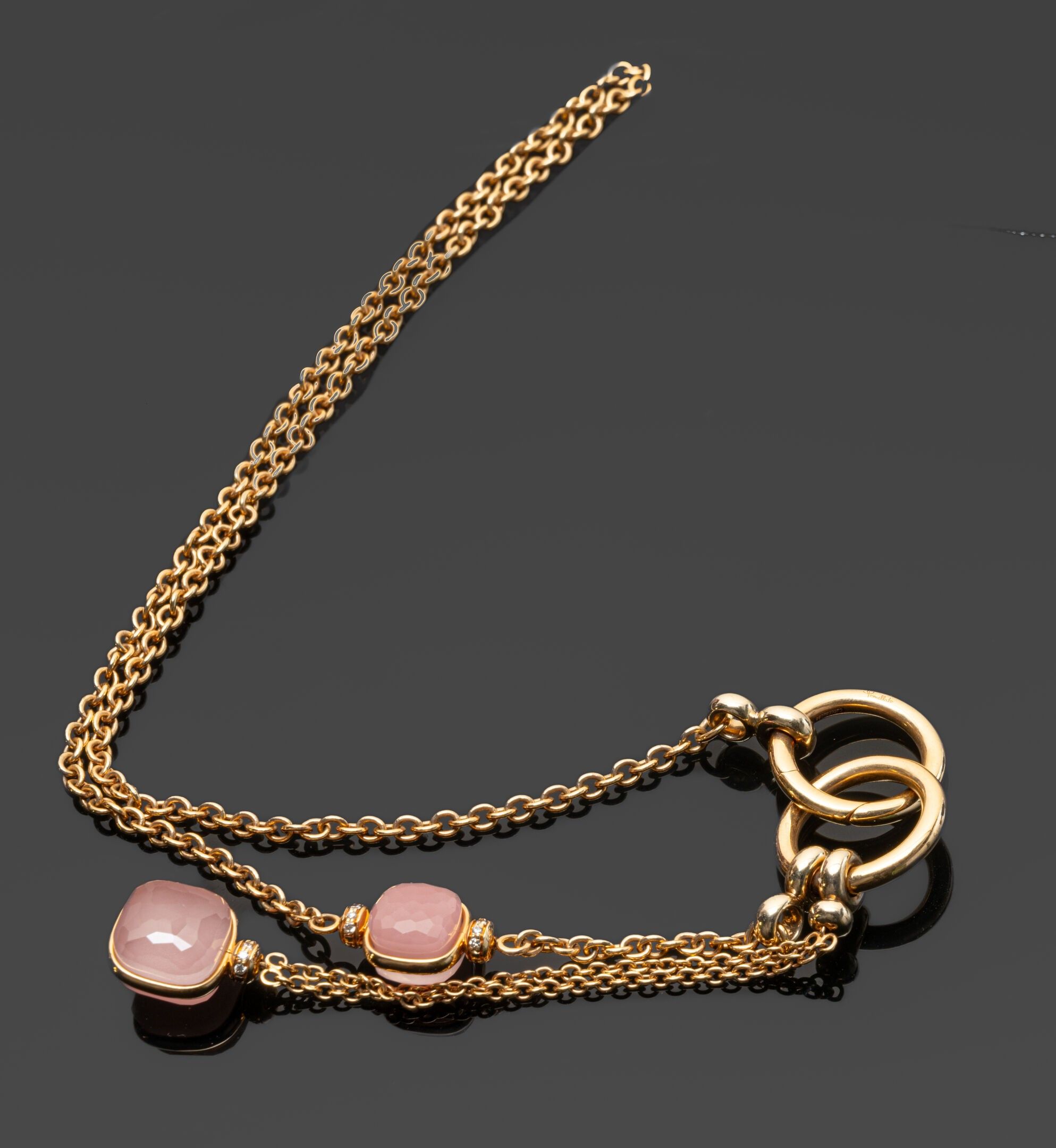 Necklace in 18K (750°/°°) yellow gold, "Lasso Nudo" collection, oval mesh, set with facetted cushion pink quartz and chalcedony briolette and brilliant-cut diamond-set ferrules, one of which is a pendant. Signed and numbered
