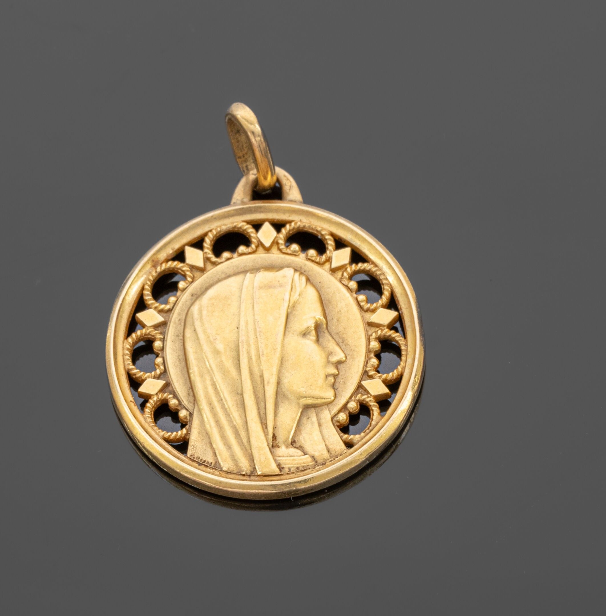 Round religious medal in 18K (750°/°°) yellow gold depicting the Virgin Mary on an openwork background decorated with lozenges and twists.