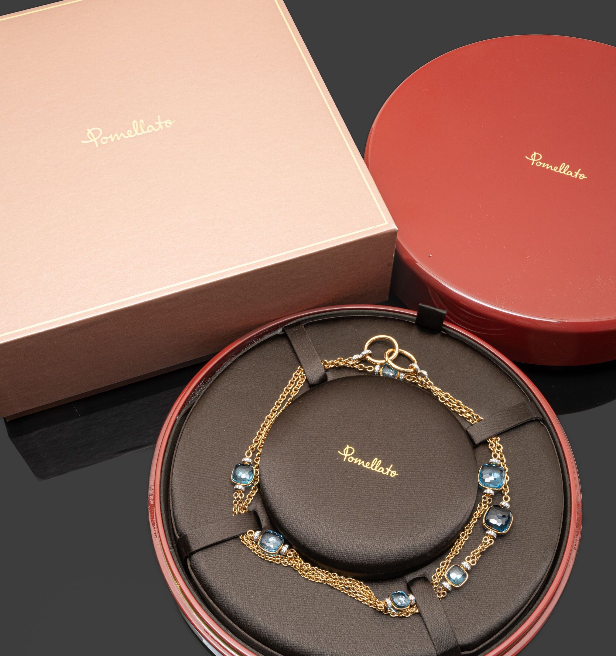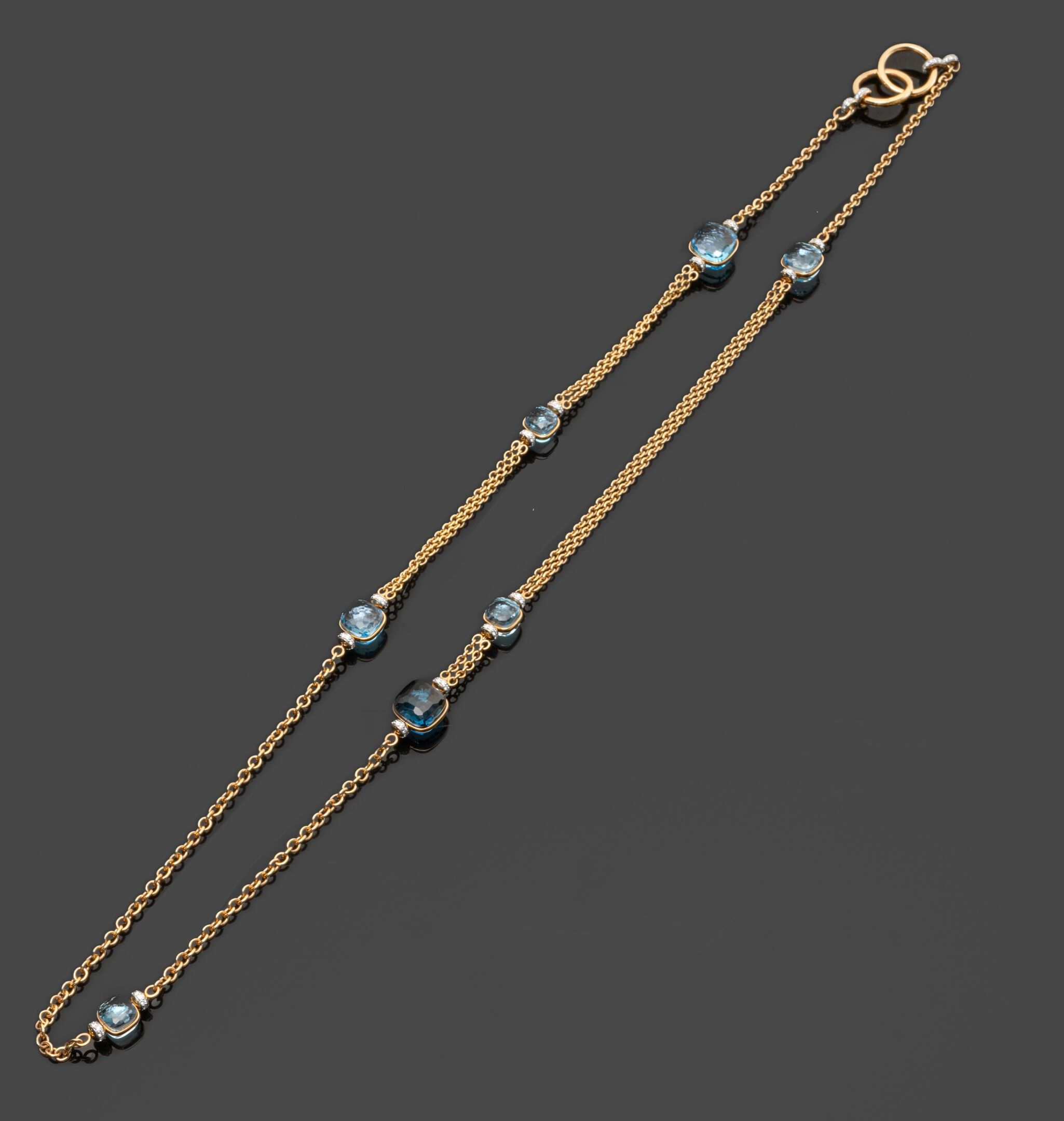 Necklace in 18K (750°/°°) yellow gold, "Nudo" collection, with oval mesh, set with briolette-cut cushion blue topazes and brilliant-cut diamonds. Signed and numbered