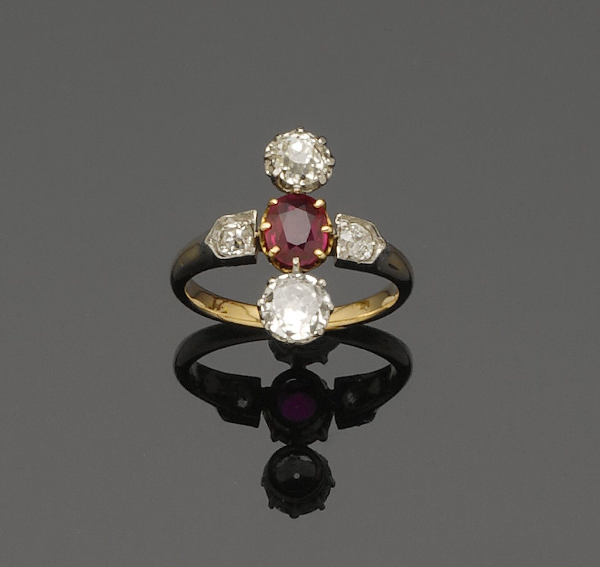 Antique ring in 18K (750°/°°) yellow gold centred on an oval synthetic ruby (probably later) set with two old-cut diamonds each approx. 0.50 ct, the attachments set with two old-cut diamonds each approx. 0.15 ct (slight lack of material), the settings probably on platinum (850°/°°)
