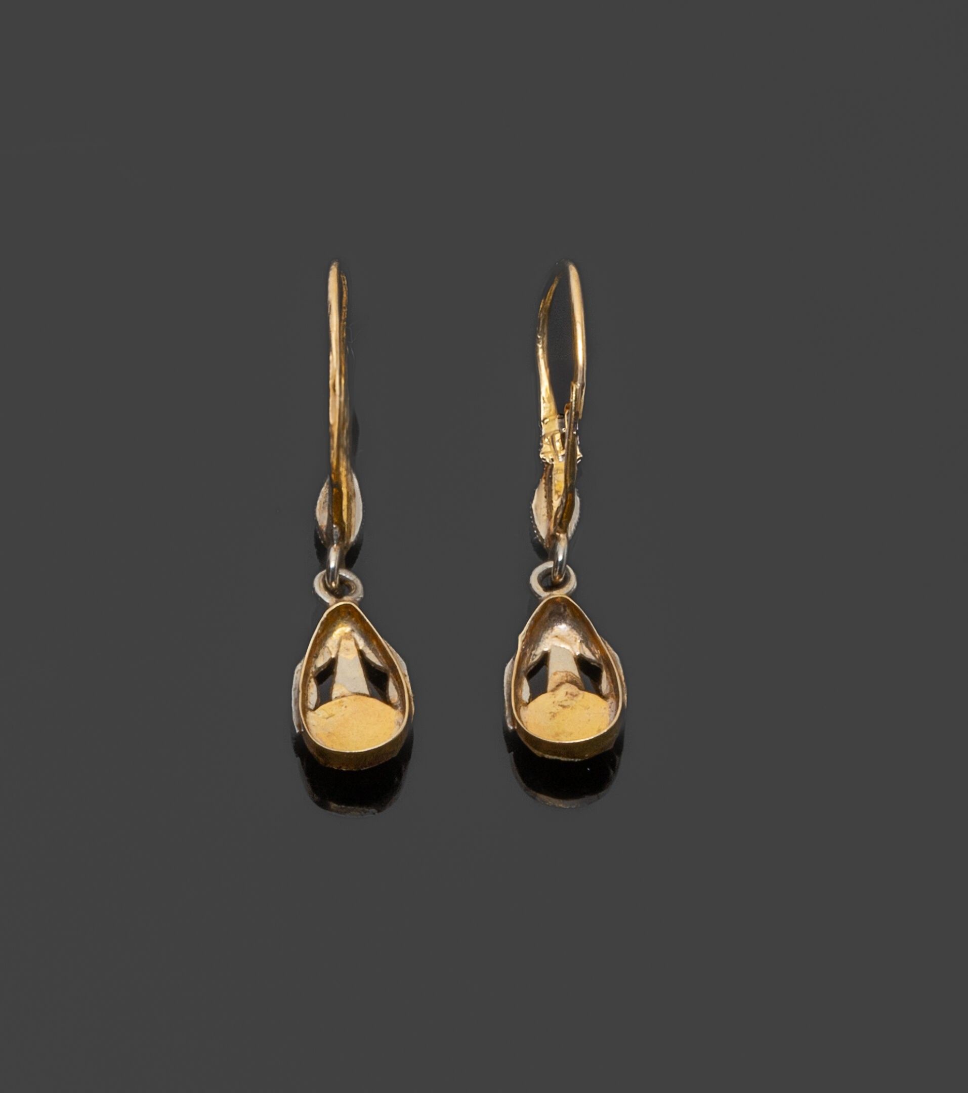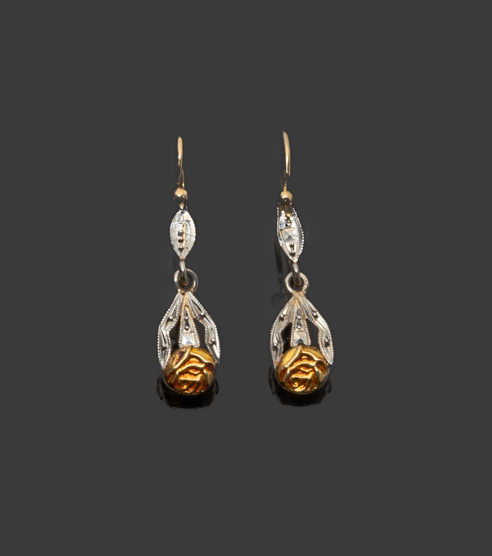 Pair of three-tone articulated dormeuses in 18K (750°/°°) gold, each holding an openwork drop motif depicting a rose.
