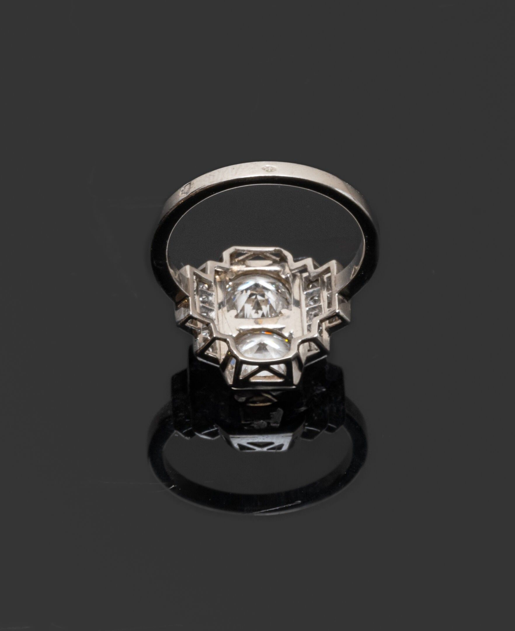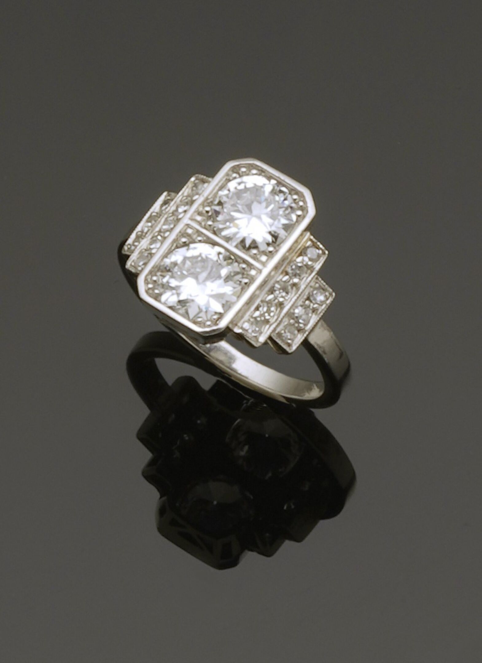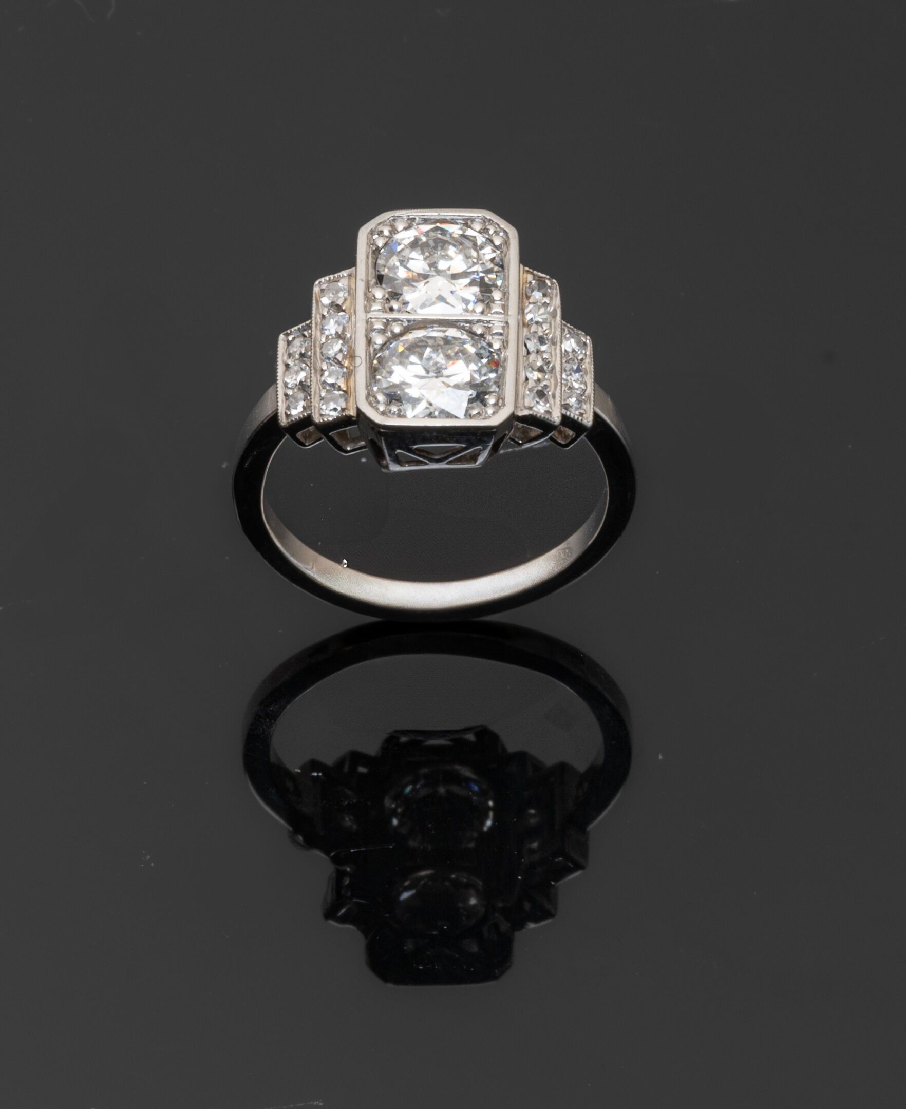 Ring in platinum (850°/°°), the rectangular cut-side plate set with two half-cut diamonds, together calibrating approximately 1.60 ct, shouldered by tiers set with lines of 8x8 diamonds.