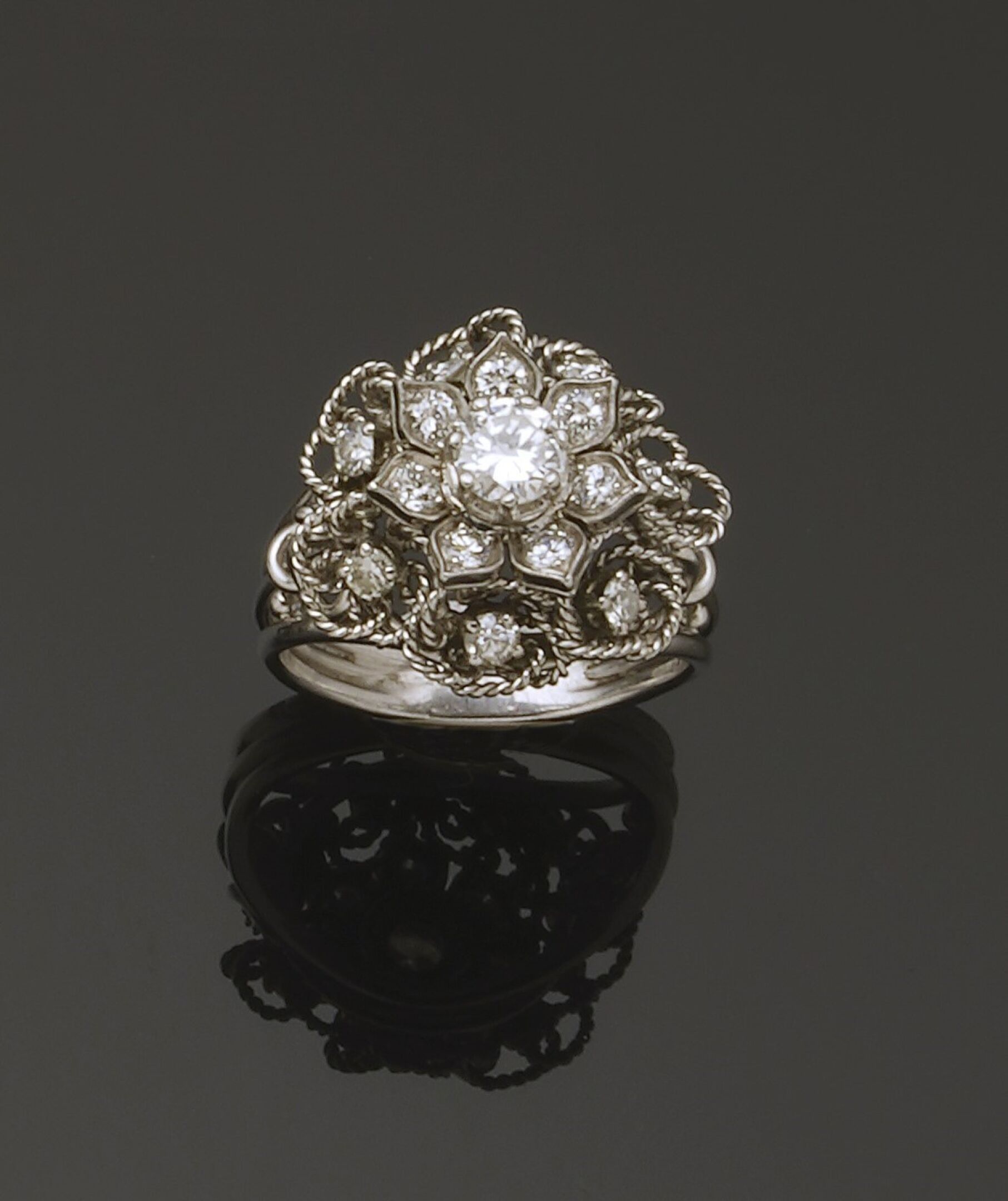 Ring in platinum (850°/°°) with wires, decorated with twists and balls, the plate forming a rosette centred on a flower set with a brilliant-cut diamond of approximately 0.50 ct in a surround of round diamonds.