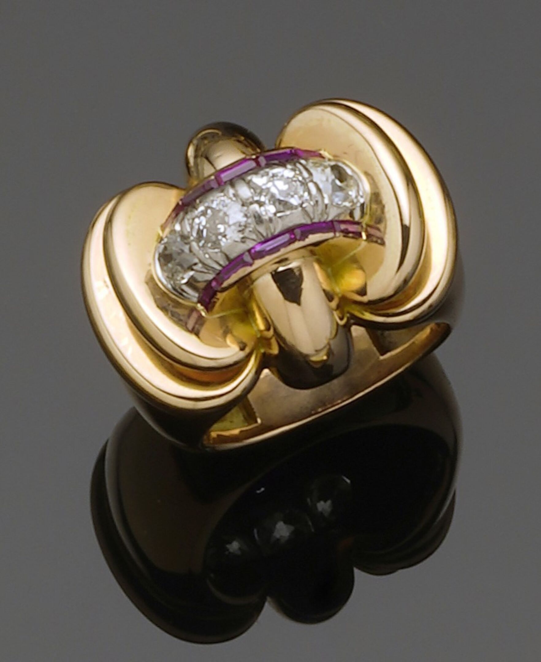 Ring in smooth 18K (750°/°°) yellow gold, with an open book geometric design centred on a "bridge" set with a line of 4 old-cut diamonds each approx. 0.20 ct (a tiny accident) set on platinum (850°/°°), shouldered with synthetic baguette rubies (a crack)