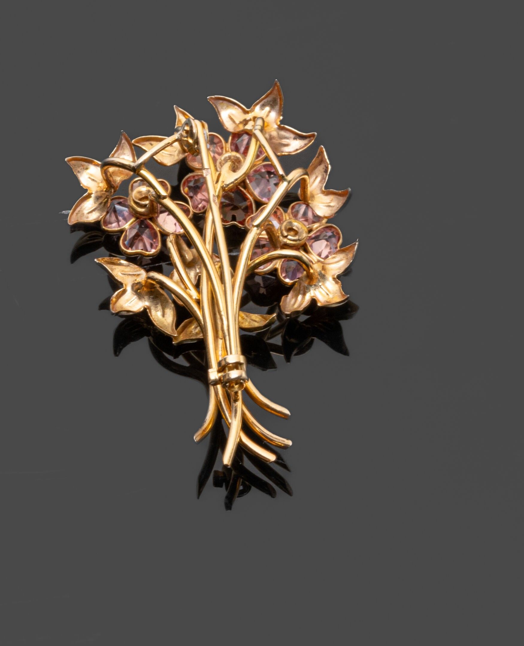 Brooch in 18K (750°/°°) yellow gold, depicting a bouquet of three flowers whose petals are set with heart-shaped synthetic pink imitation stones.