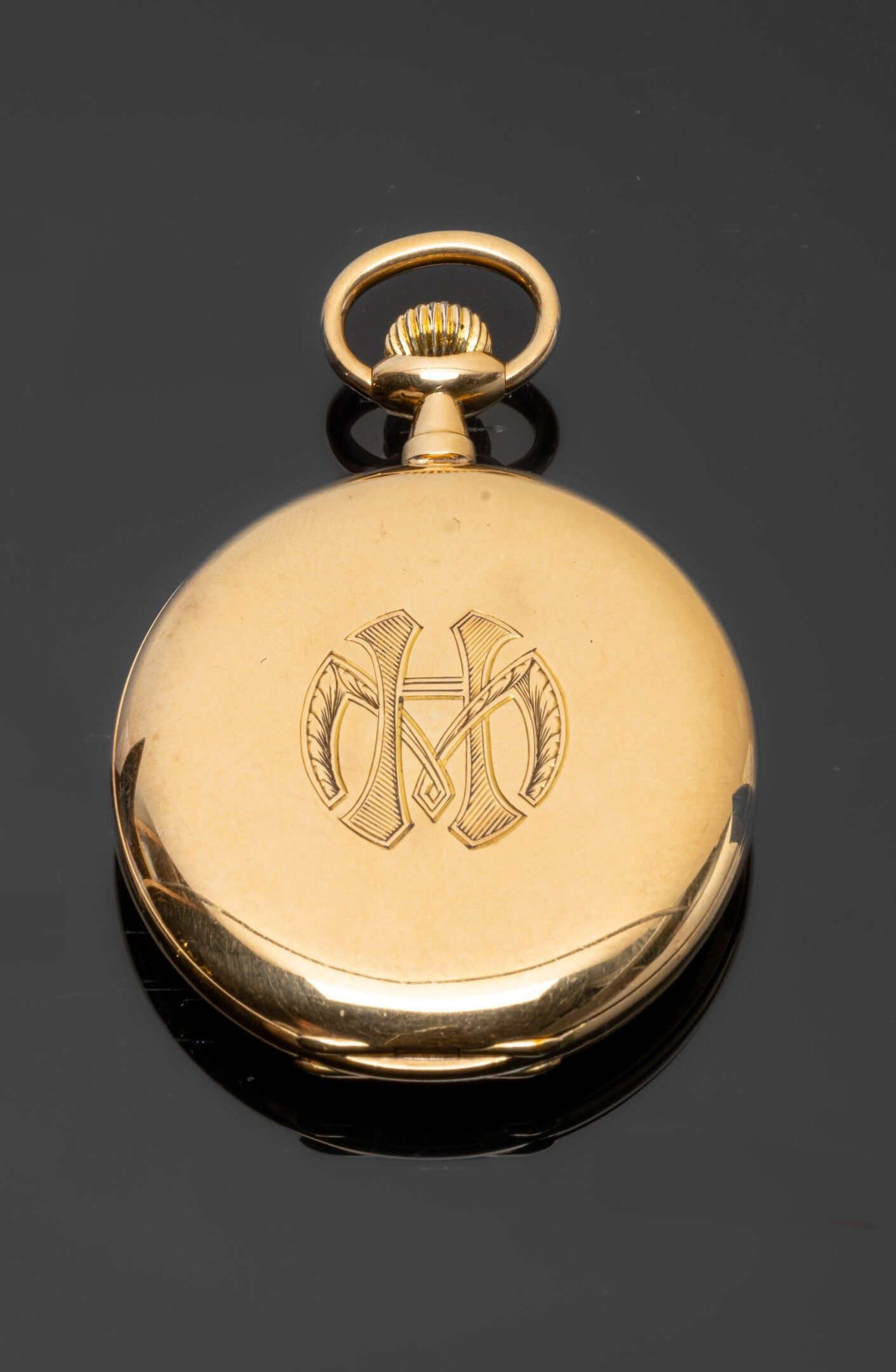Savonnette pocket watch in 18K (750°/°°) yellow gold, round dial with gilt background (soiled), black (small missing) and red Arabic numerals, second hand at 6 o'clock, mechanical winding movement. The double case in 18K (750°/°°) yellow gold, smooth back, monogrammed "M.H" on the front.