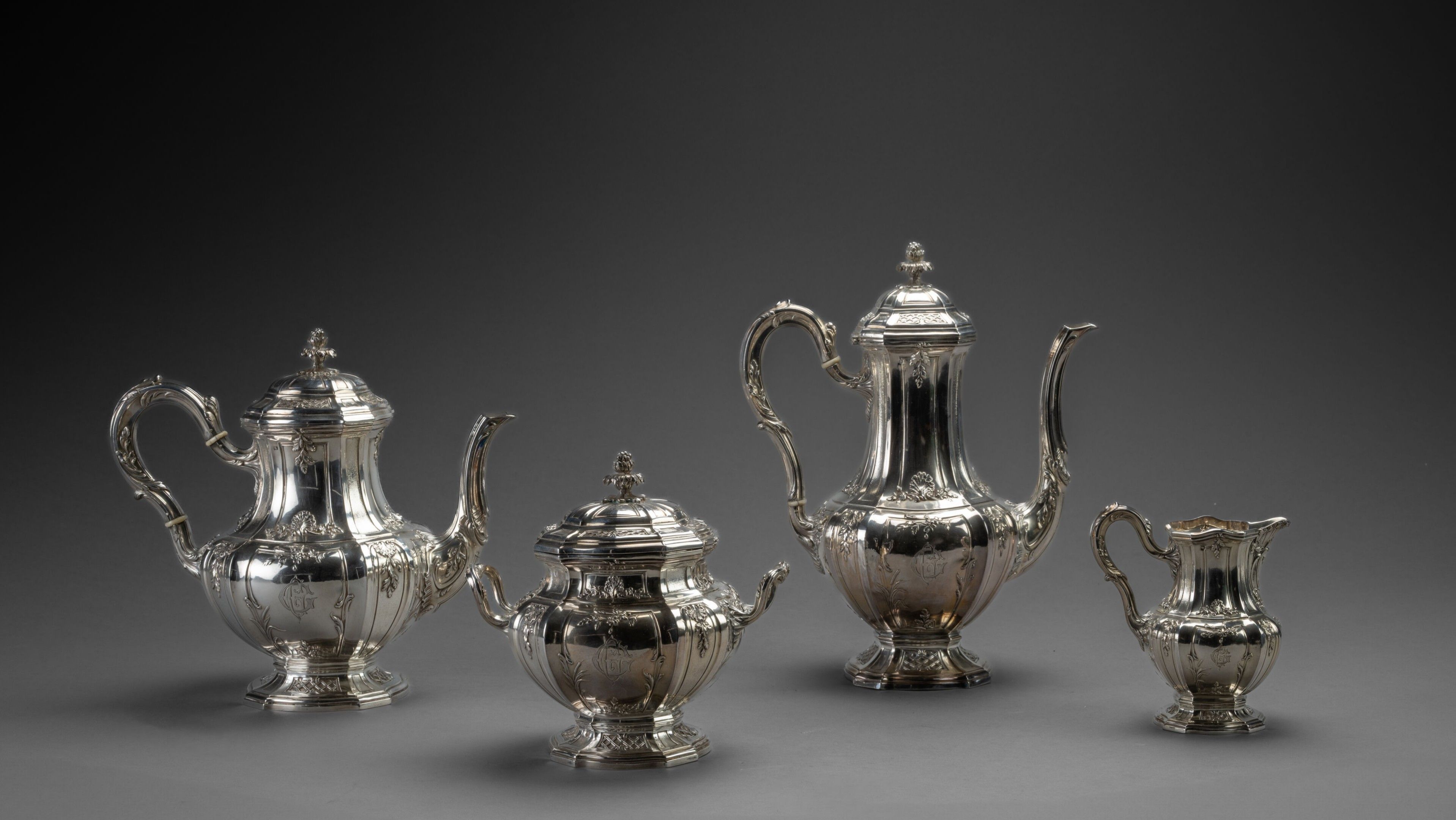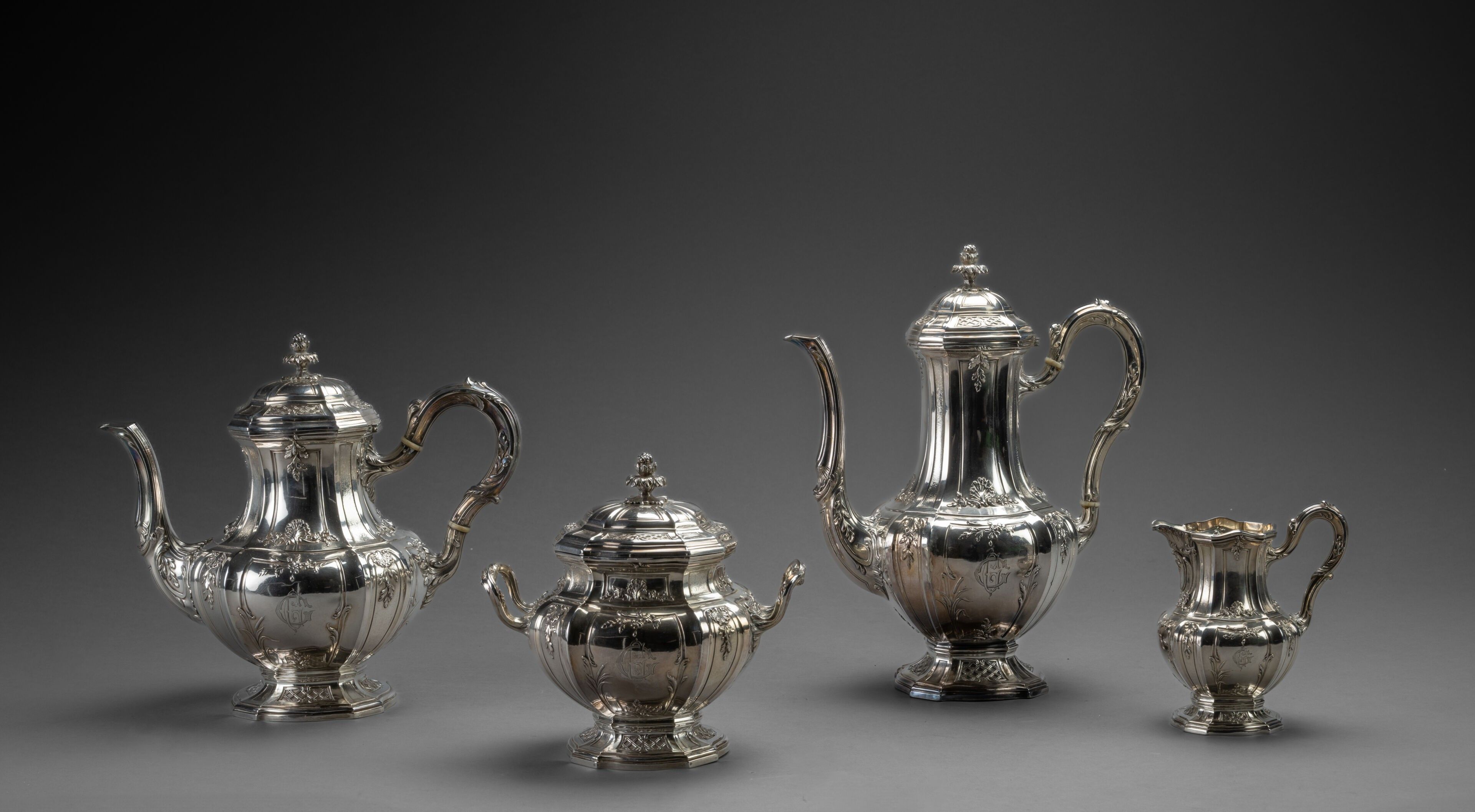 Large silver baluster-shaped tea and coffee service with panels and fluting, decorated with fleurons and shells, the pedestal with panels and lattice work like the lid, handle and spout with foliage, engraved CG, comprising a coffee pot, a teapot, a covered sugar bowl and a milk jug. Minerve First Title Master-Smith : Eugène DOUTRE-ROUSSEL Weight : 2 274 g BL