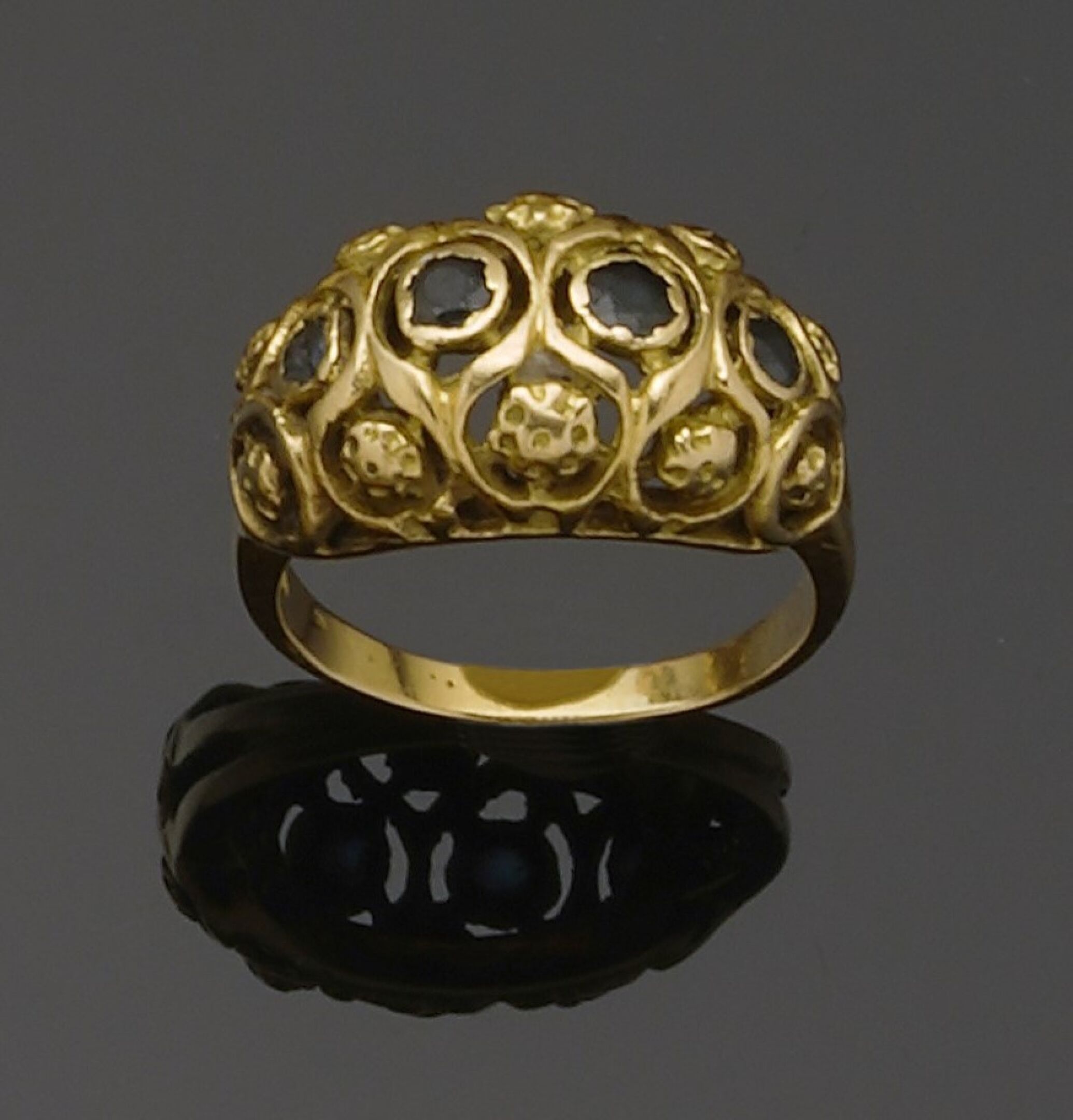 Ring in 18K (750°/°°) yellow gold, the central part convex and openwork set with 4 round sapphires (significant wear and chips) in closed setting