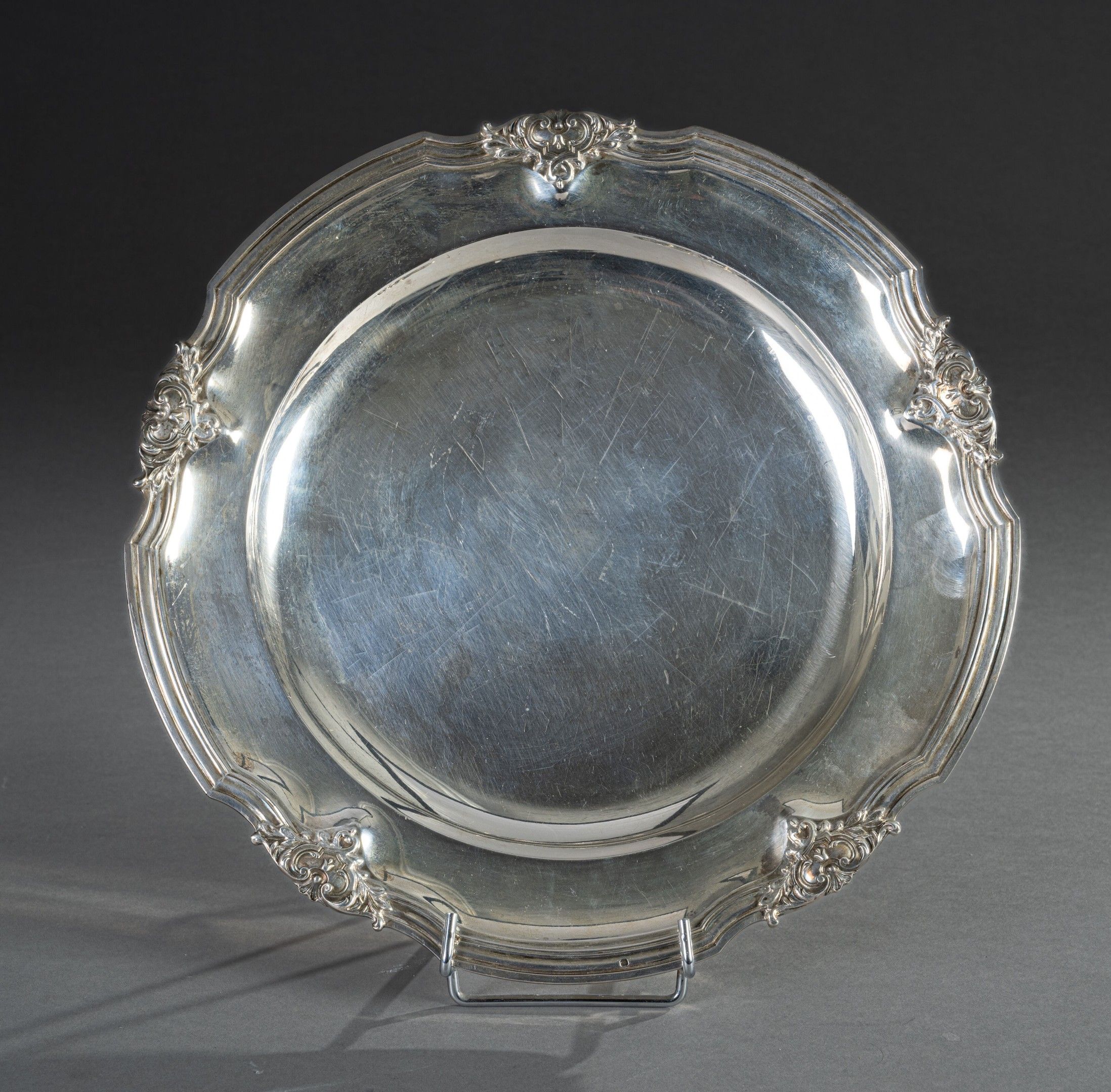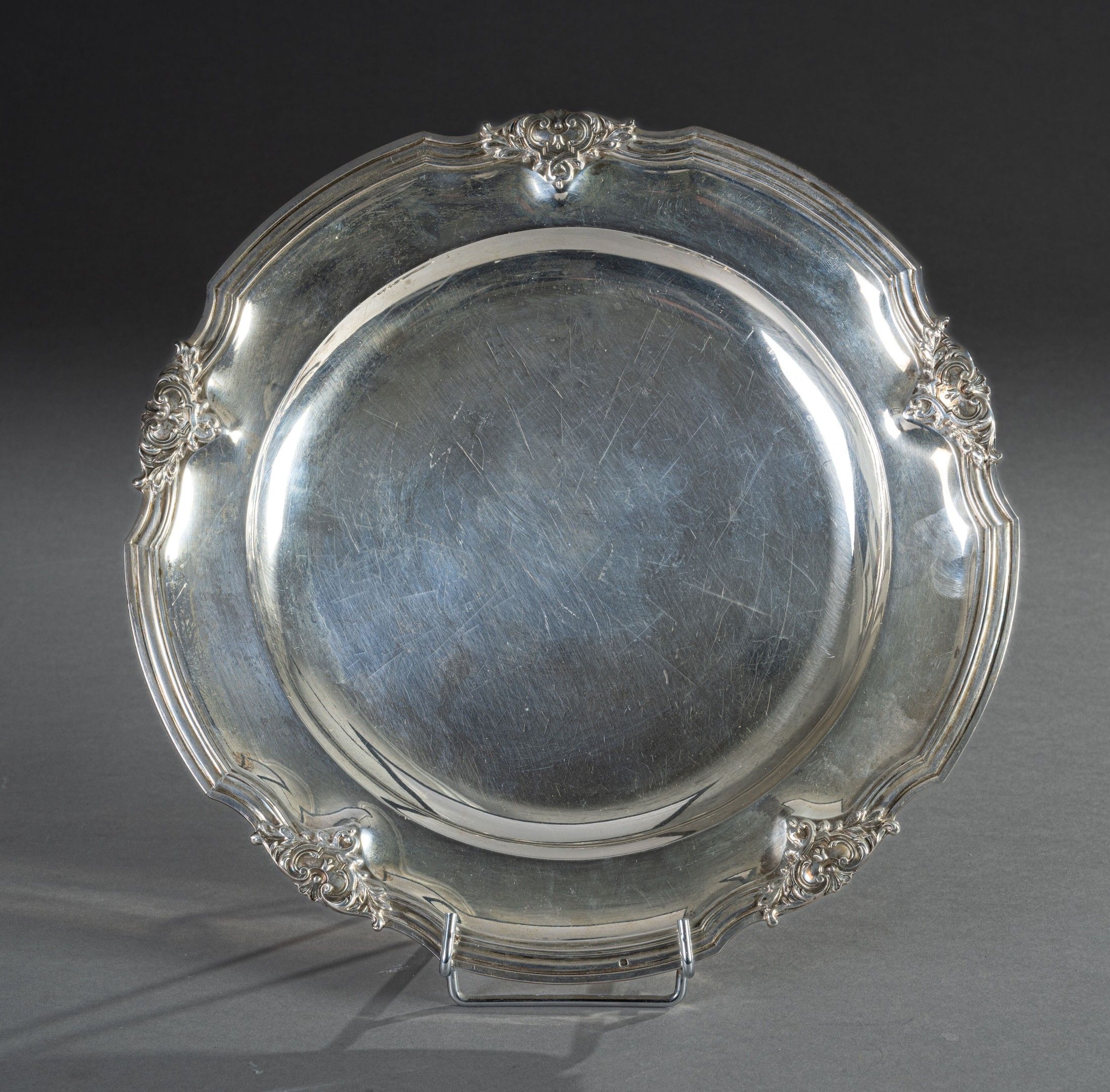 A circular silver dish with five contours punctuated with foliate scrollwork and a cartouche decorated with a fleuron.
