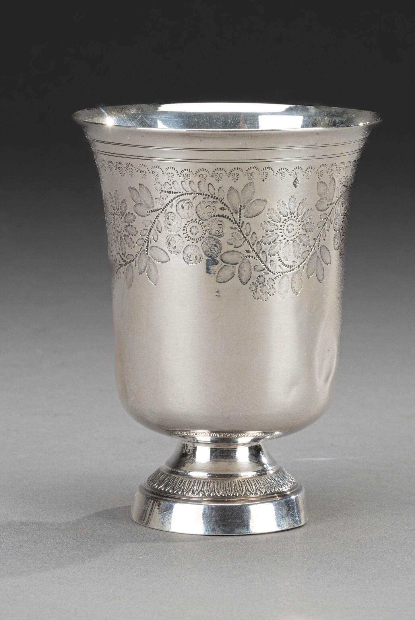 A silver tulip-shaped tumbler engraved with a garland of flowers, the pedestal with a frieze of laurel leaves and fruit.