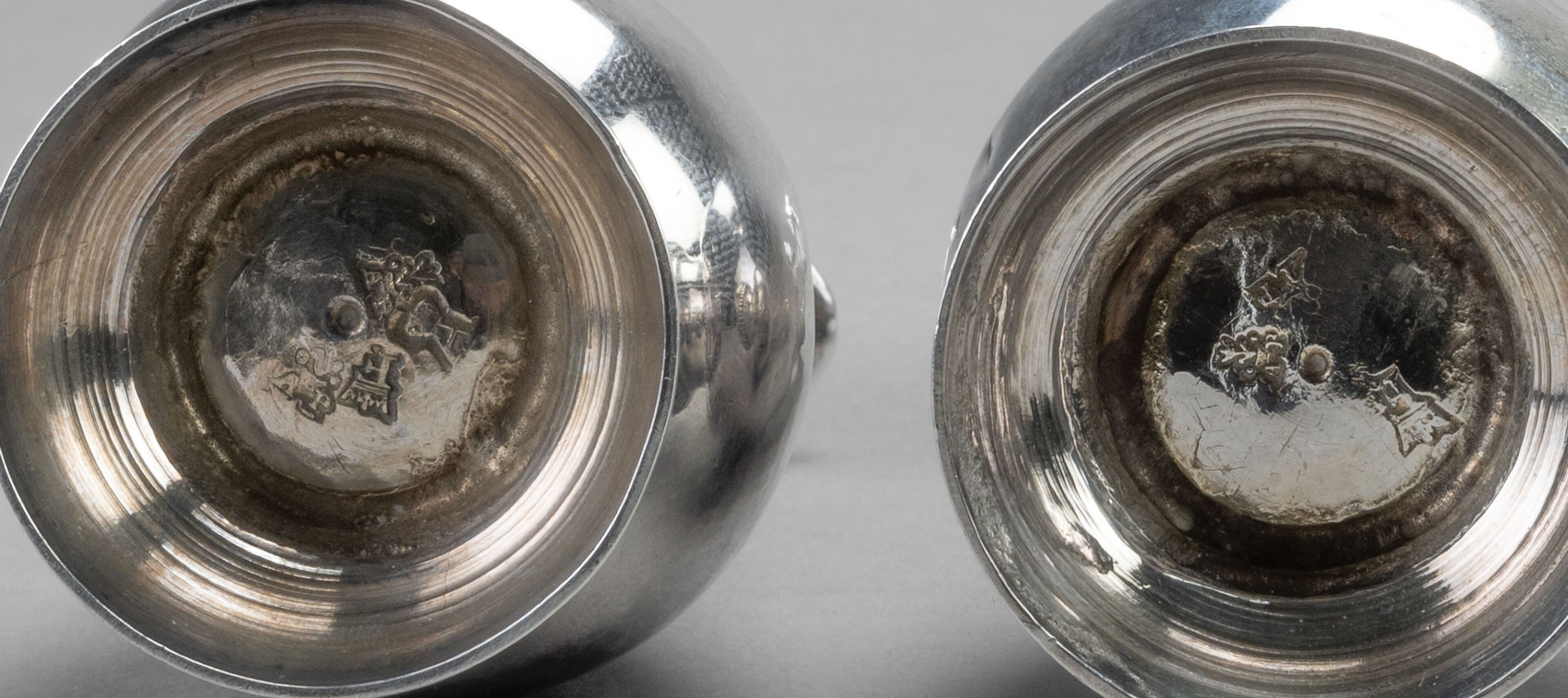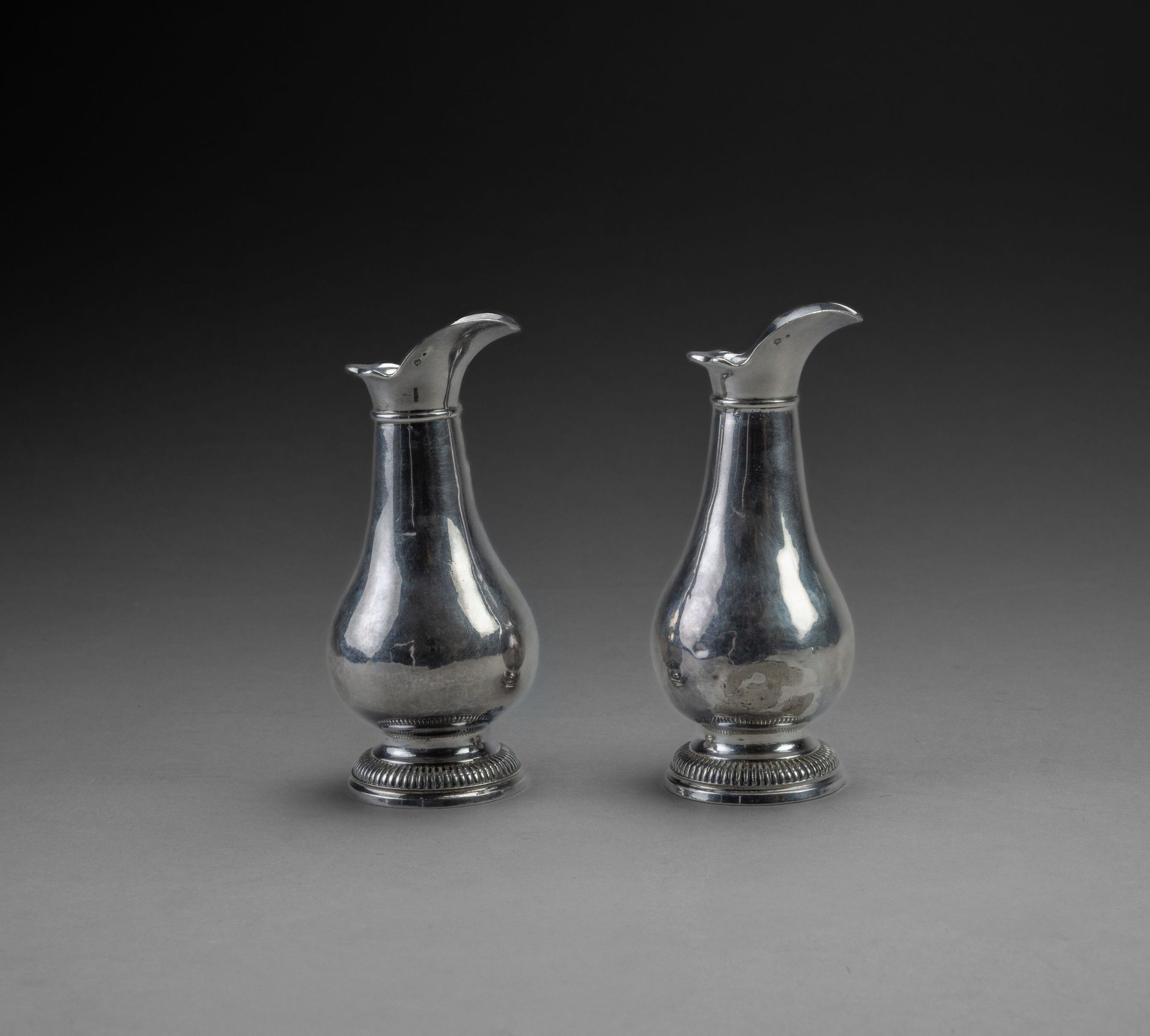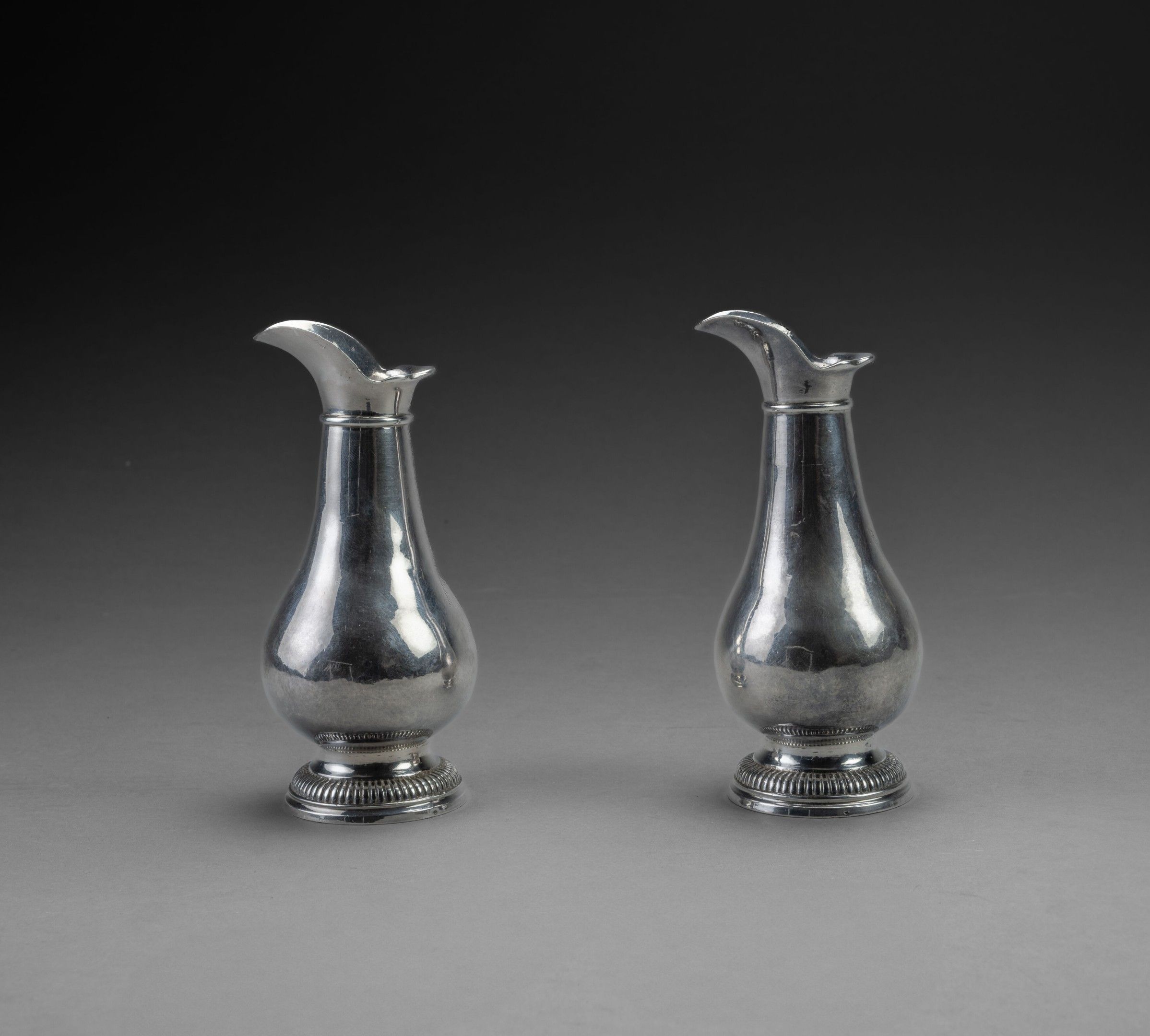 Pair of plain silver baluster cruets on gadrooned pedestals