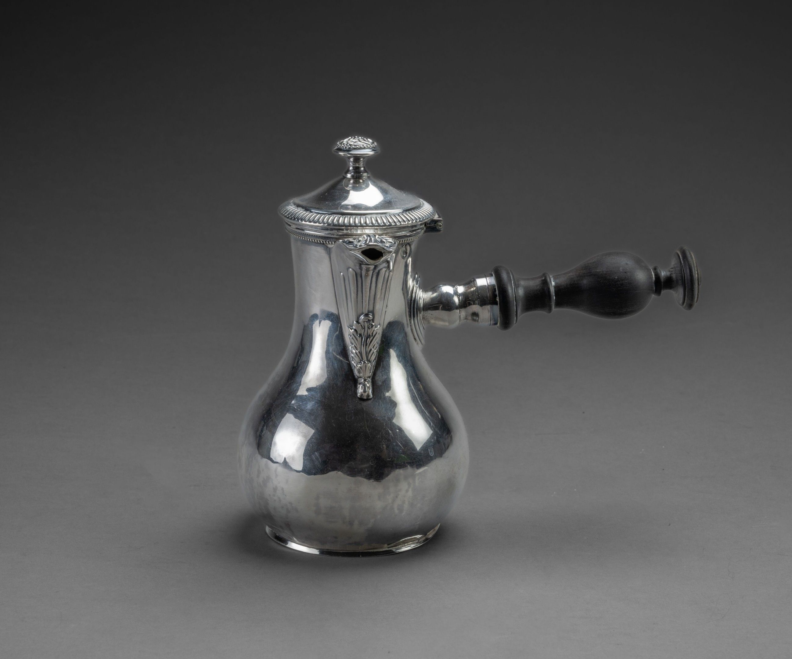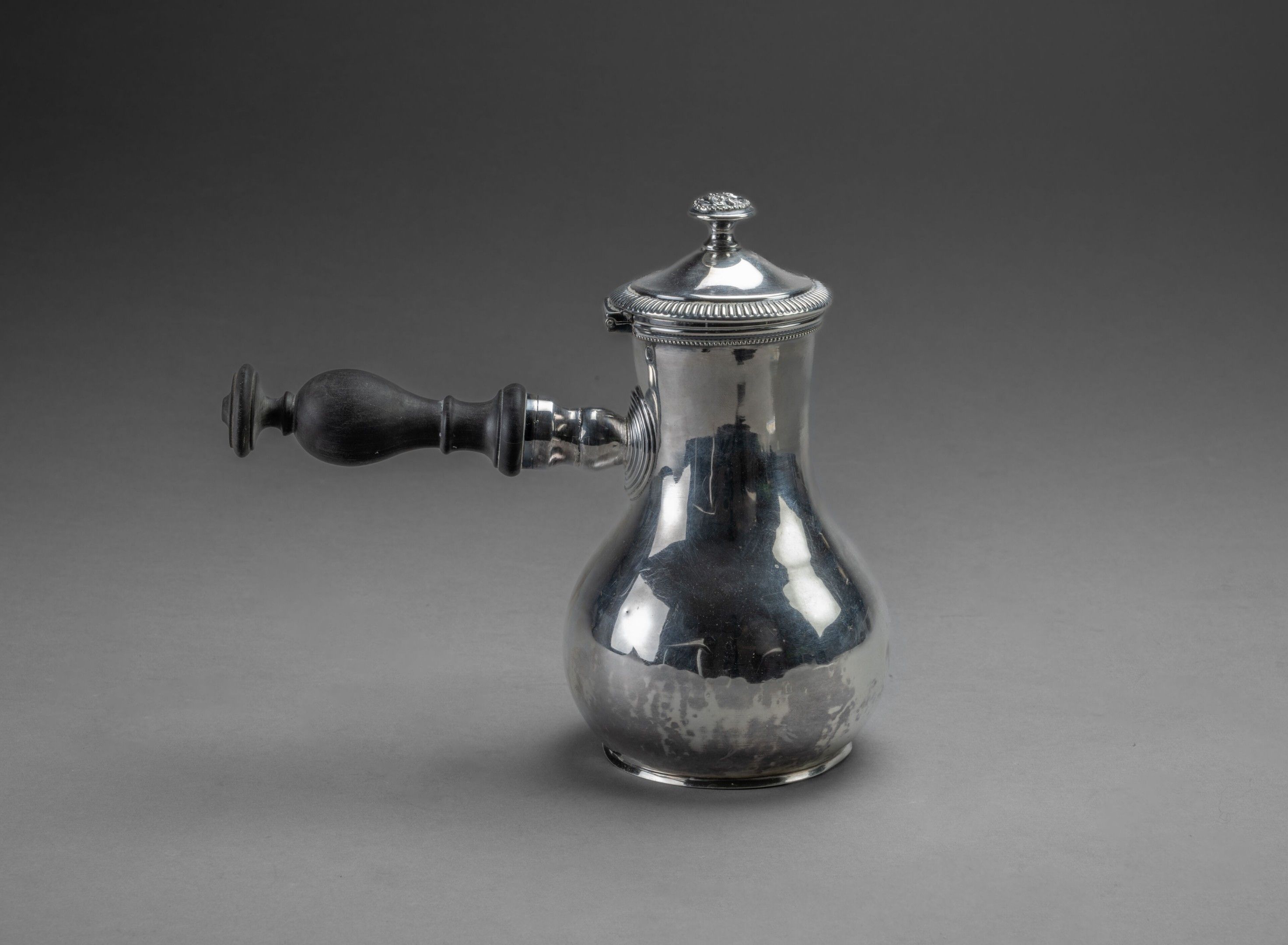 Baluster coffee pot in plain silver on a small frame, the lid gadrooned, the spout fluted with foliage, straight turned wooden handle