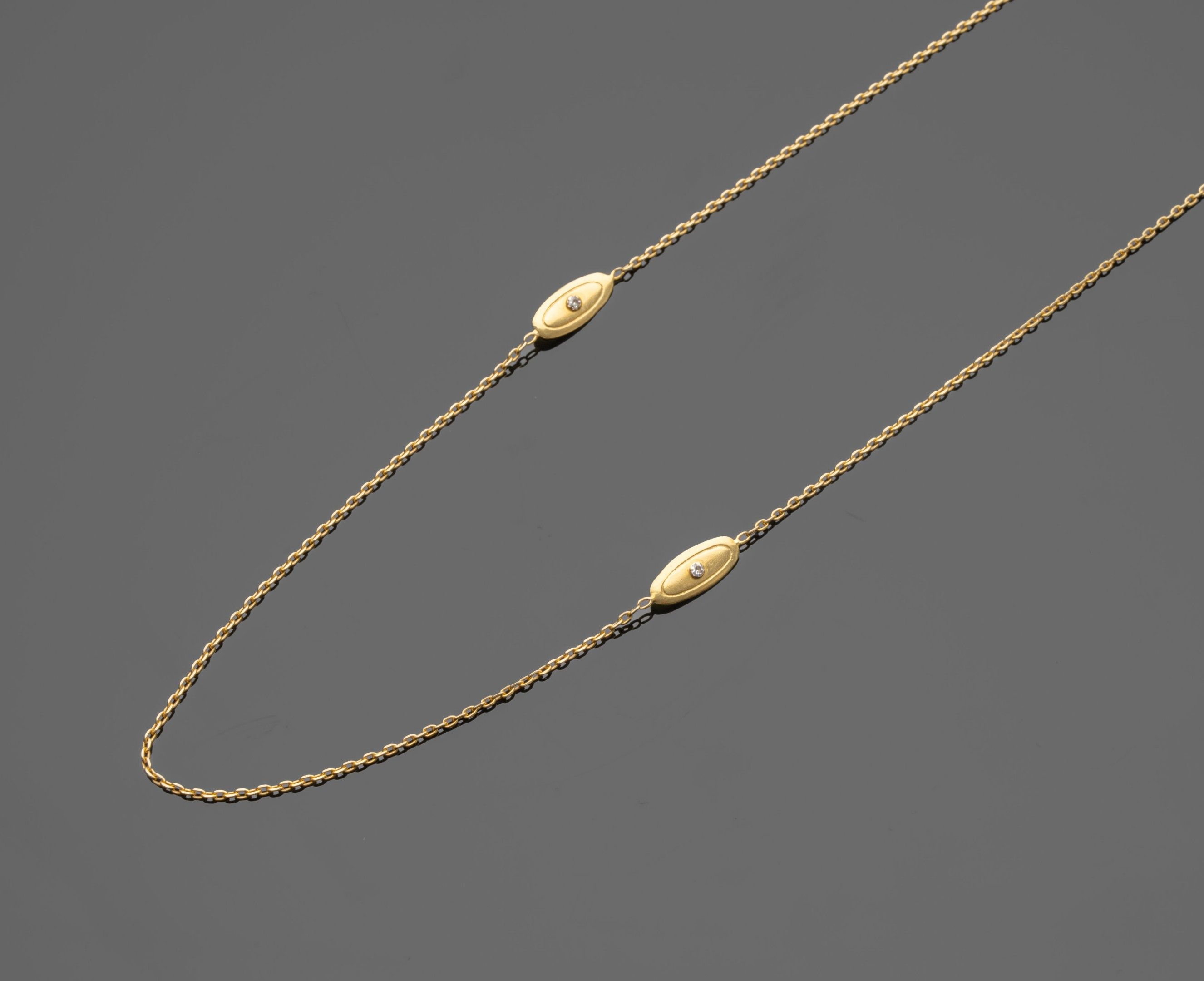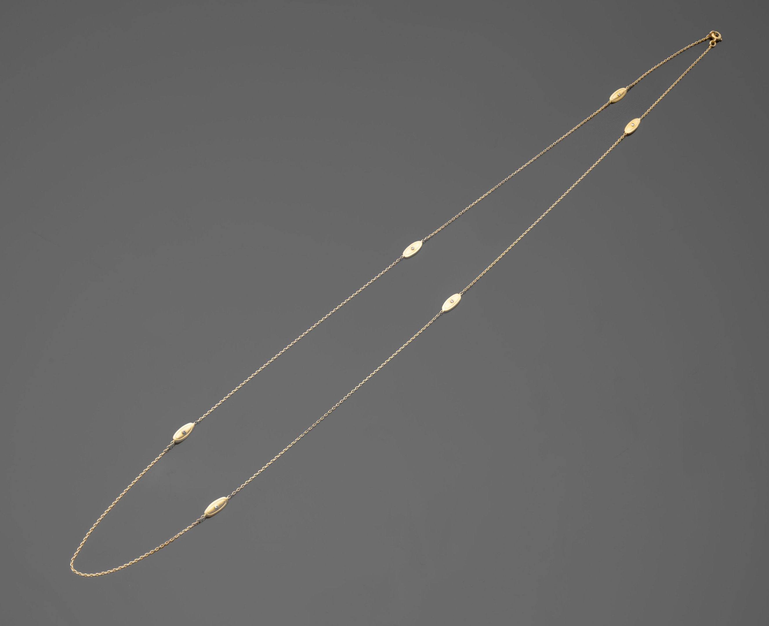 Long necklace in 18K (750°/°°) yellow gold with forçat stitch, embellished with six navette motifs each set with an 8x8-cut diamond (slight accidents) on each side.