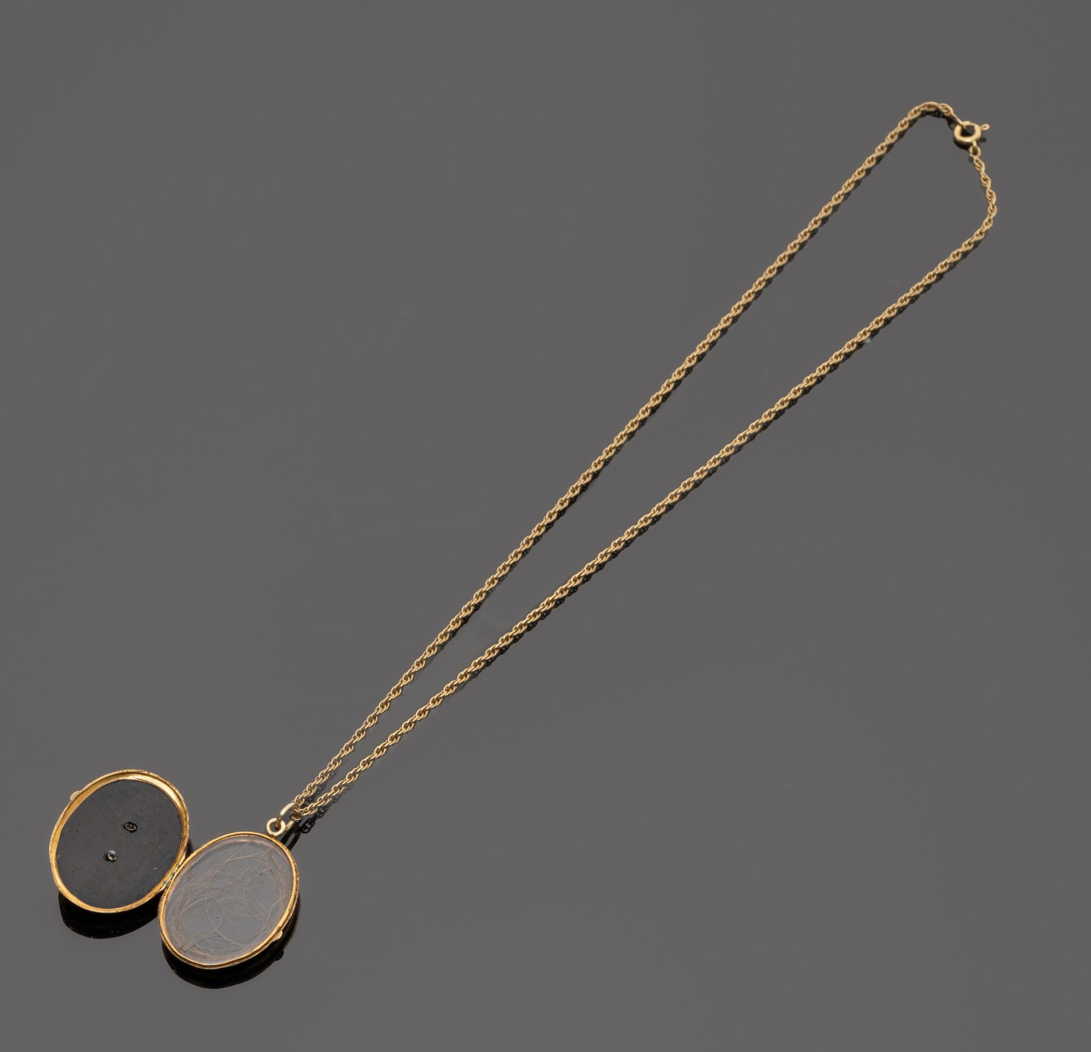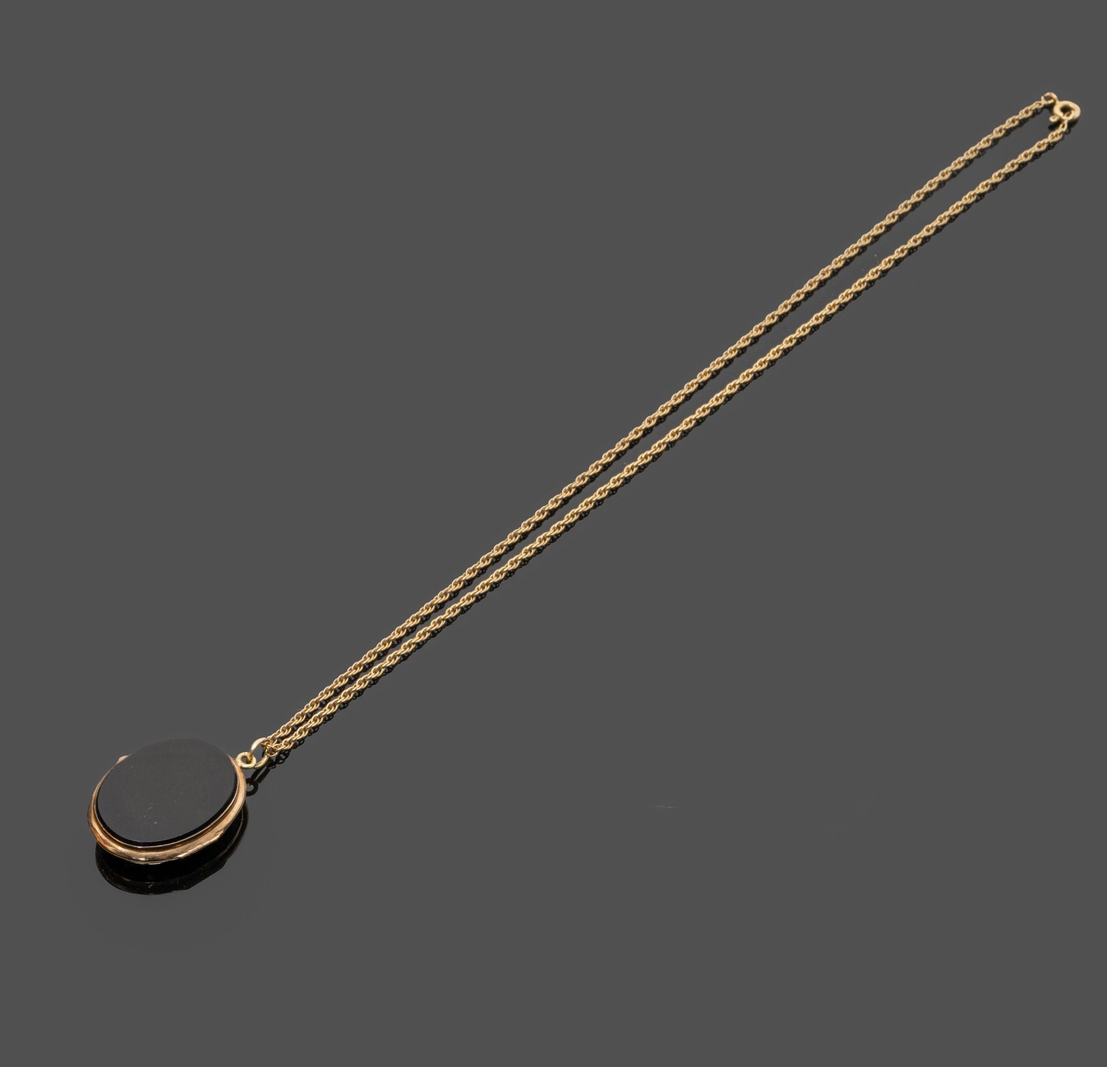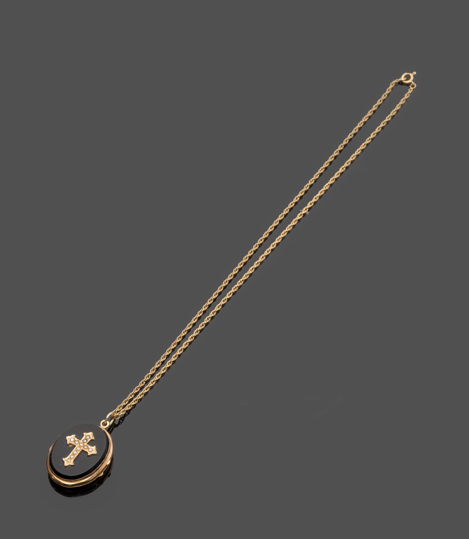 Oval openwork pendant in 18K (750°/°°) yellow gold, set with two onyx plaques, one pierced with a cross motif set with lines of half-pearls (one later). Inner glass and lock of hair. It is held by a twisted 18K (750°/°°) yellow gold chain, length: 46 cm approx.