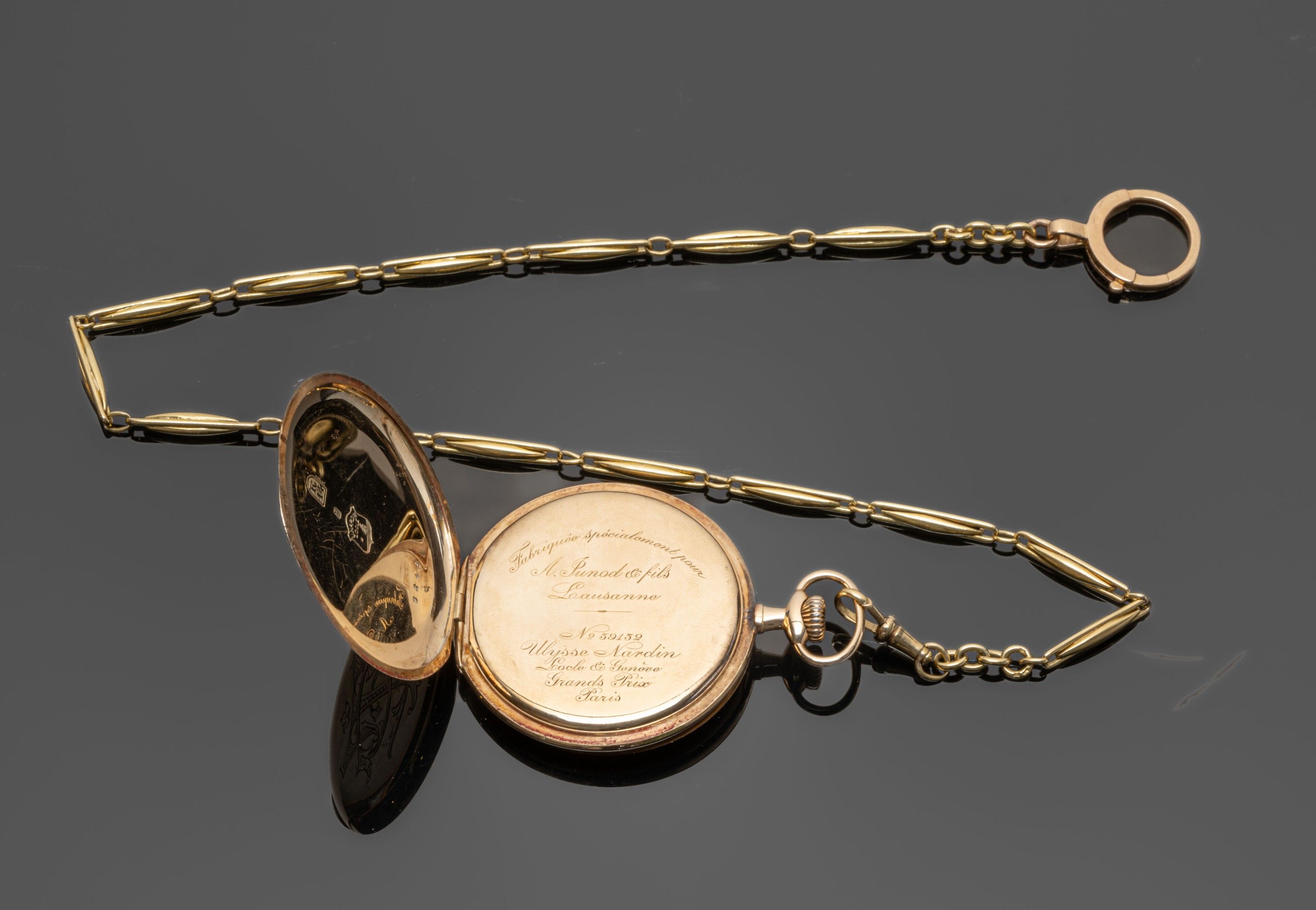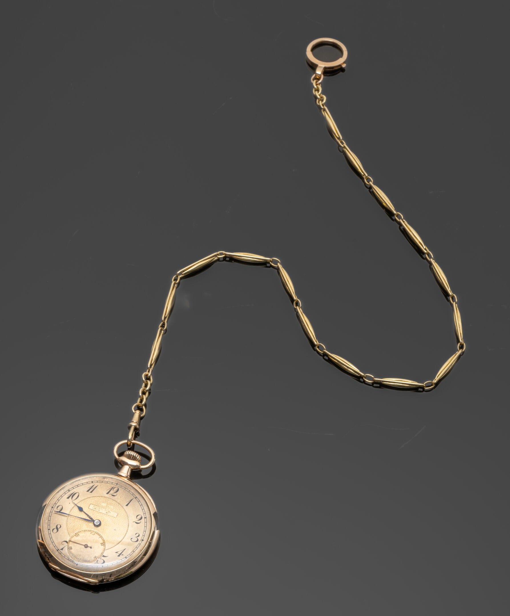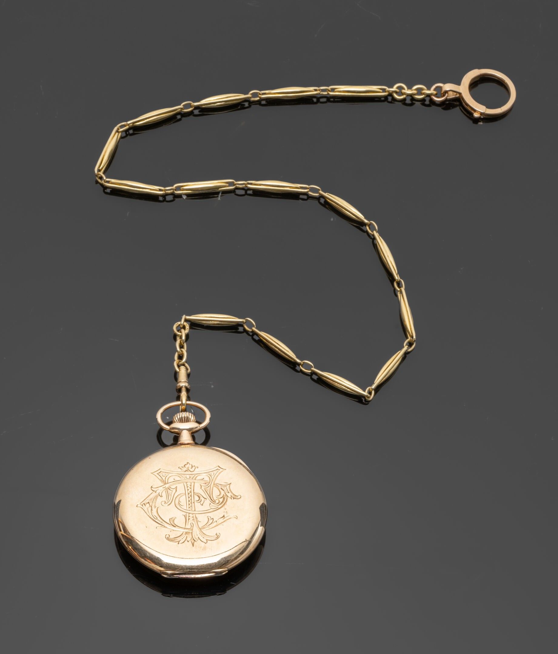 Pocket watch in 14K (585°/°°) yellow gold, round dial with gilded background and guilloché central motif (patina, discolouration and slight soiling), signature virtually effaced, second hand at 6 o'clock, black Arabic numerals (small missing), mechanical winding movement (signed and numbered). The double bowl in 14K (585°/°°) yellow gold, signed "Manufactured especially for A.PUNOD & Fils, Lausanne - N° 59132 Ulysse NARDIN Locle & Genève", the back decorated with a monogram.