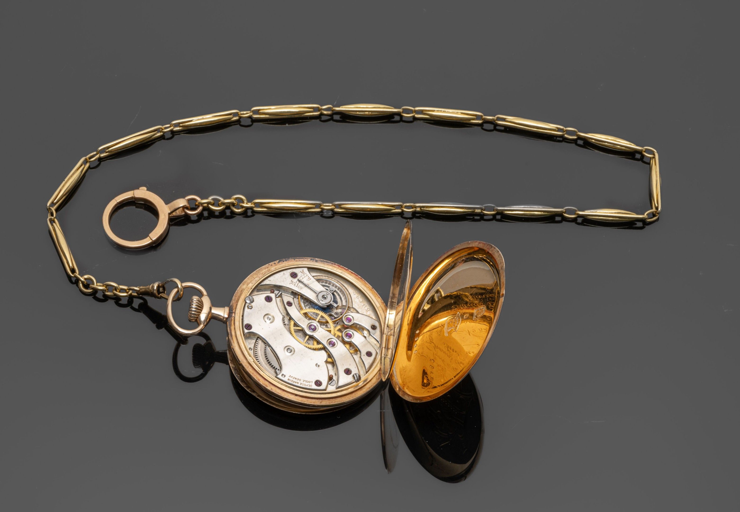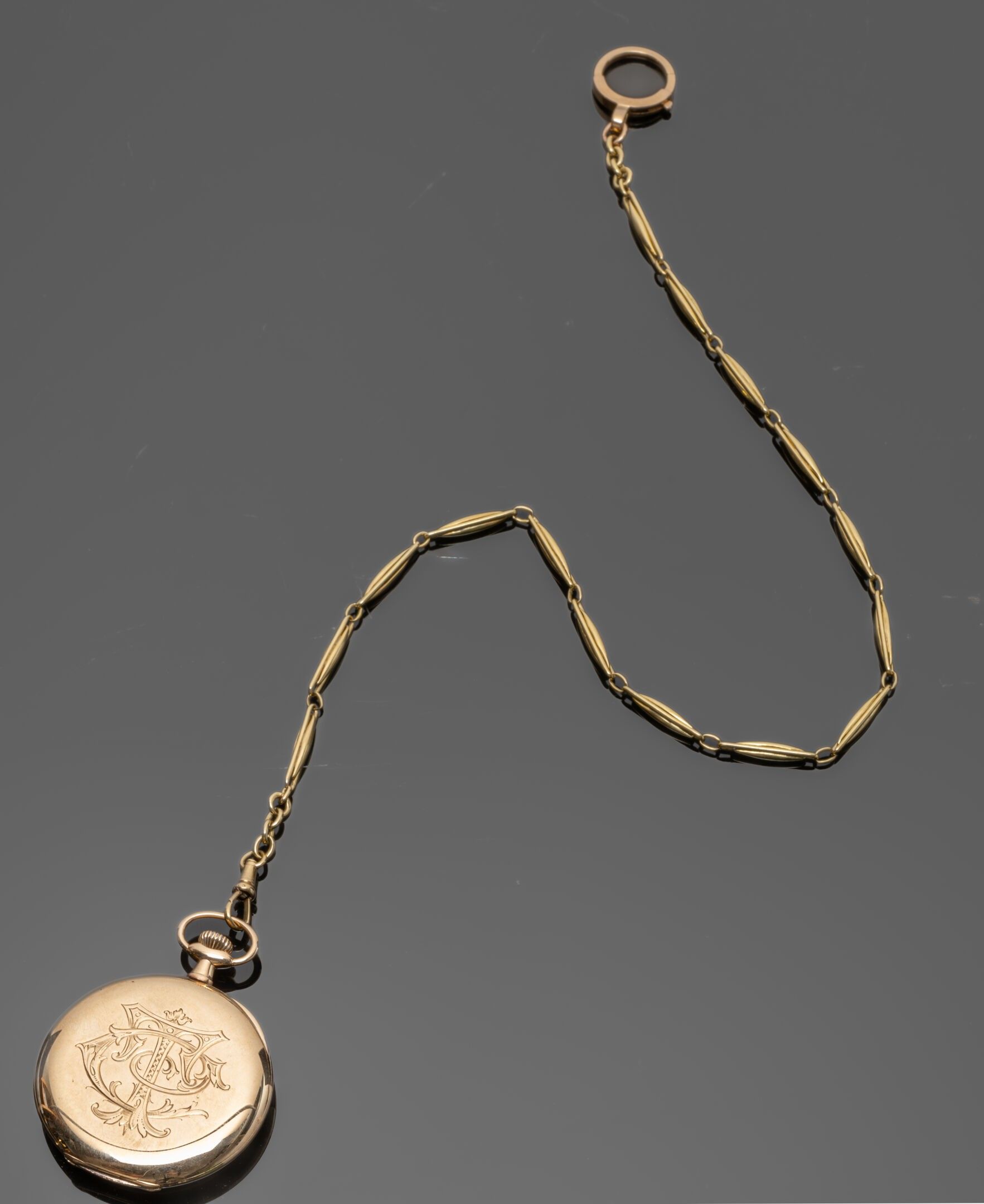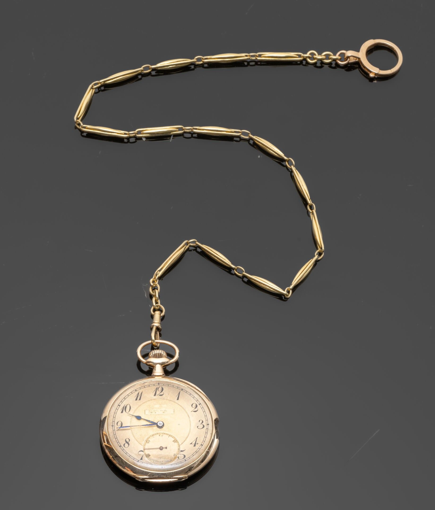 Pocket watch in 14K (585°/°°) yellow gold, round dial with gilded background and guilloché central motif (patina, discolouration and slight soiling), signature virtually effaced, second hand at 6 o'clock, black Arabic numerals (small missing), mechanical winding movement (signed and numbered). The double bowl in 14K (585°/°°) yellow gold, signed "Manufactured especially for A.PUNOD & Fils, Lausanne - N° 59132 Ulysse NARDIN Locle & Genève", the back decorated with a monogram.