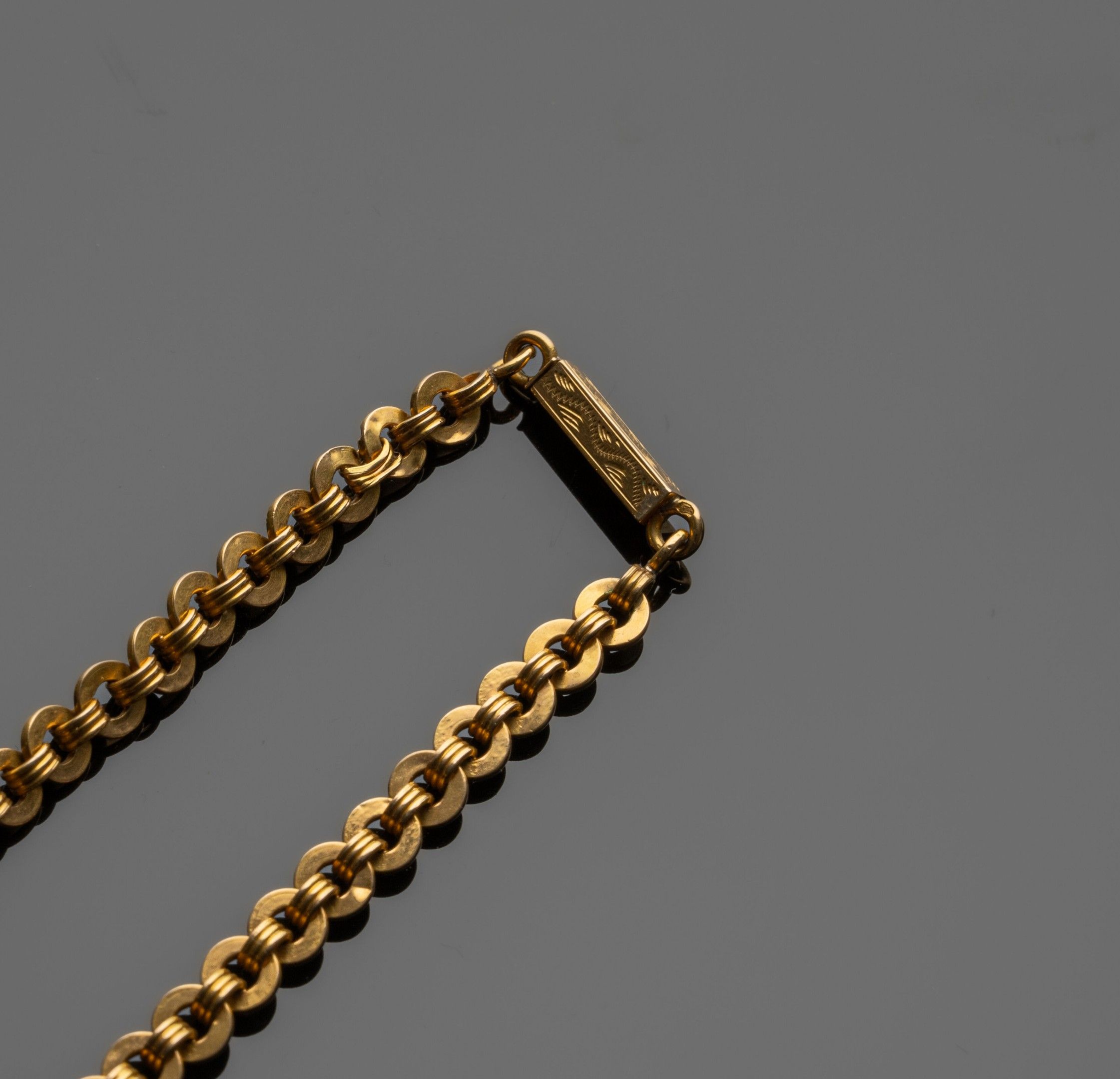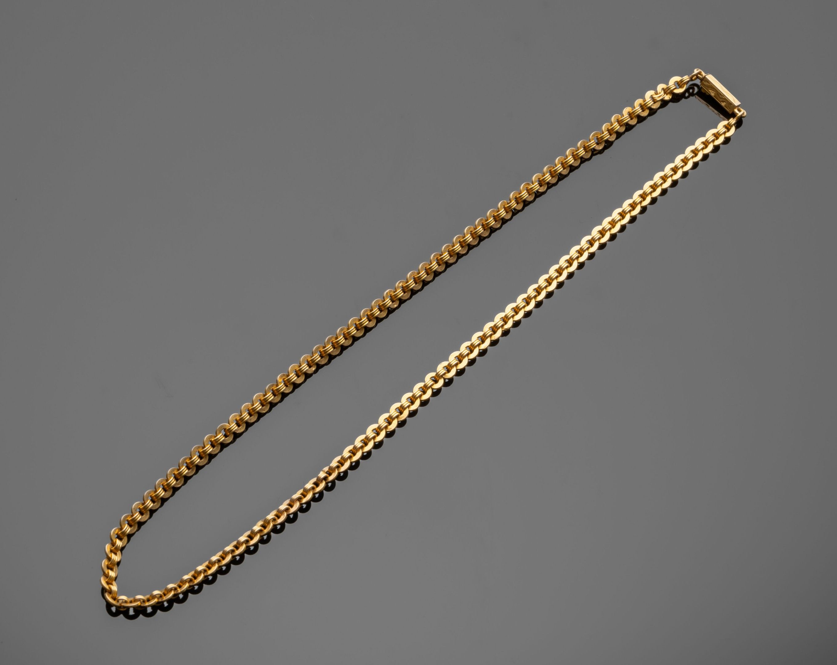 Antique chain in 18K (750°/°°) yellow gold with flat jaseron mesh and alternating triple gadroons. Slight deformations