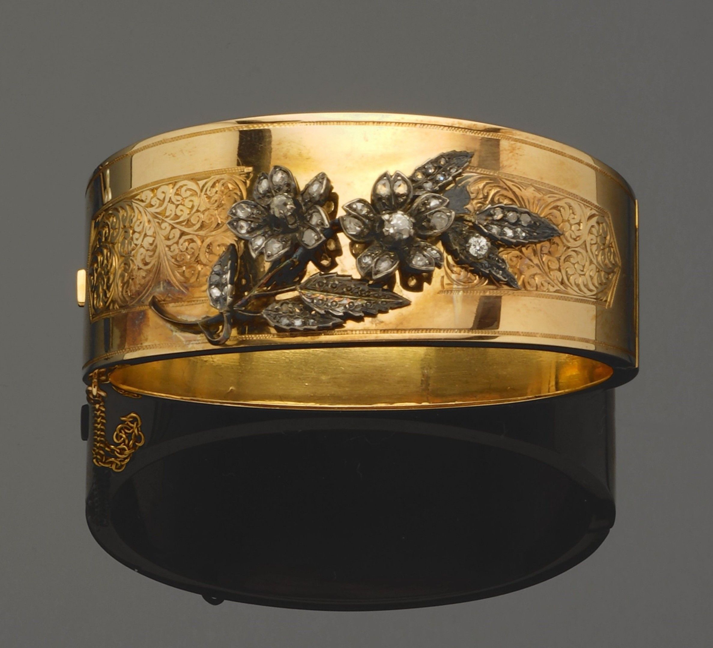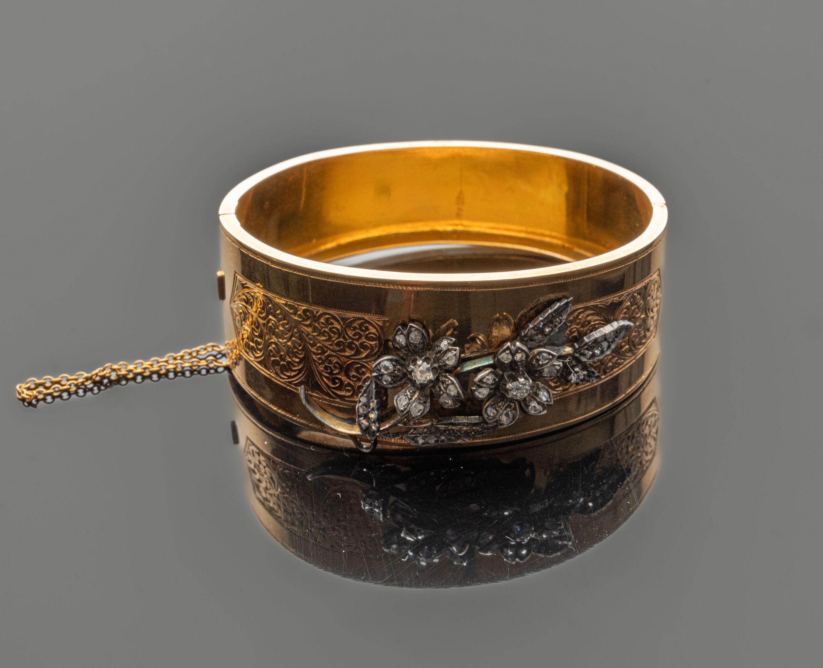 Antique 18K (750°/°°) smooth yellow gold flat opening bangle bracelet, the central part decorated with plant scrolls, adorned with a branch with double flowers (one leaf missing) in silver (800°/°°), set with rose-cut diamonds (slight accidents) as well as two old-cut diamonds and one modern-cut diamond (attached?). Minute traces of tin soldering. With its safety chain.