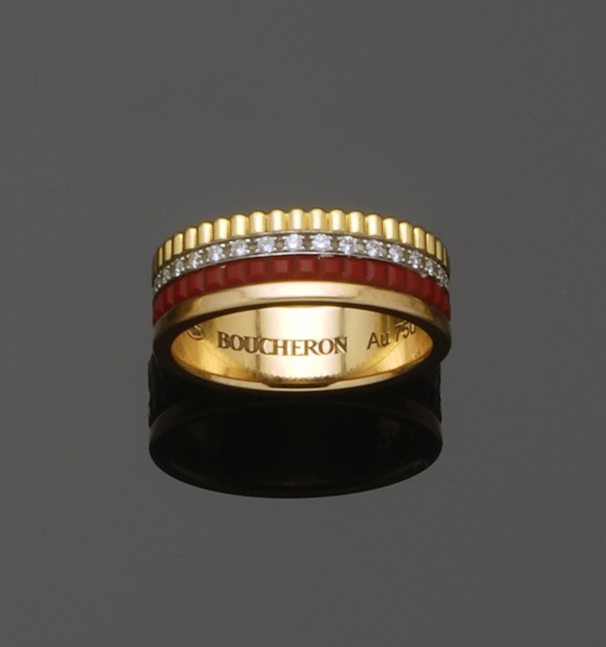 Premium BOUCHERON Ring in 18K (750°/°°) three-tone gold, "Quatre Red…