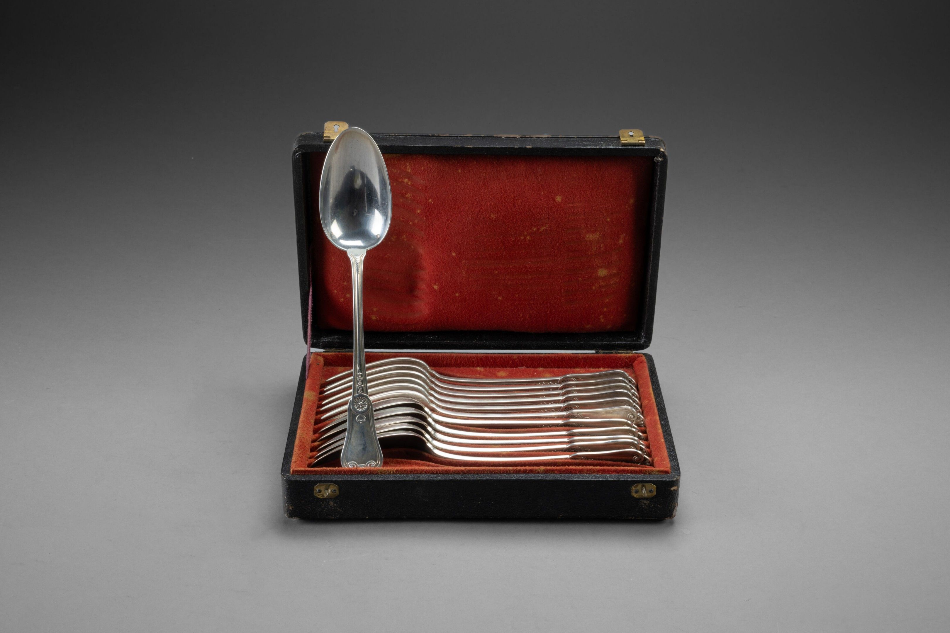 Set of six large silver cutlery pieces, Regency style with shell clasp, engraved