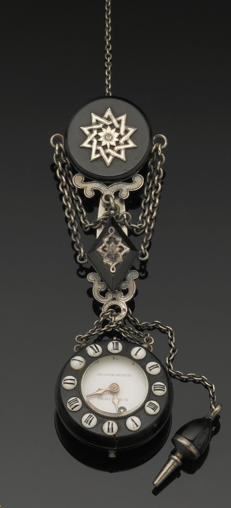 Mourning chain in silver (800°/°°) and tropical wood or ebonite, with round and lozenge motifs linked by chains and decorated with geometric and plant motifs, holding a watch, with opening case (cracks and small accidents) decorated with gilt metal, the bezel with white cartouches and black Roman numerals, round dial, signed, with black Arabic numerals, mechanical key winding movement (key supplied as pendant, movement signed). Case diameter approx. 40 mm, monogrammed back.