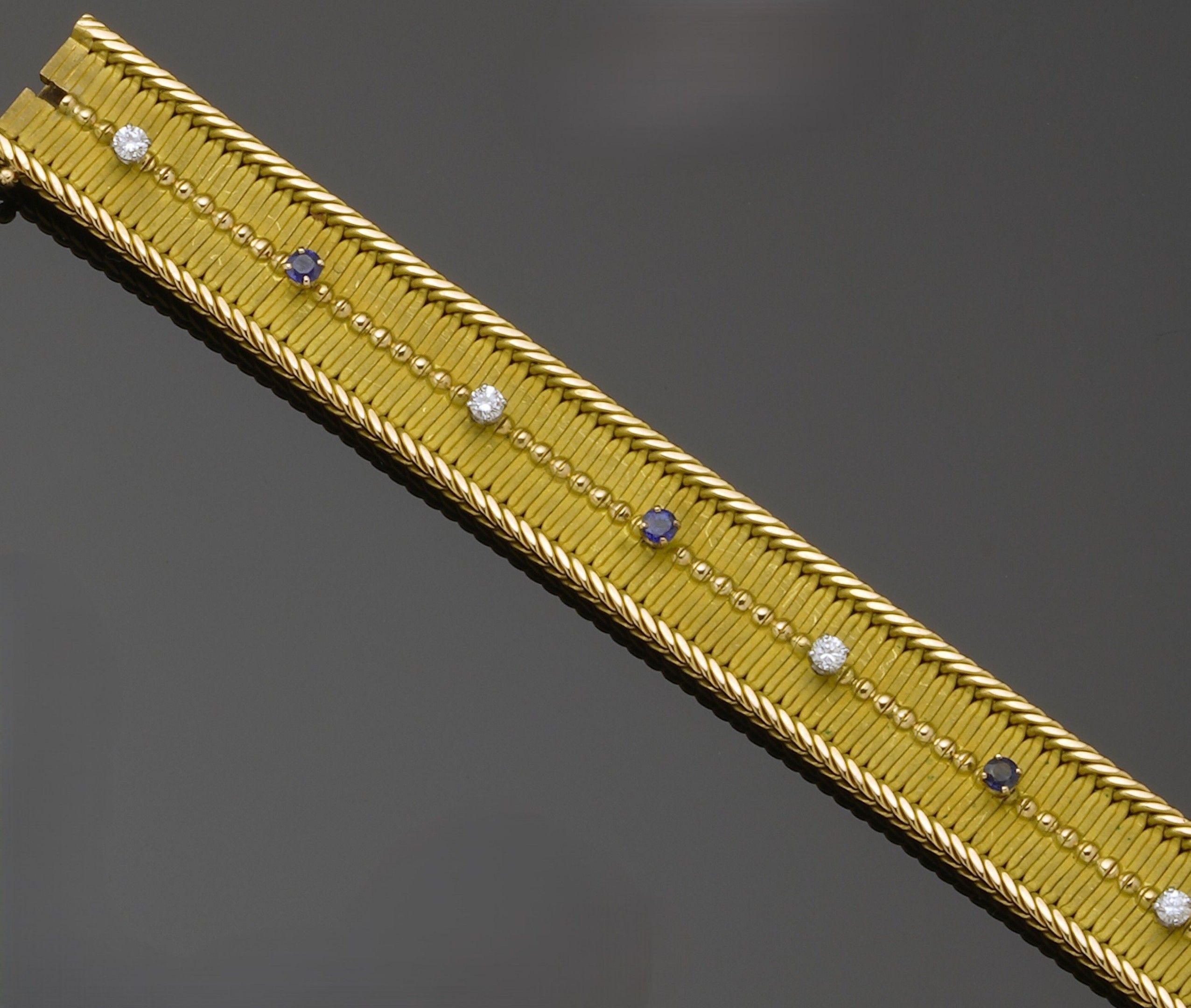 Ribbon bracelet in 18K (750°/°°) yellow gold centred with a line of brilliant-cut diamonds, each approx. 0.40 ct, alternating with round sapphires (one small chip, stones possibly heat-treated)