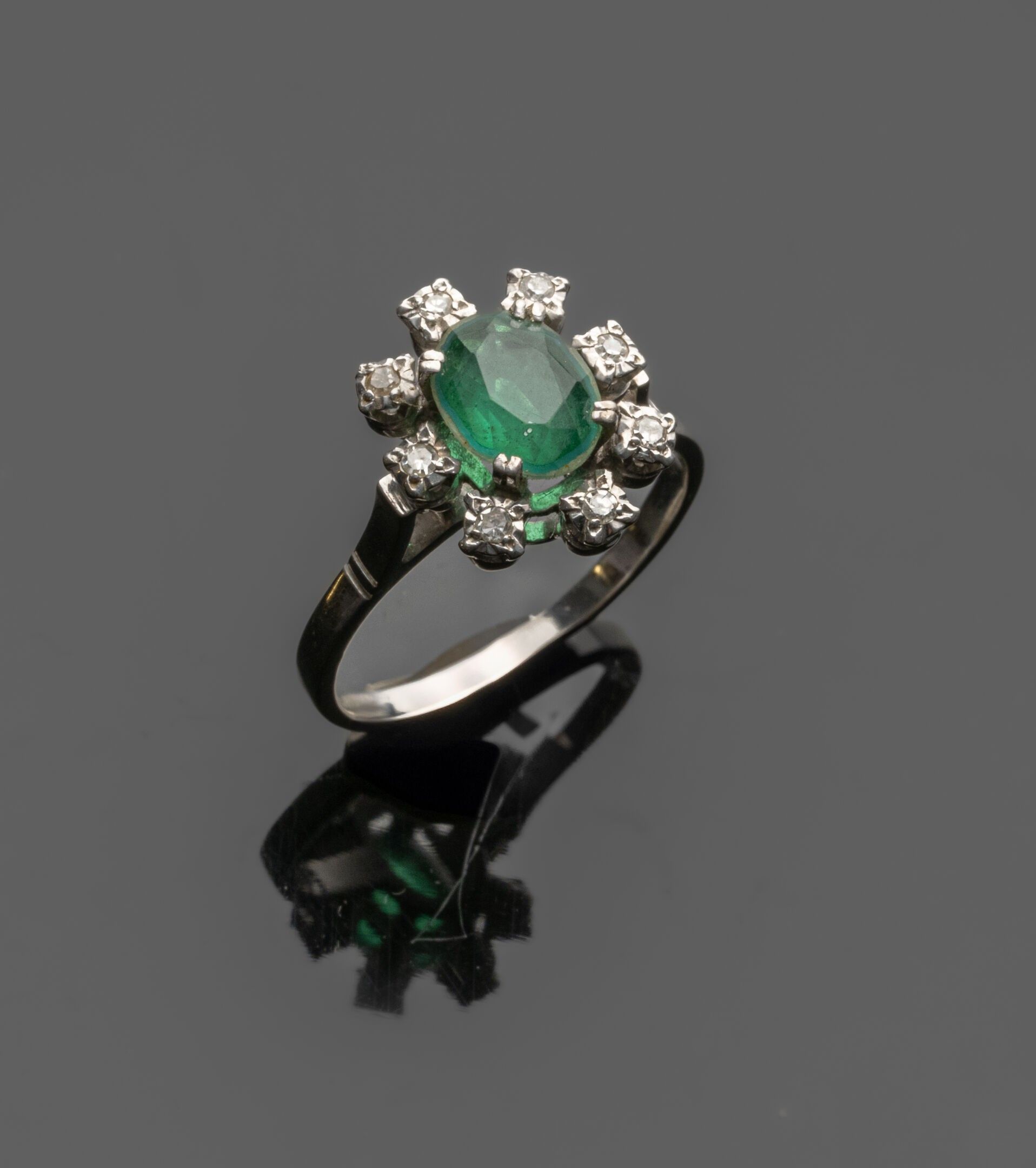 Flower" ring in 18K (750°/°°) white gold, centred on a green oval doublet in a setting of 8x8 small diamonds