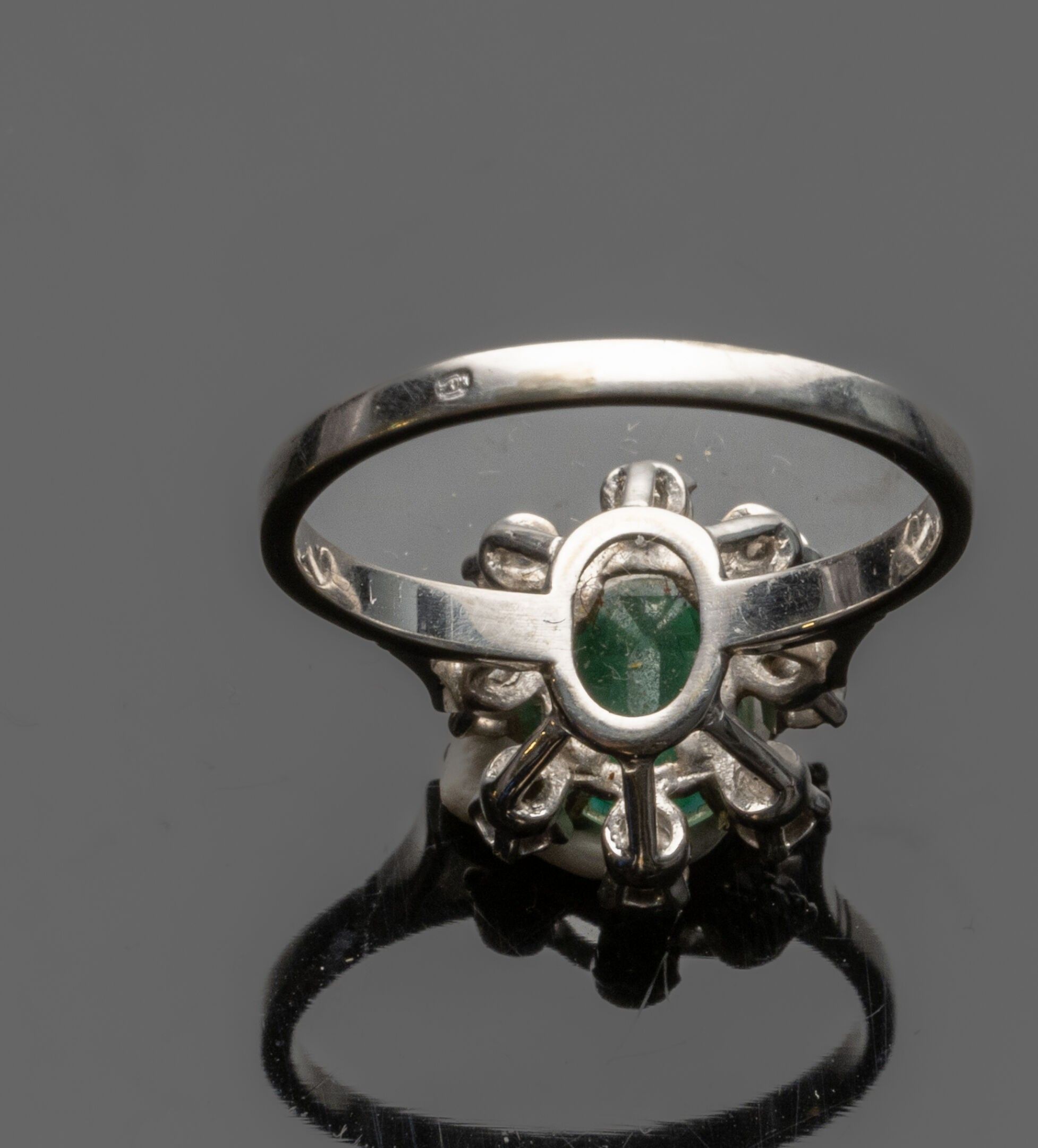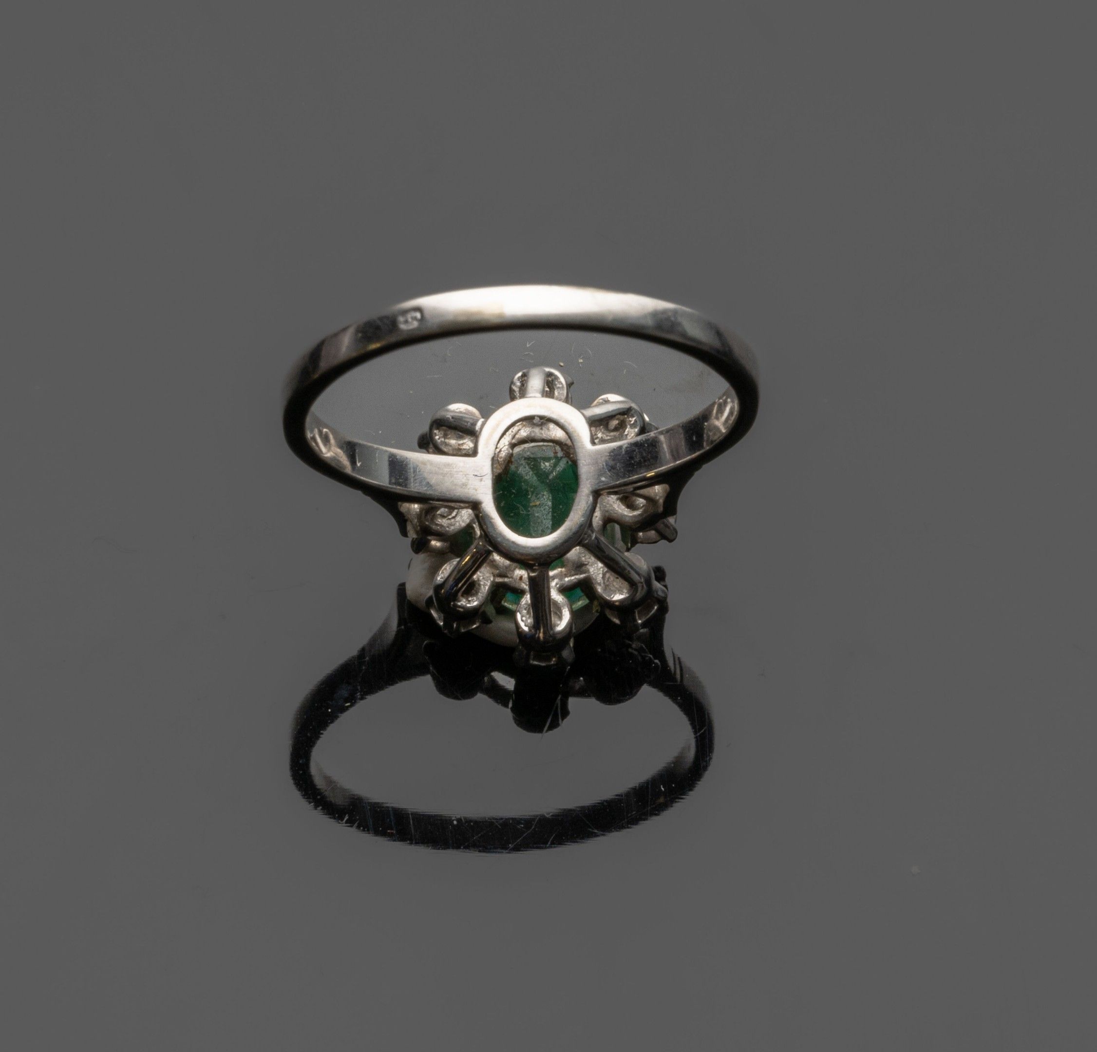 Flower" ring in 18K (750°/°°) white gold, centred on a green…