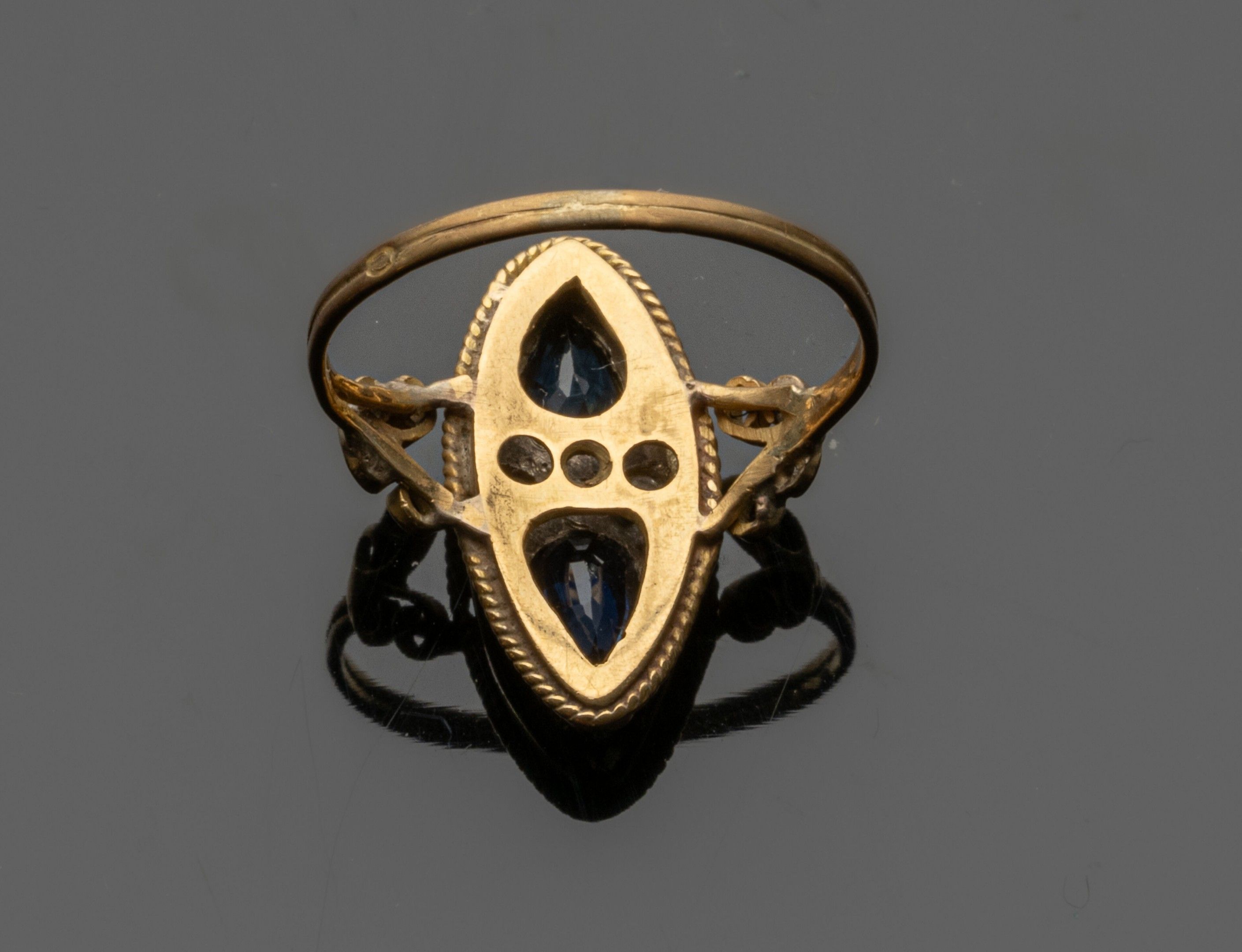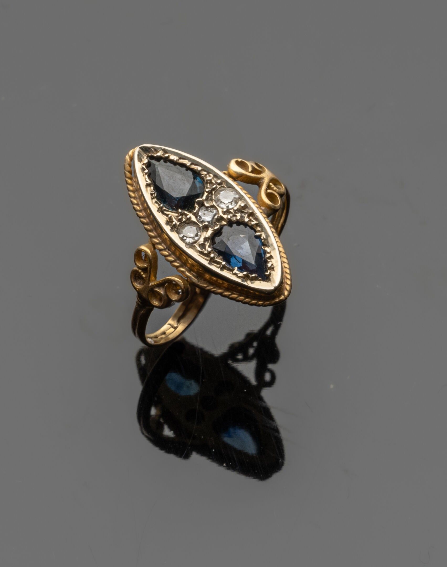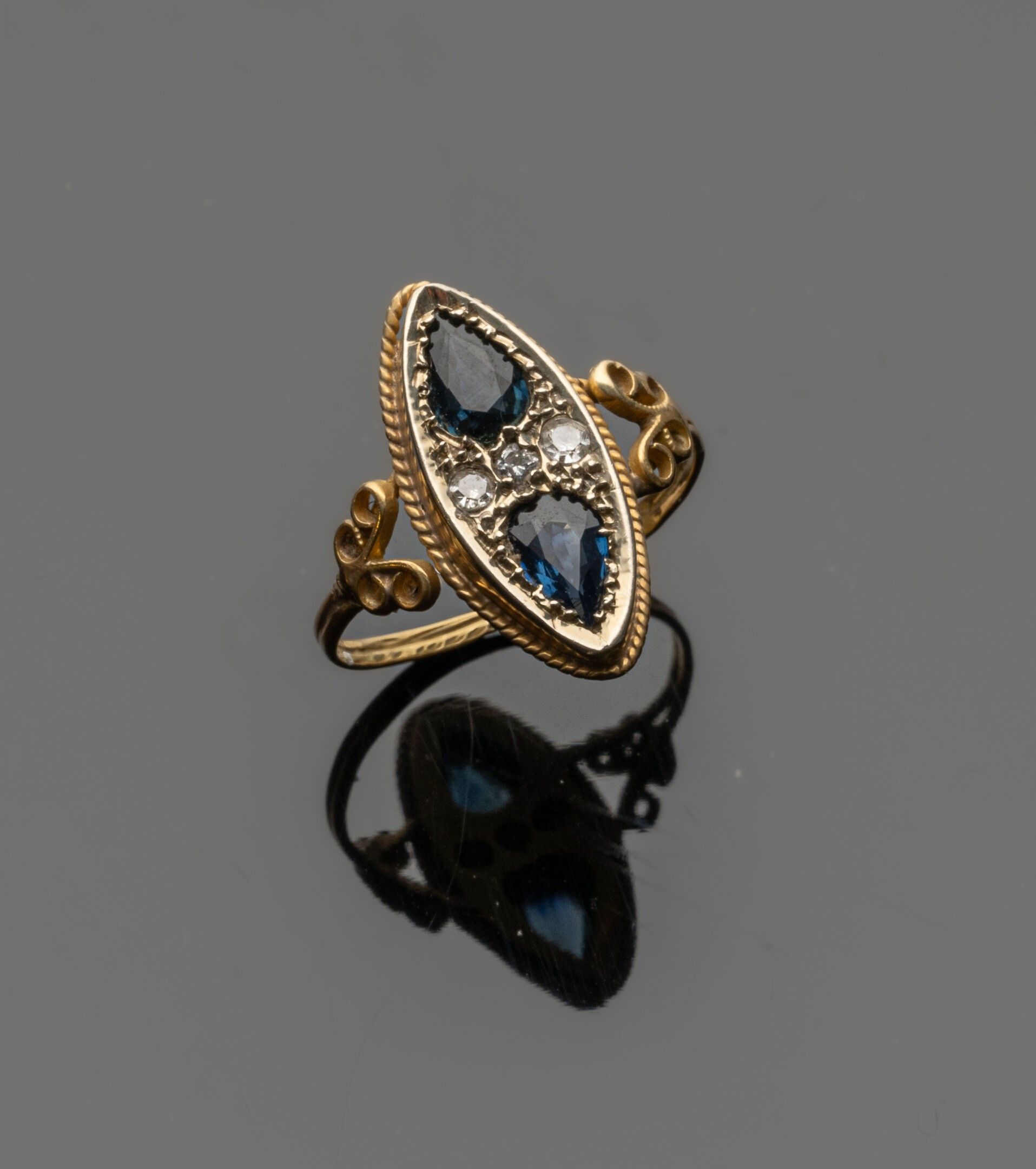 Ring in 18K (750°/°°) two-tone gold, the openwork scrolled attachments hold a marquise-shaped plate set with two pear-cut sapphires (possibly heat-treated stones) separated by 3 brilliant-cut 8x8 diamonds (tiny chips).