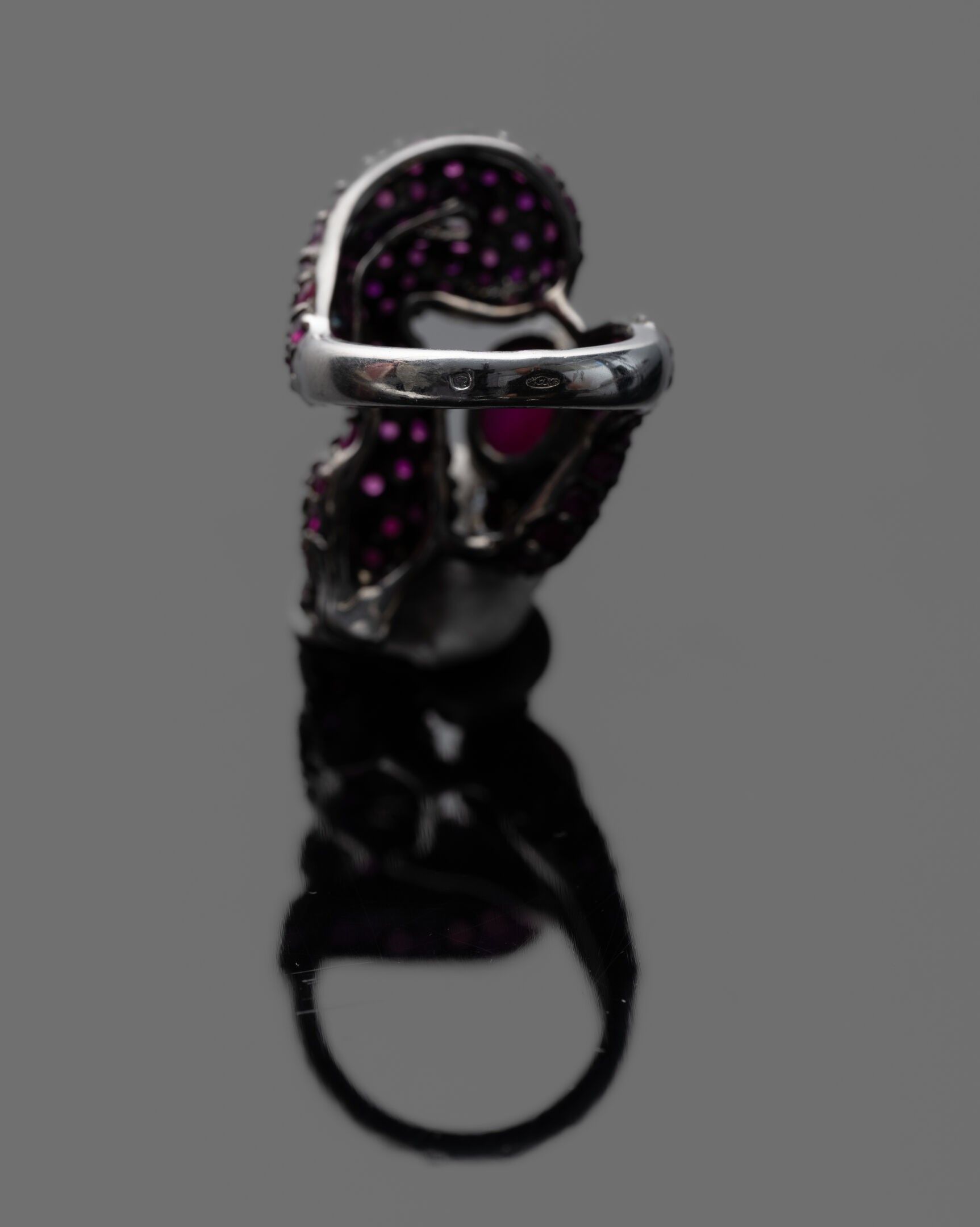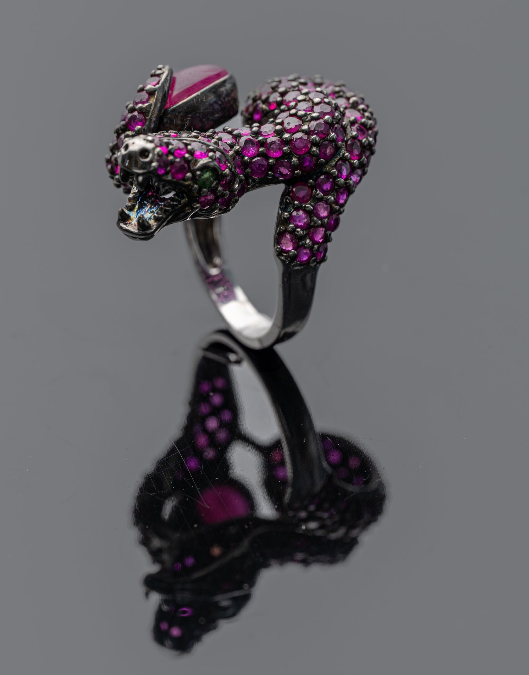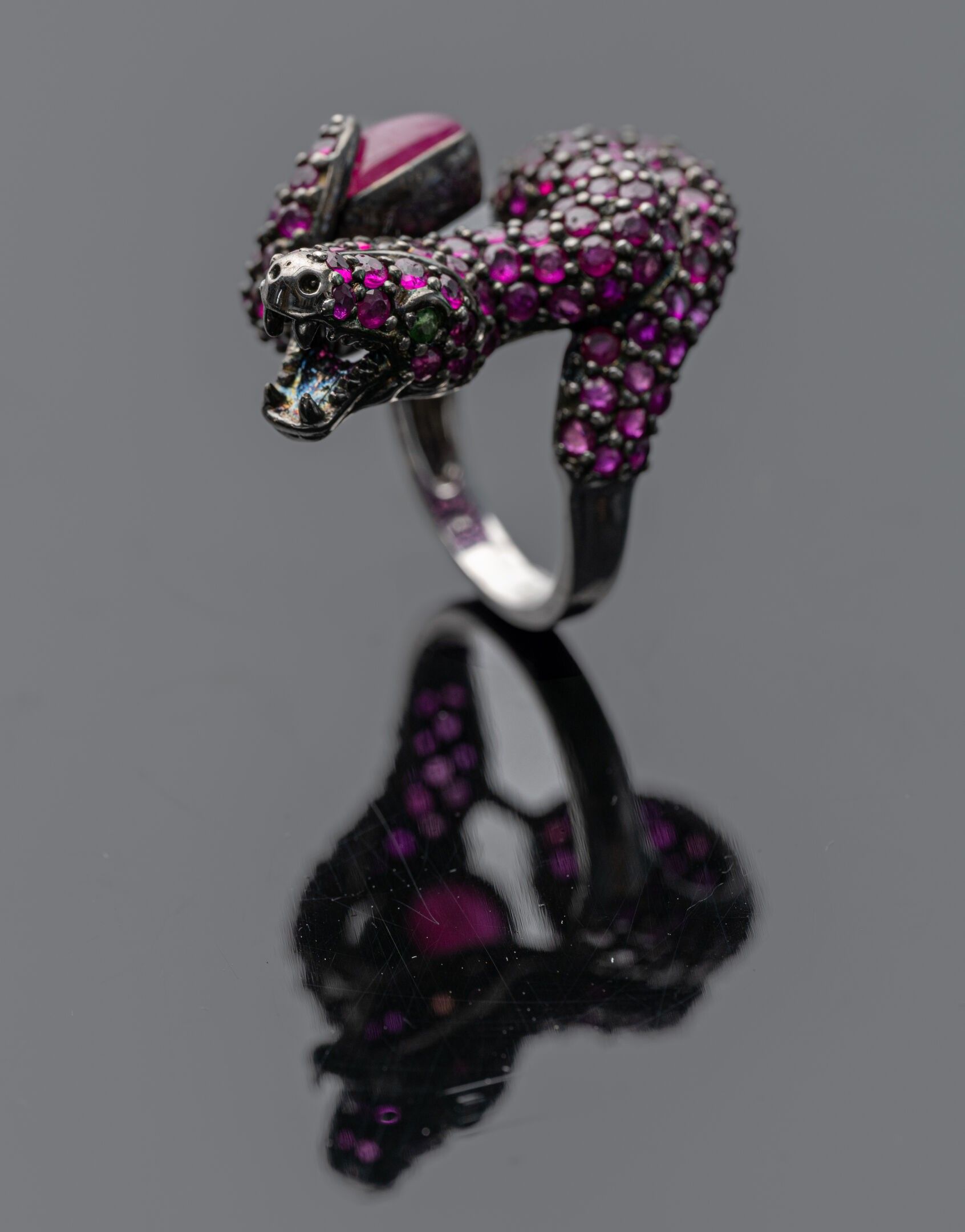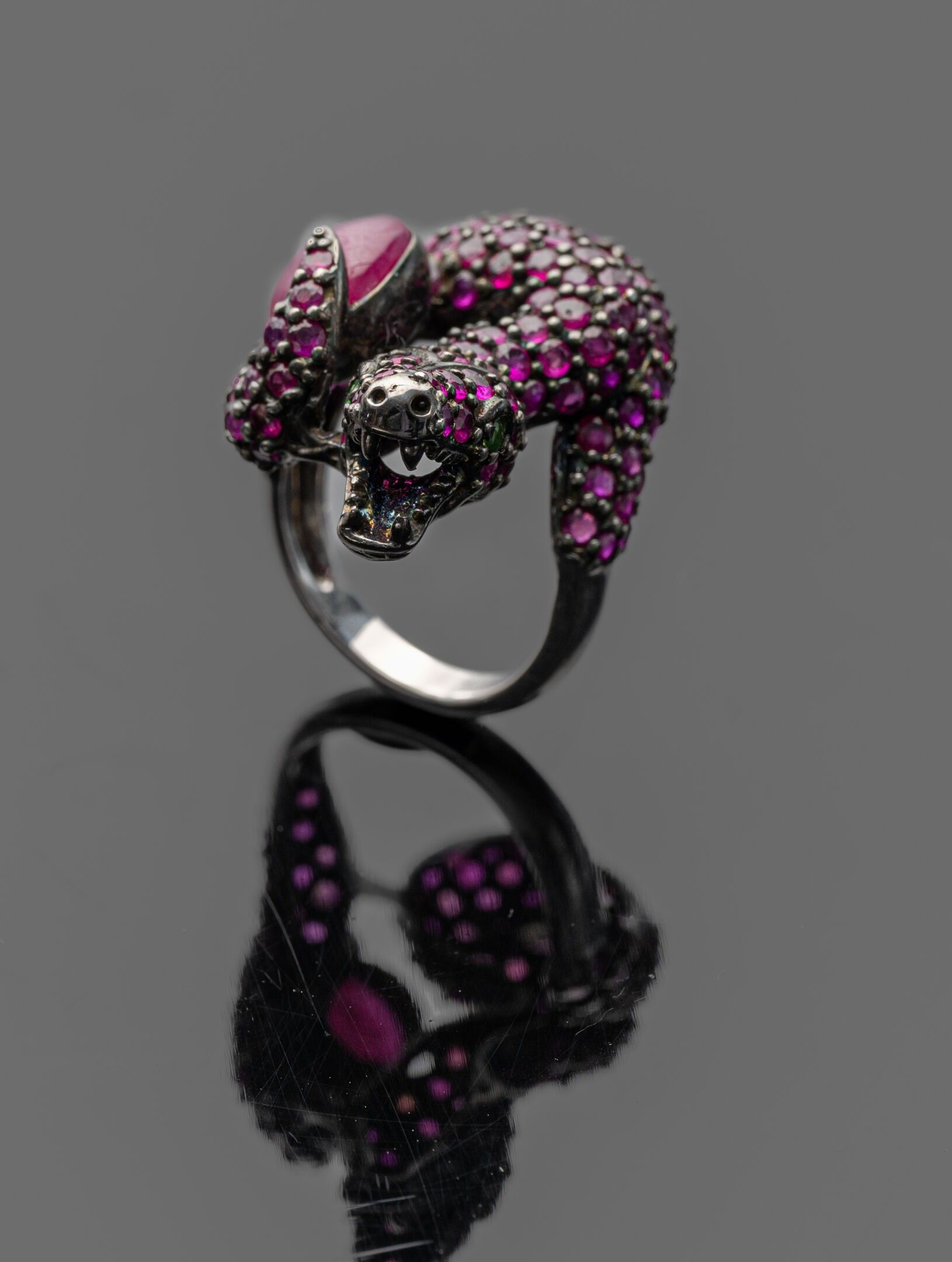 Ring in silver (800°/°°), including blackened, featuring a snake paved with round rubies, its eyes set with tsavorite garnets, it holds an oval ruby cabochon. Stones probably treated, some slight chips and scratches.