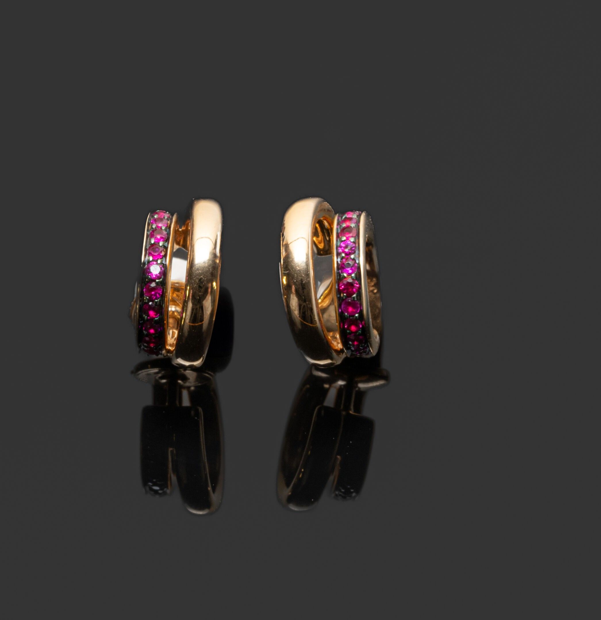 Pair of earrings in 18K (750°/°°) yellow and black gold, "Together" collection, forming two bands, one set with round rubies. ALPA clasp system. Height: approx. 14.5 mm. Signed and numbered